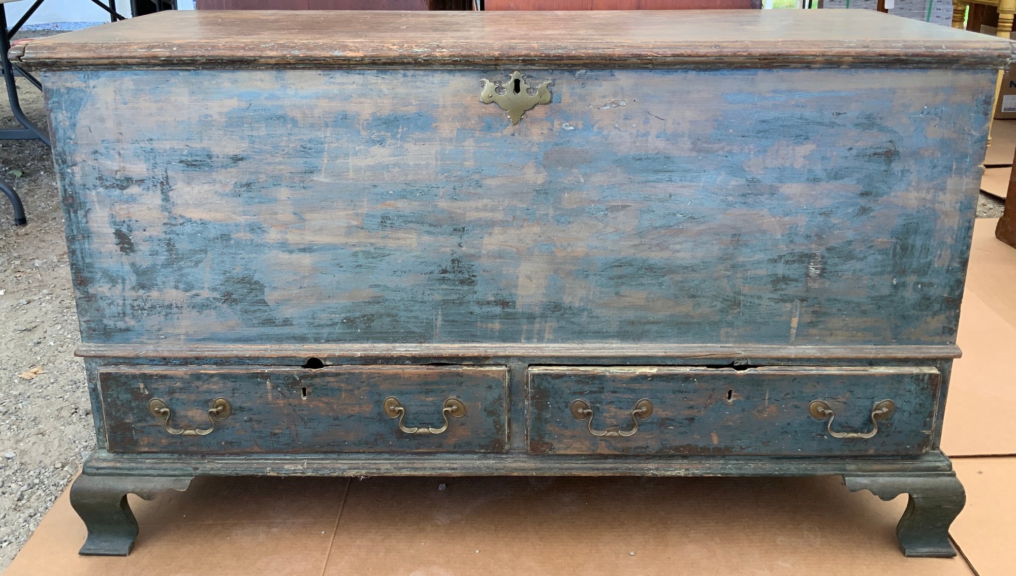 One 50”x22”x29.25” early 19th-century Chippendale-style blanket chest. Two dovetail drawers, dovetail back panel, blanket box opens on strap hinges, distressed blue paint finish interior till, French feet.