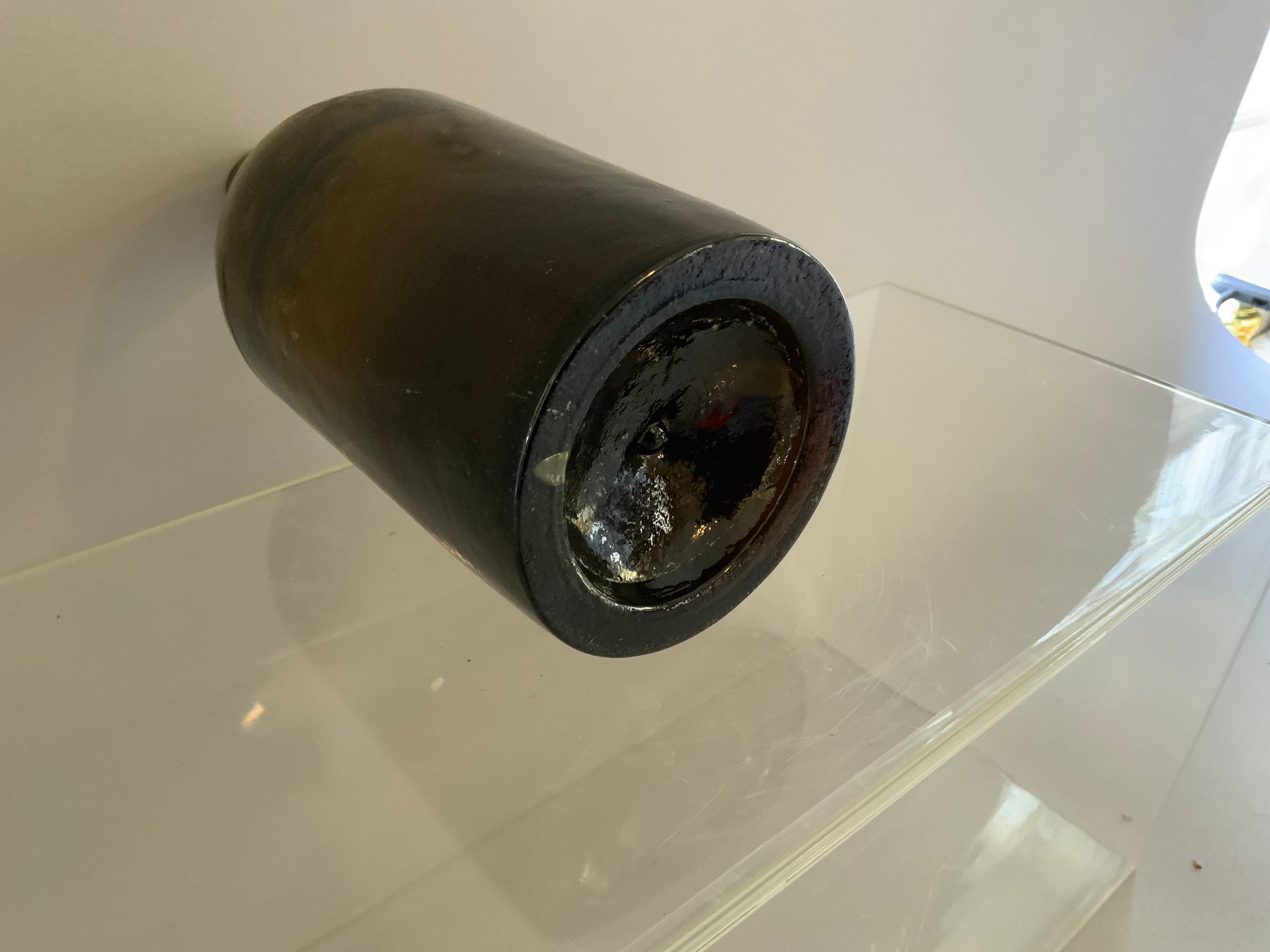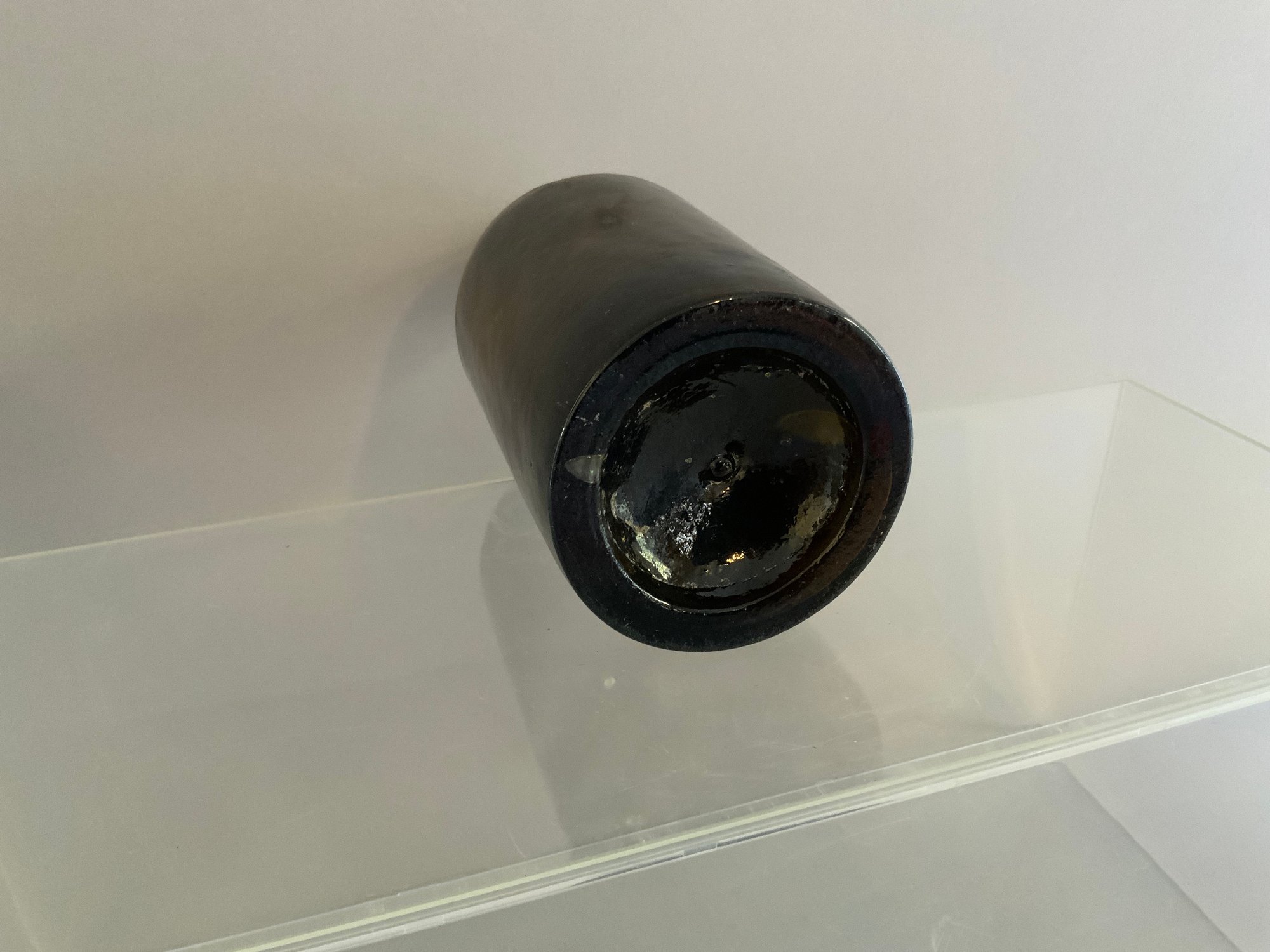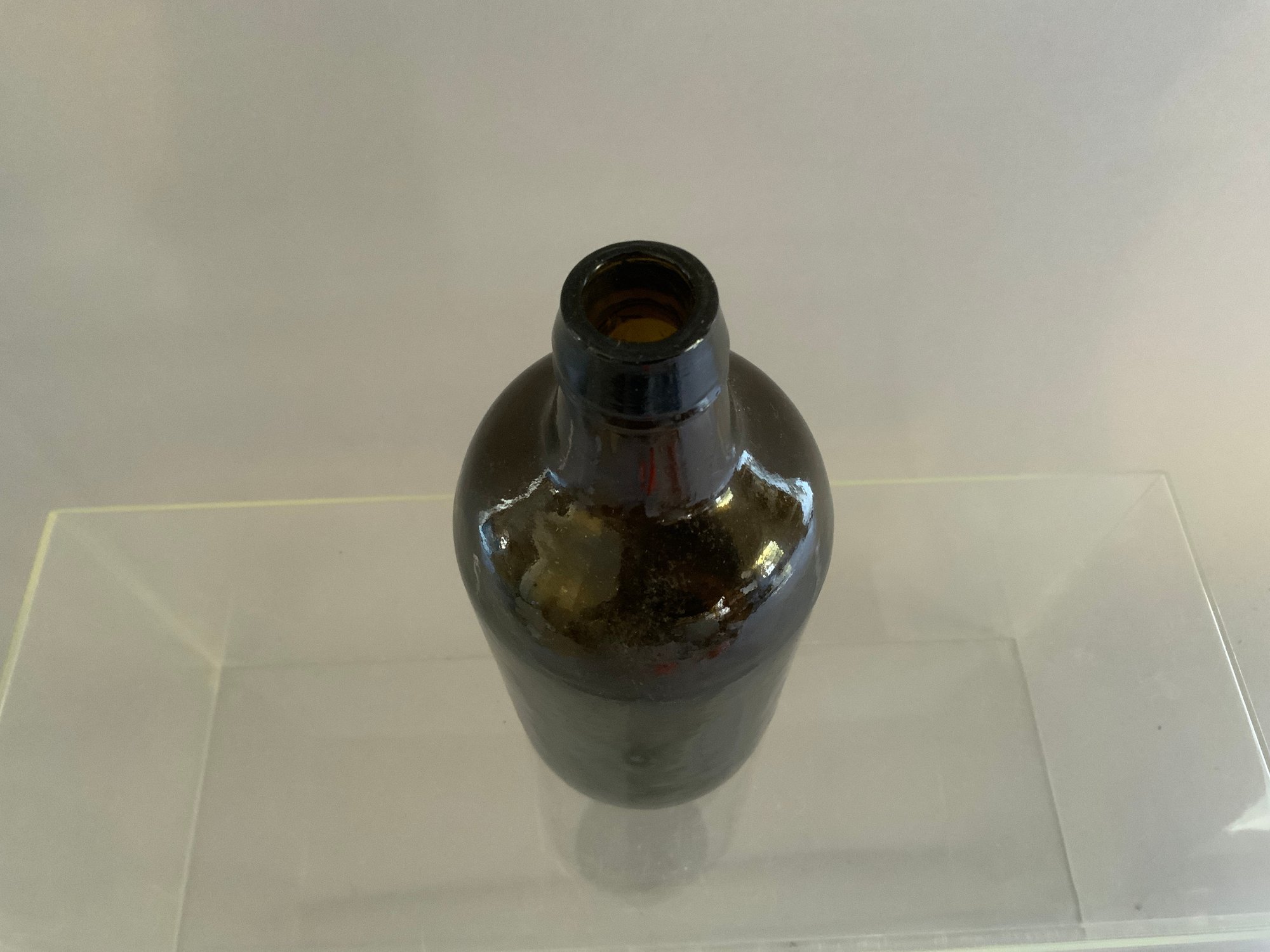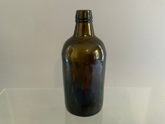 One 7.5”x3.5” Pint Stoddard mineral water bottle. Dark amber color, hand-blown. Good condition. Three piece mold, push up base with dot. Multiple bubbles on sides.