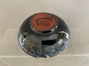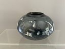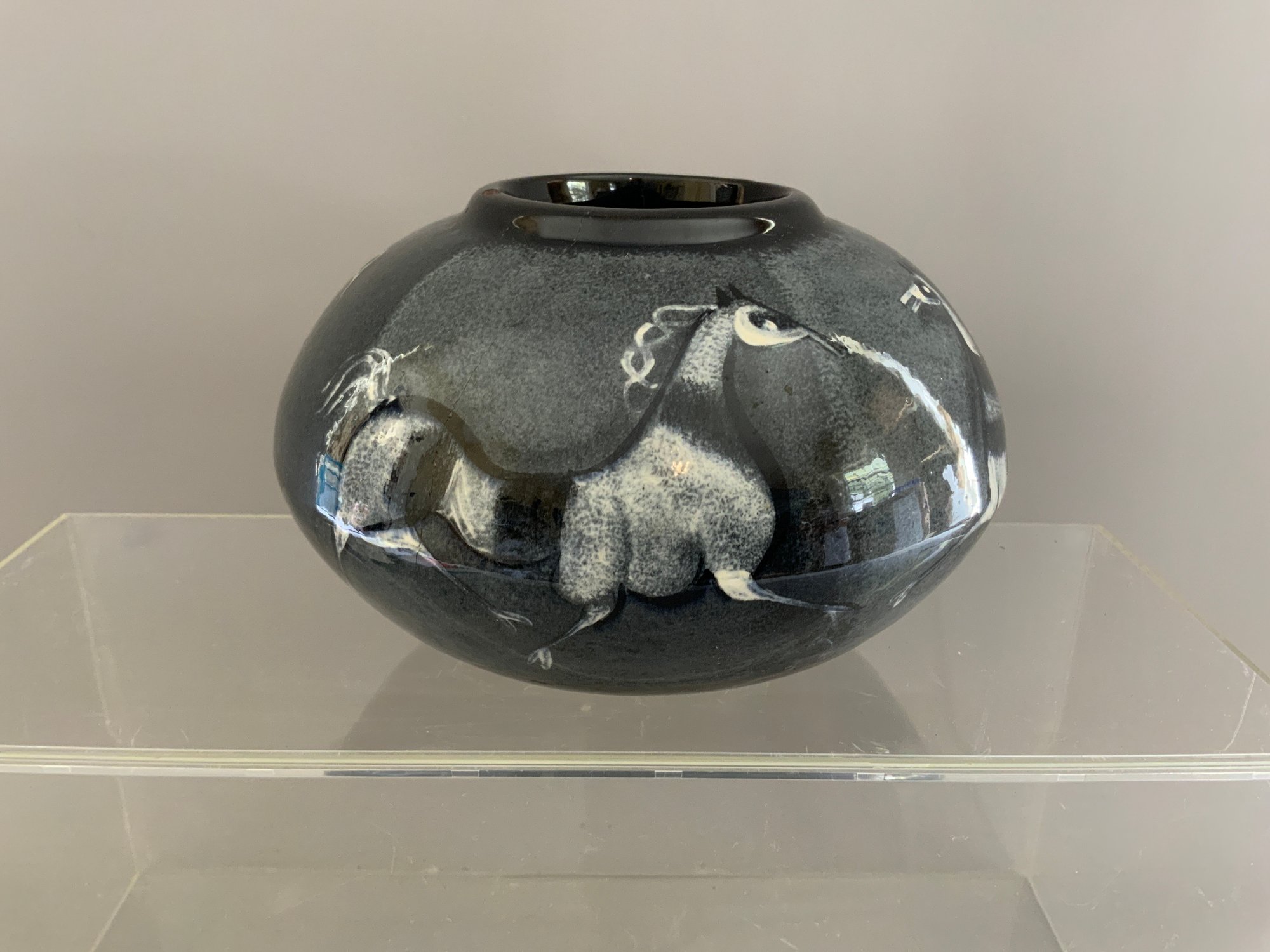 One 7.5”x5” Polia Pillin rounded, glossy black ceramic vase is adorned with a captivating white abstract galloping horses, small chip on top opening, hairline on top, “Pillin” on bottom.