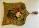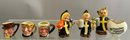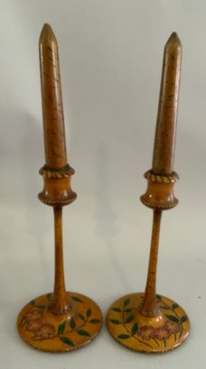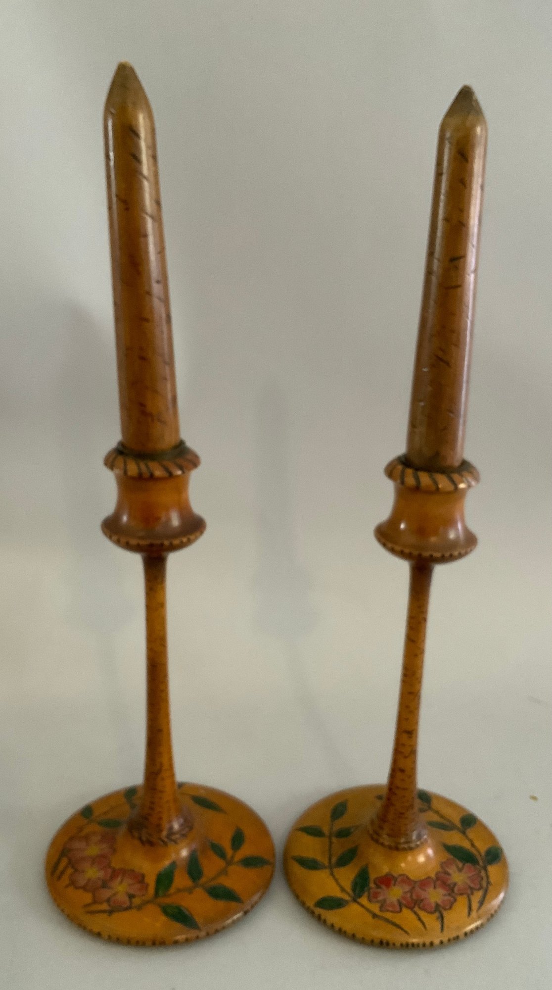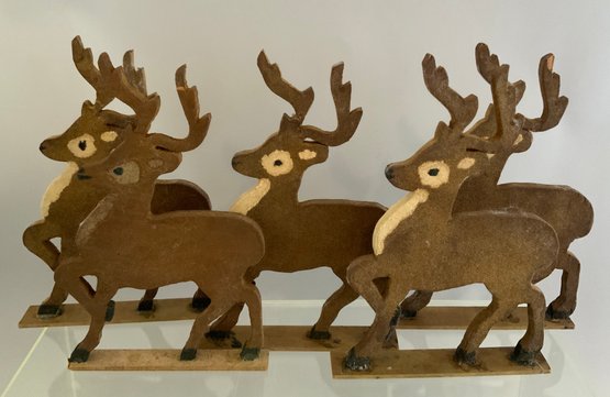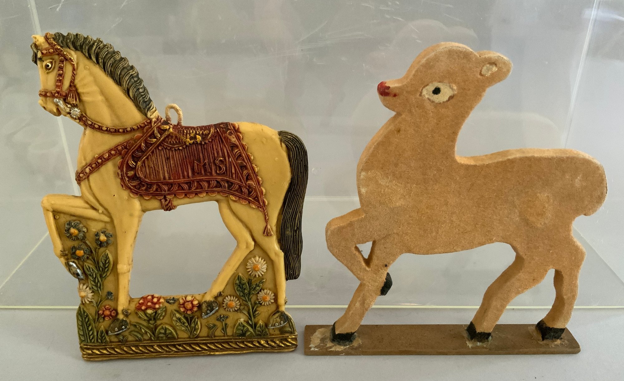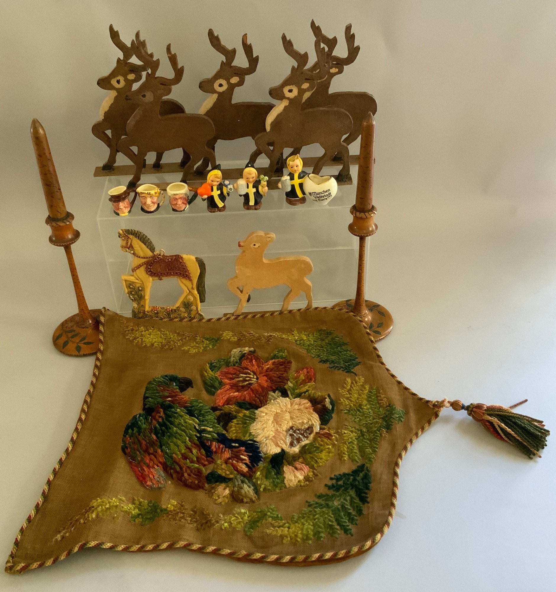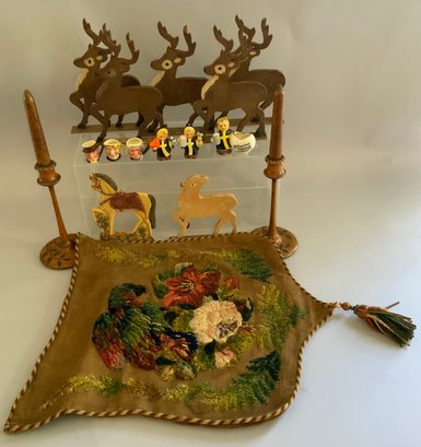 Opportunity box lot, chenille embroidered pillow cover, candlesticks, deer, 6 – wood deer ornaments, miniature toby mugs, etc.