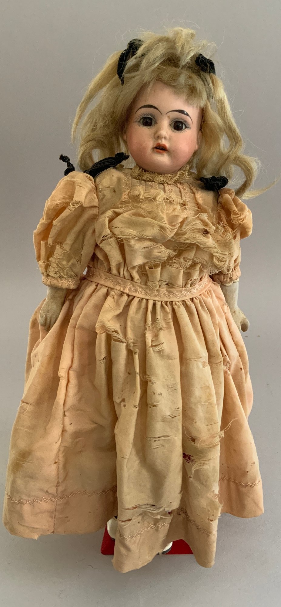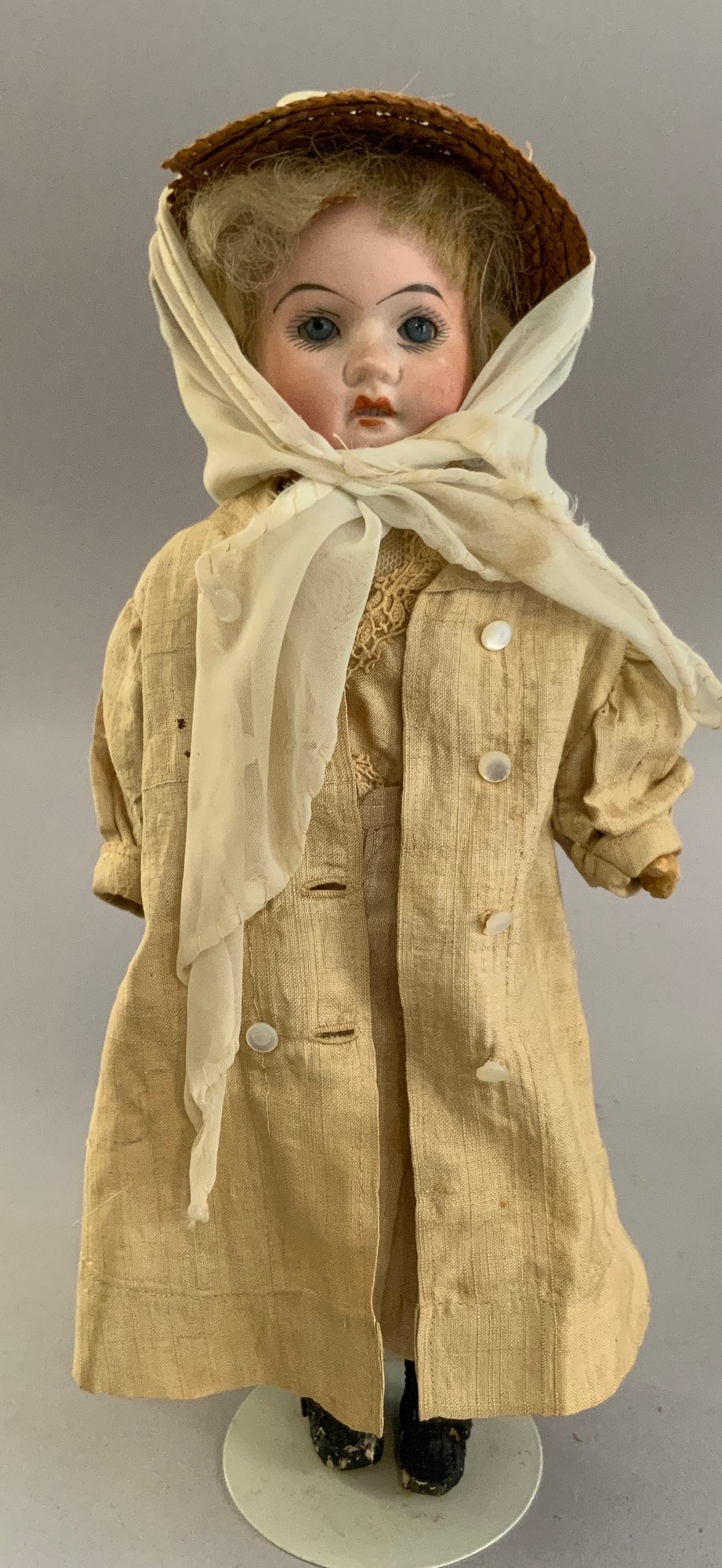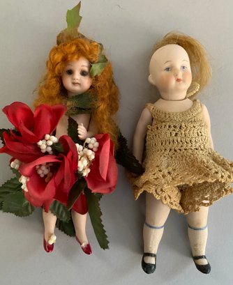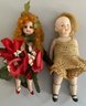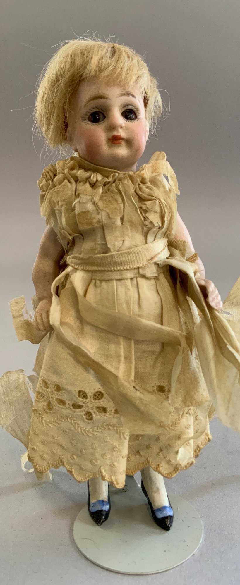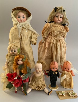 Opportunity box lot, 1 – 11” Heinrich Handwerck, blue glass sleep eyes, OM with teeth, compo body, linen touring suit, 1 - 12” bisque head AM 1890, rough outfit, 2 – celluloid cake toppers, 1 – 6 ½” all bisque, blonde mohair wig, brown glass sleep eyes, melting clothes, 6” all bisque, painted features, crochet outfit, & 1 - 6” all bisque fairy sprite artist doll