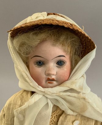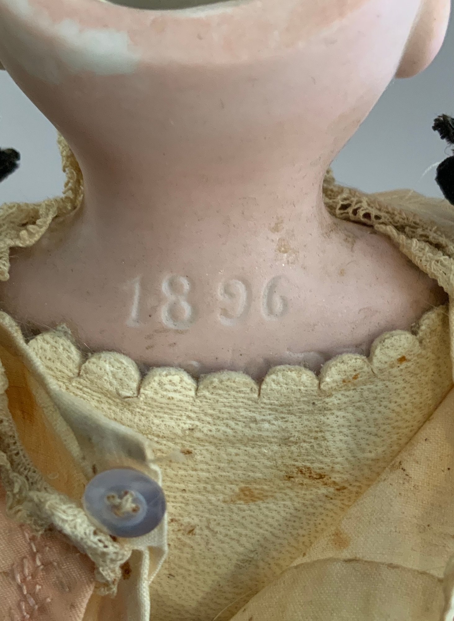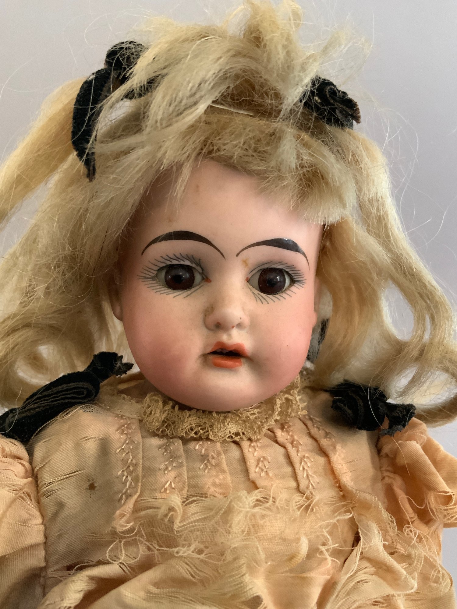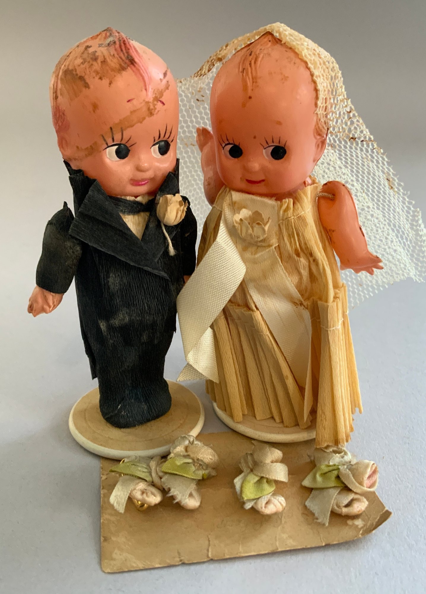 Opportunity box lot, 1 – 11” Heinrich Handwerck, blue glass sleep eyes, OM with teeth, compo body, linen touring suit, 1 - 12” bisque head AM 1890, rough outfit, 2 – celluloid cake toppers, 1 – 6 ½” all bisque, blonde mohair wig, brown glass sleep eyes, melting clothes, 6” all bisque, painted features, crochet outfit, & 1 - 6” all bisque fairy sprite artist doll