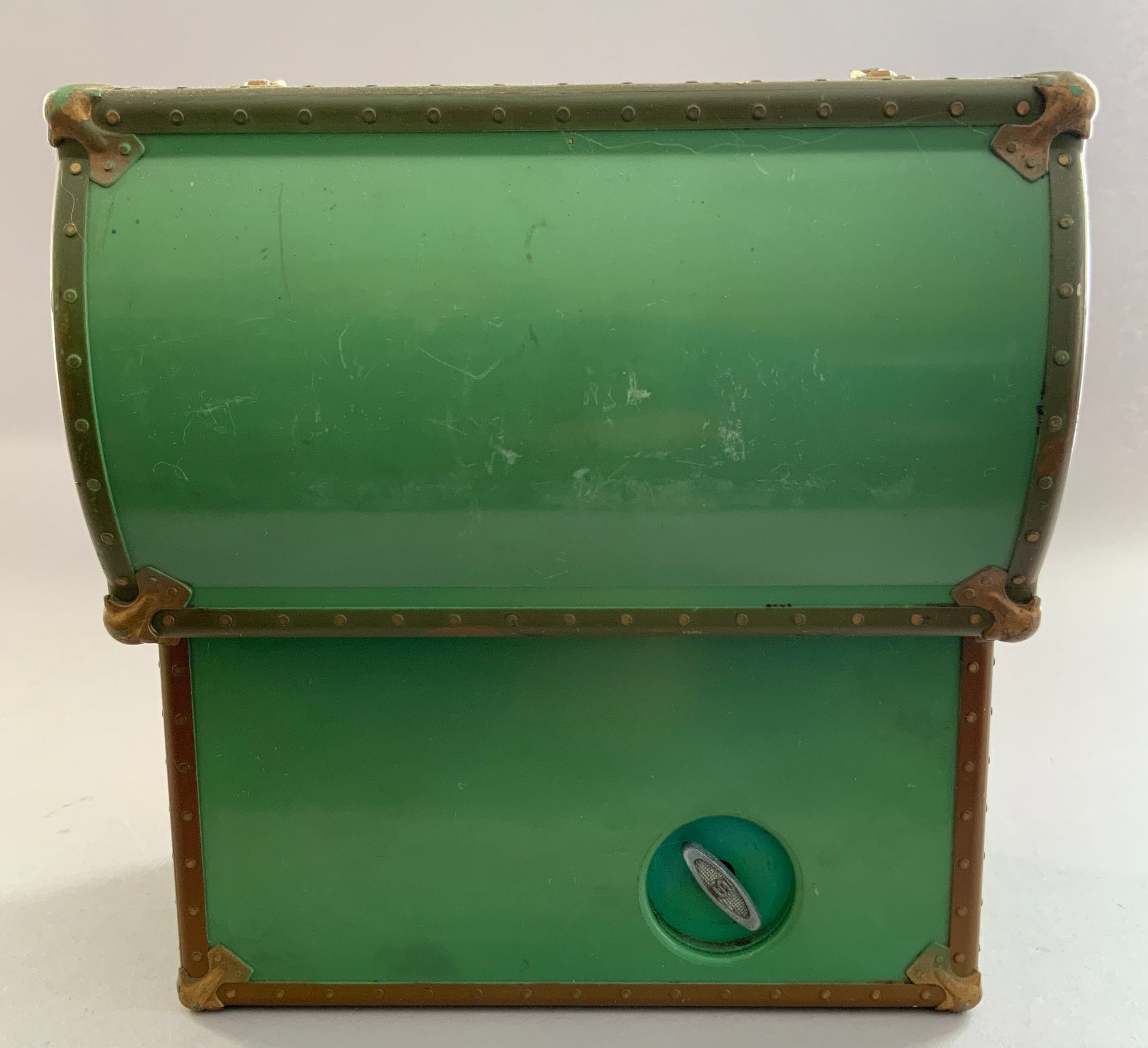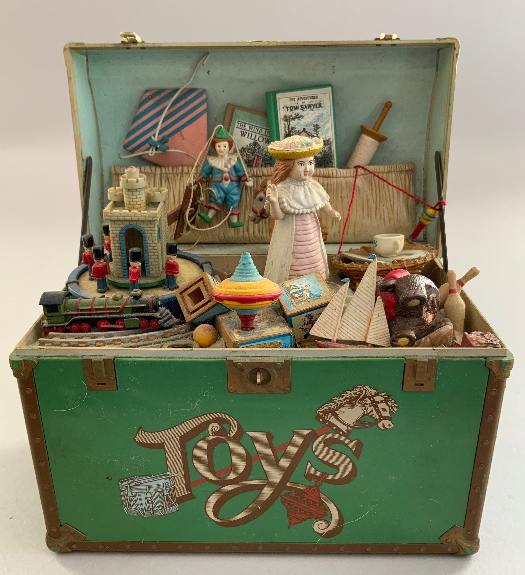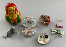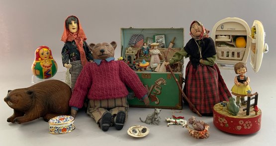 Opportunity Box Lot, 2 – 9 ½” cloth dolls (women), 1 – 10 ½” hand carved wood beaver by Kadian Crafts, toy chest music box, Refrigerator sewing kit, etc.