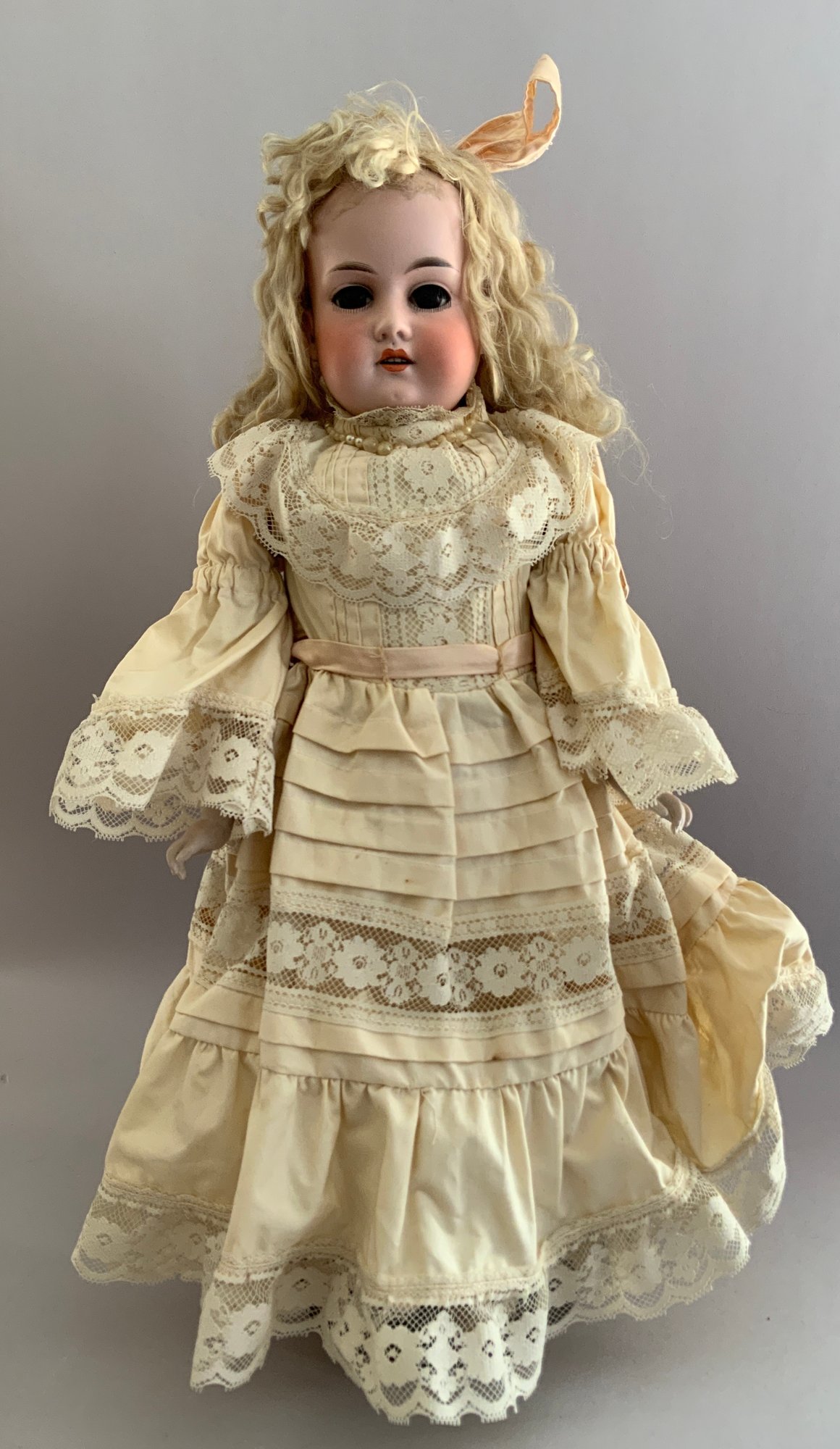 Opportunity Box Lot: 1 - 22” AM 370, brown glass eyes, OM w/ teeth, blonde mohair wig, kid body w/ bisque arms, white outfit, 1 -13 ½” Lenci type toddler painted features, 1- 17” shoulder head 5, brown glass eyes, OM with teeth, kid body with bisque limbs, faded white dress (hairline to front shoulder plate, 1 – 14” bisque artist doll 1973 (as is, eyes loose in head), 1- 5 ½” fur covered panda bear, & 1 – 4” fur covered seal