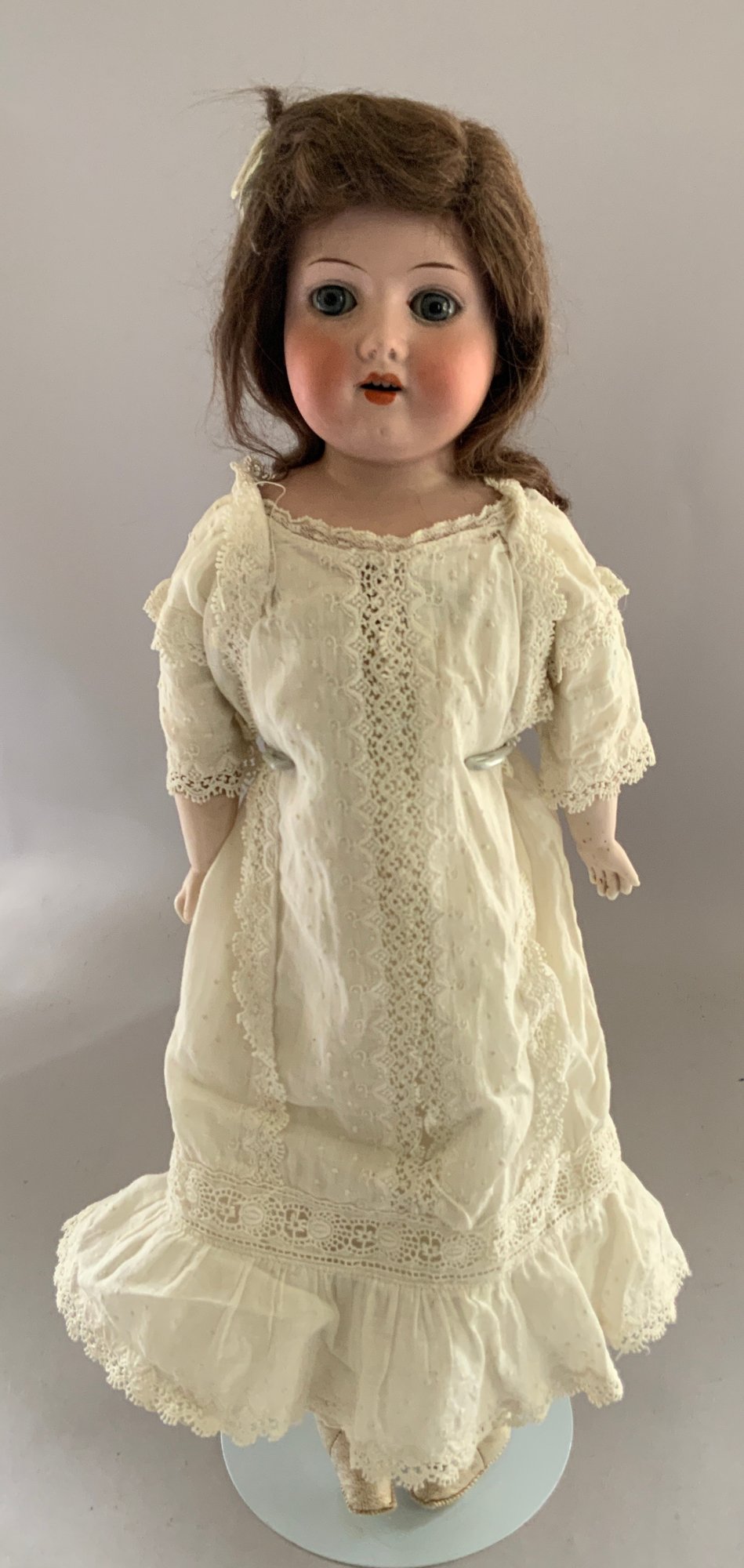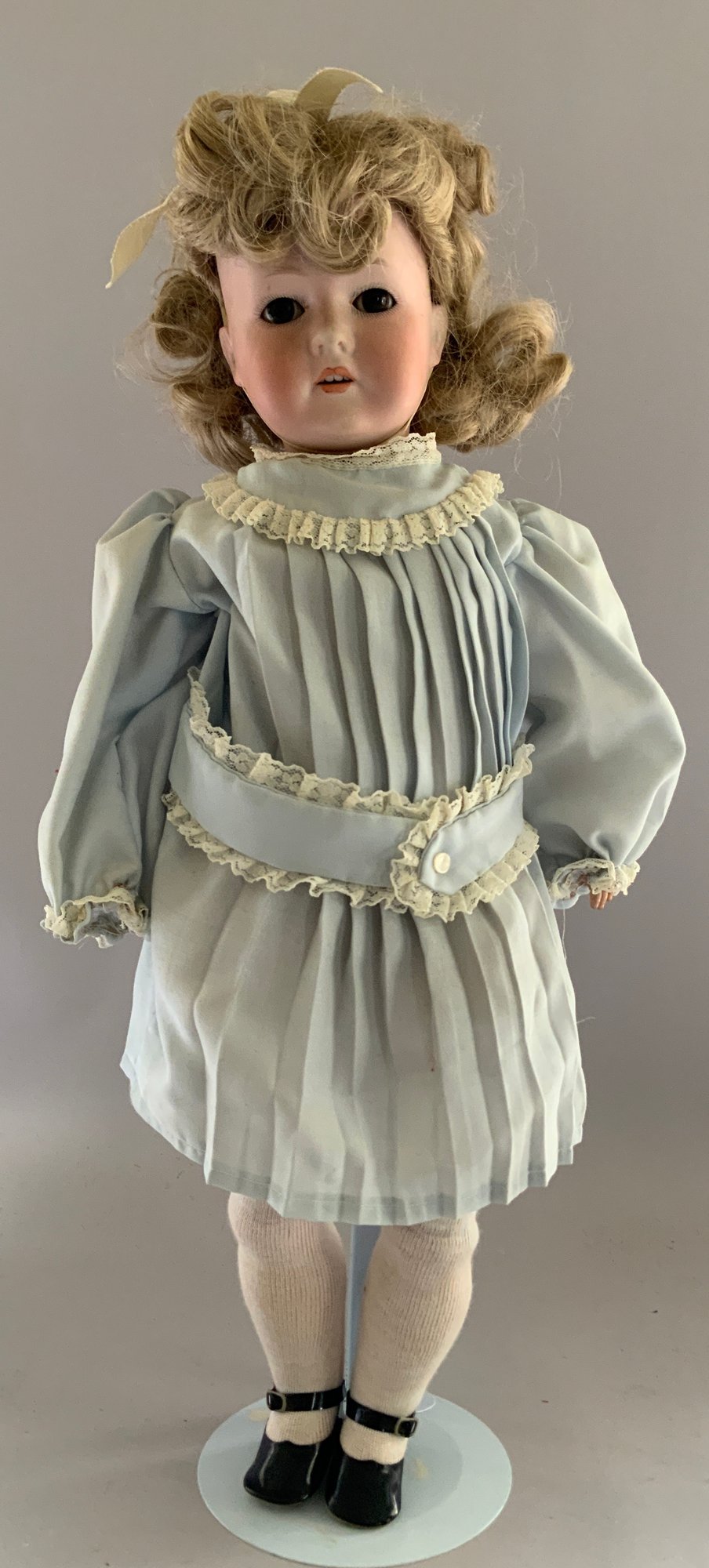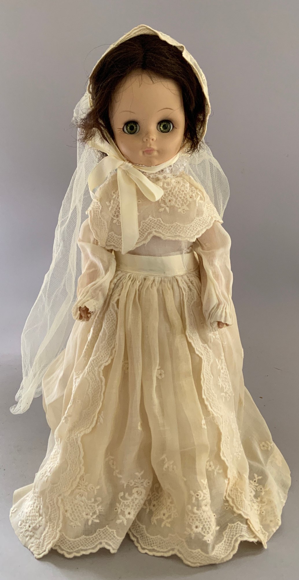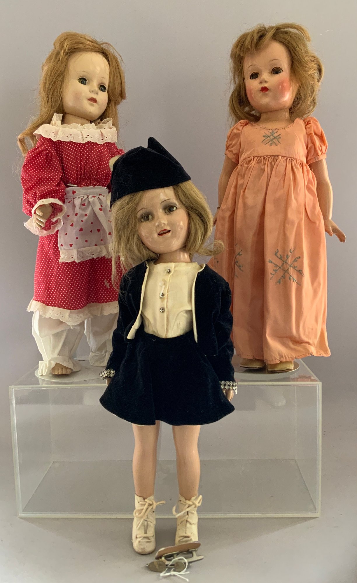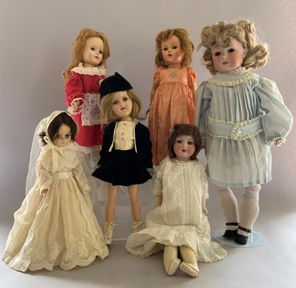 Opportunity Box Lot of Dolls: 23” CM Bergman 116 Brown sleep eyes, OM w/ teeth; 18” Hard Plastic Effanbee, peach taffeta dress (as-is);14” Effanbee Vinyl, white dress 1966; 18” Hard Plastic Walker (as-is); 18” Mme. Alexander, Hard Plastic, Sonja Henie in Skater’s costume (as-is); 19” AM 370 S/H, sleep blue eyes, O/M w/ teeth, HH wig Gusseted Kid body, bisque arms, (as-is)