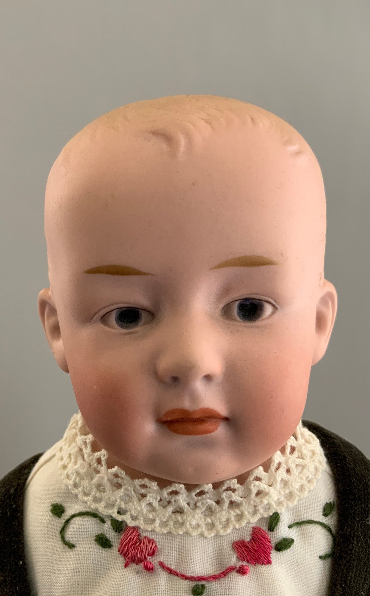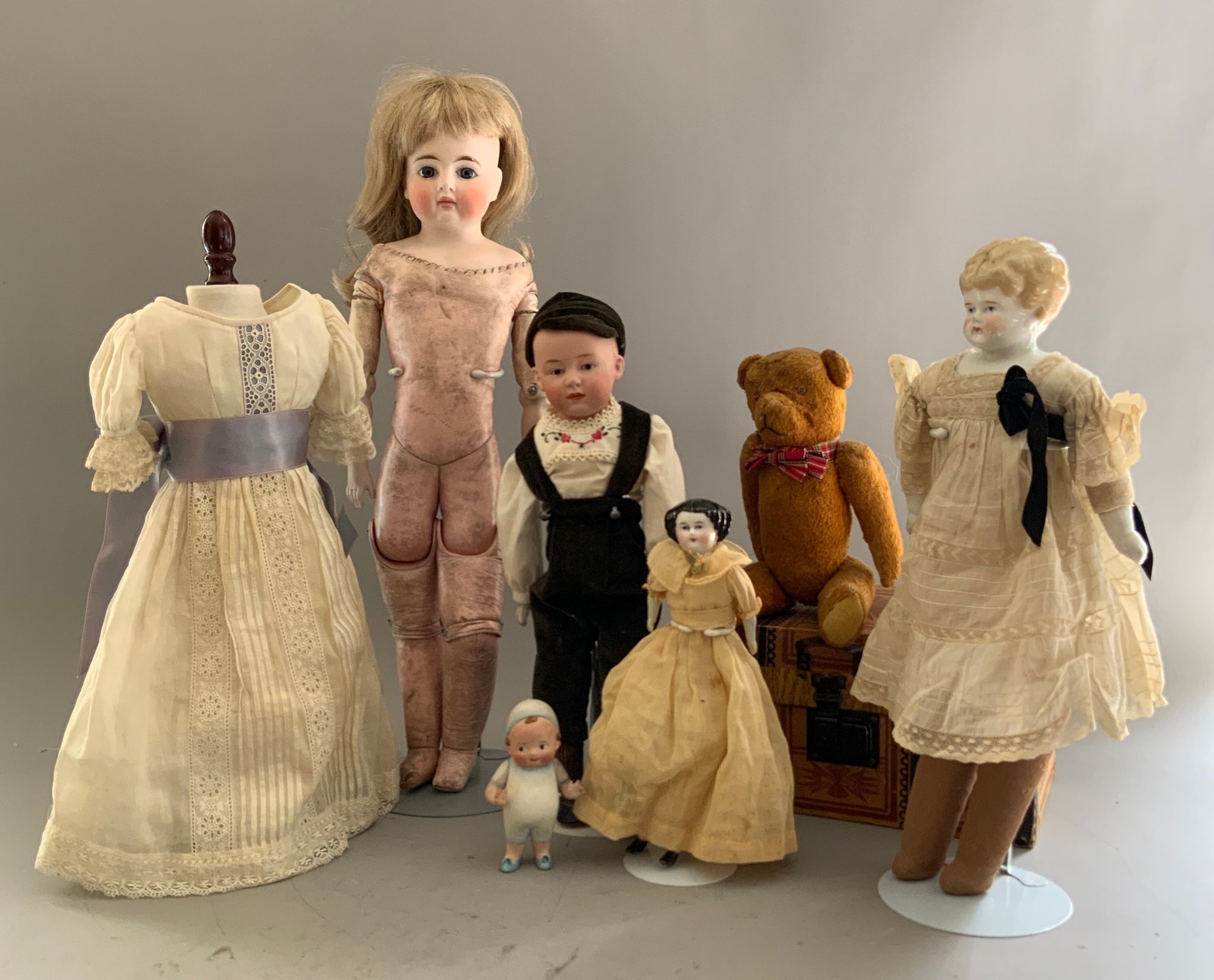 Opportunity lot, 1 - 14” Bisque shoulder head incised Germany 3, painted features, CM, sculpted wispy hair, cloth body with bisque arms, dark green velvet pants, 1- 20” Bisque dome top shoulder head, blue glass eyes, CM, blonde HH wig, kid body with bisque arms, (nose & right ear spec), white dress (light stains) Lot of 3 – 1 – 10” long paper covered lift top doll trunk with small black hair china doll & accessories, 1 – 15” blond hair low brow china, cloth body, & 1 – 11 ½” mohair teddy bear (heavy wear & stains)