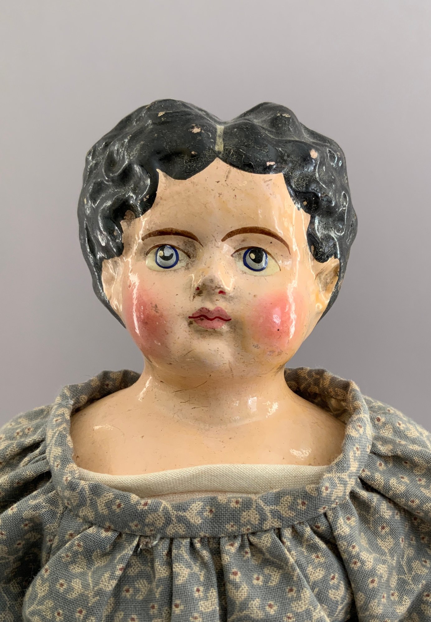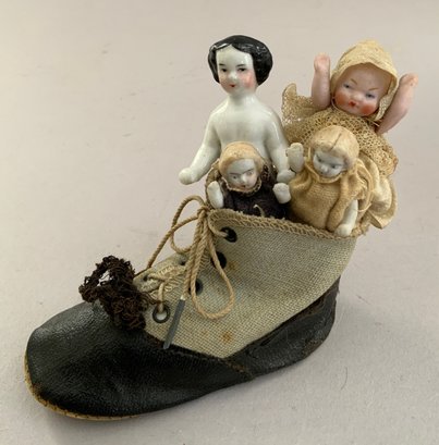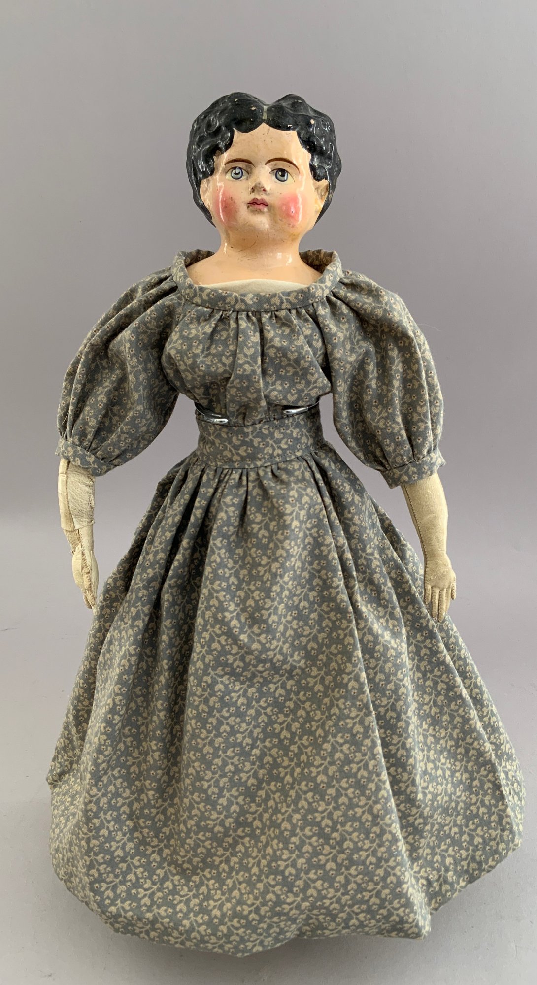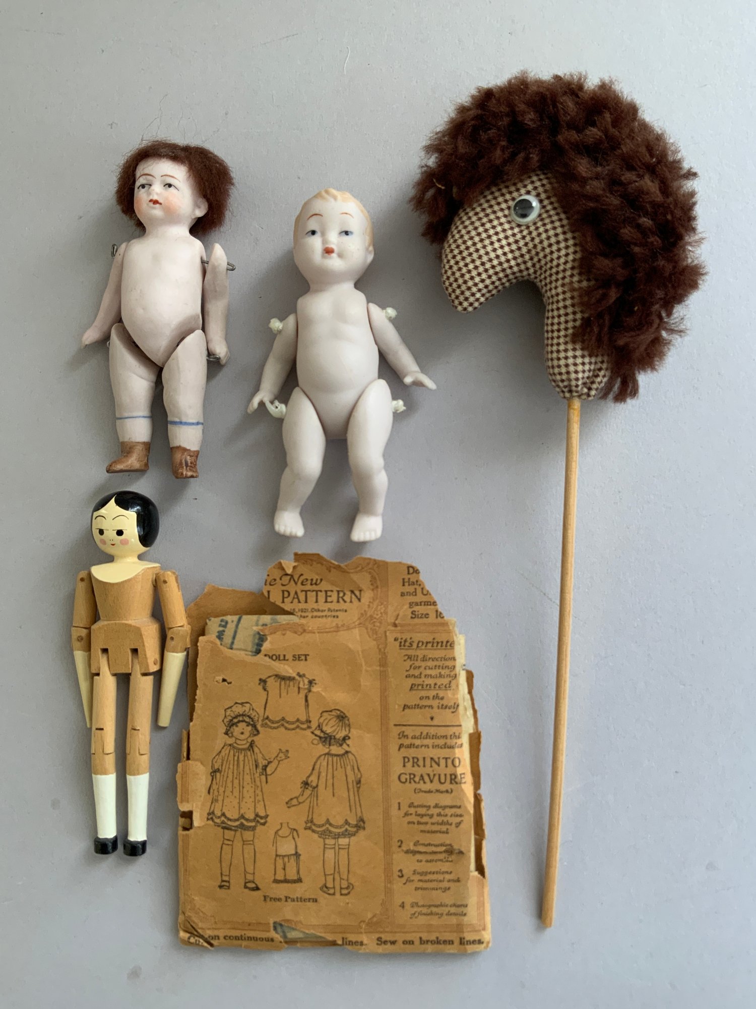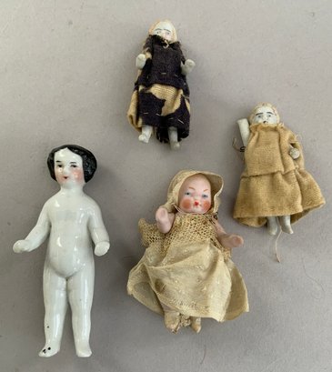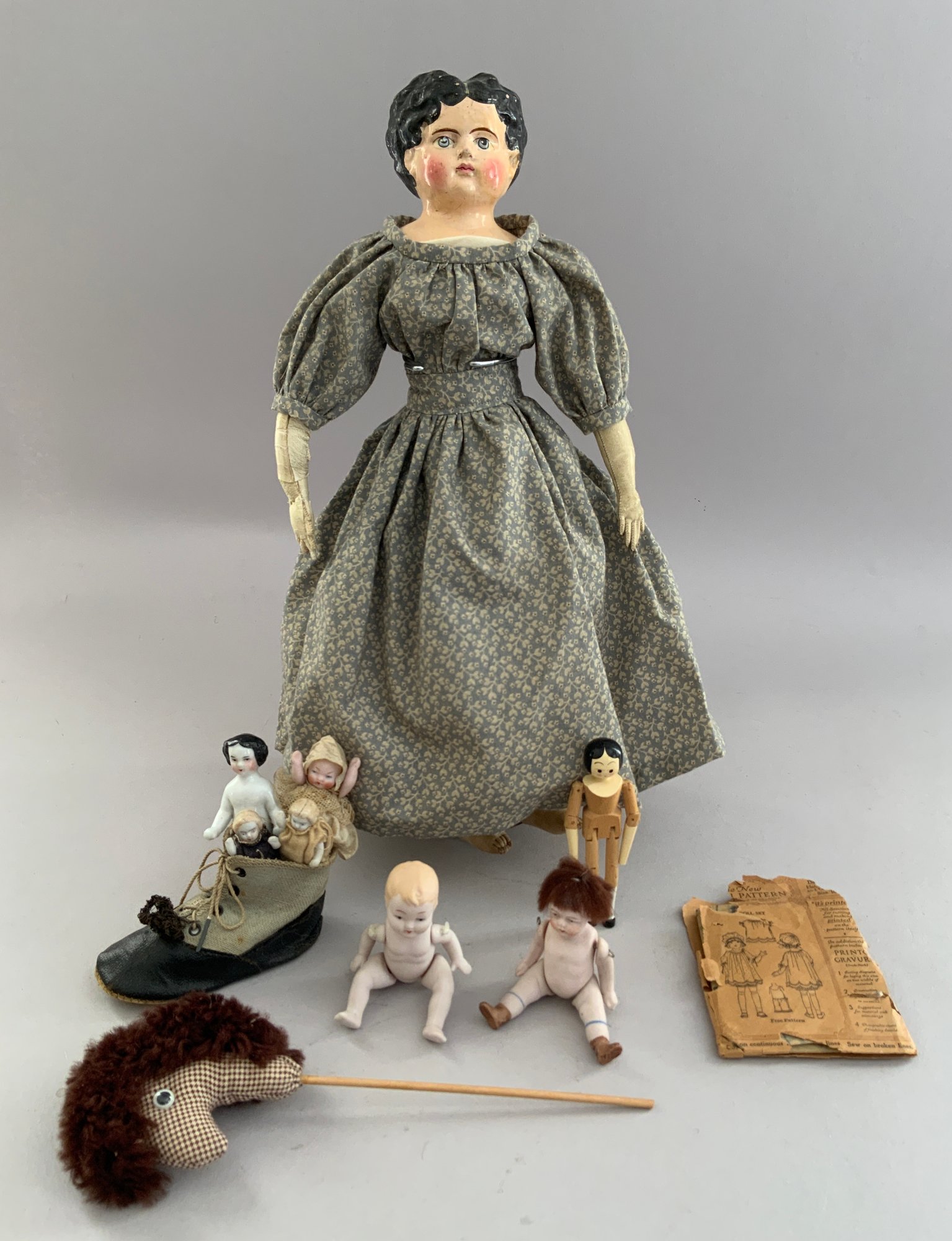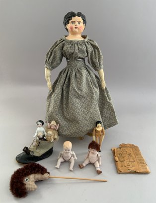 Opportunity lot, 1 – 15” paper mache, painted features, cloth body with leather arms (repaint & arm damage), 5 – small all bisque dolls 2” – 4”, 1 - small Frozen 1 – 4” modern peg wooden, etc.