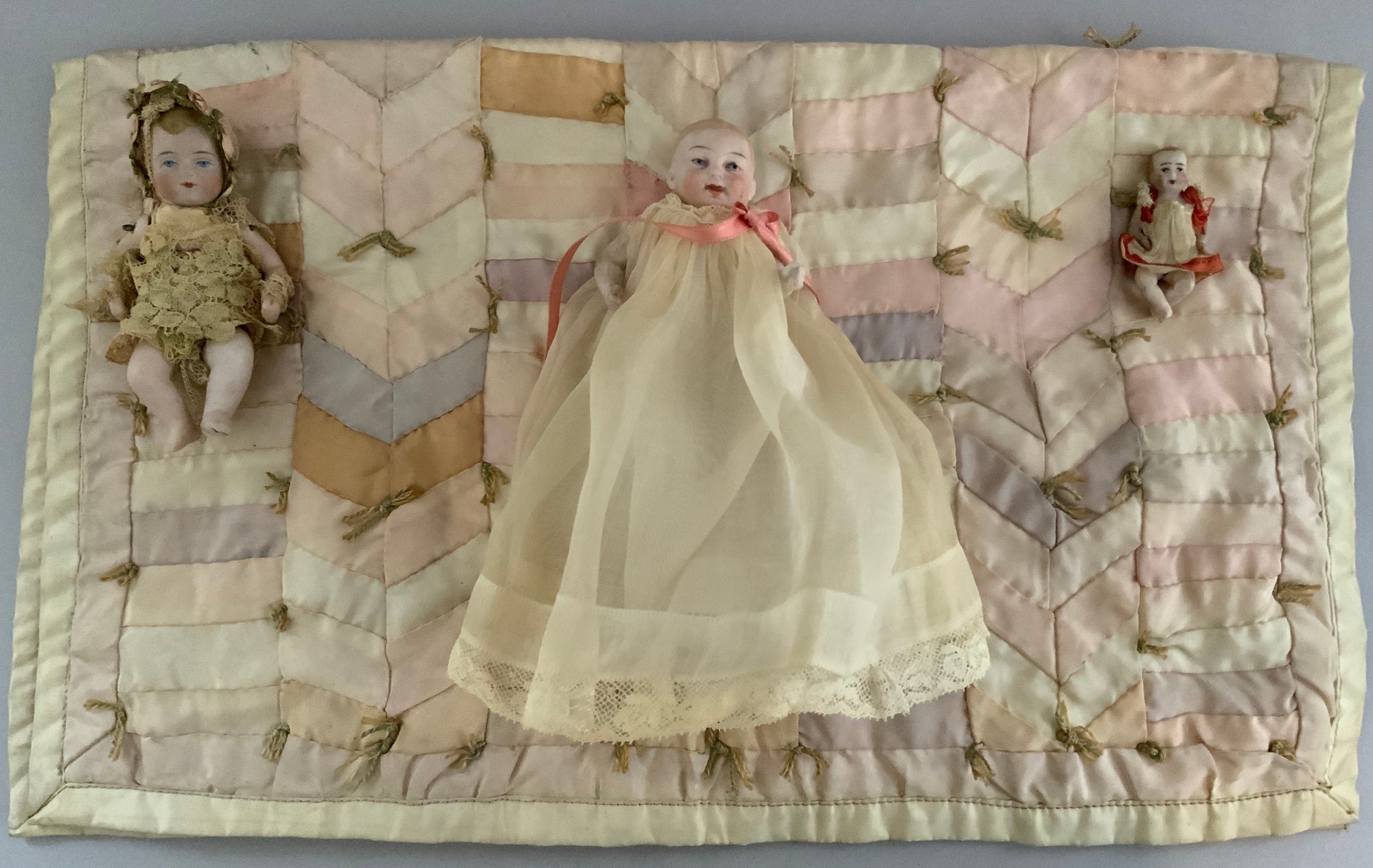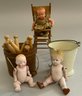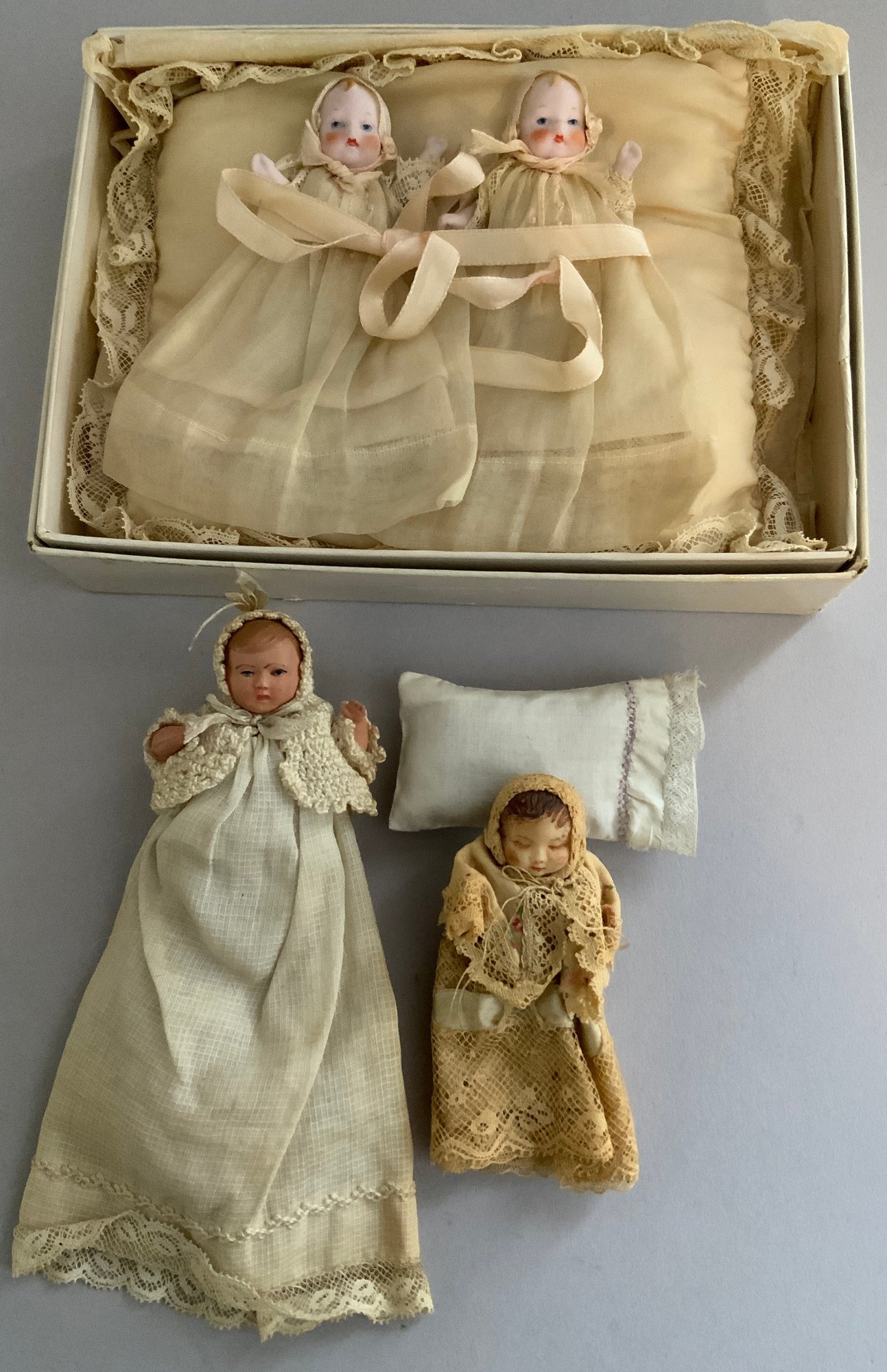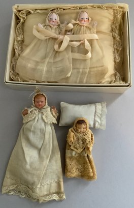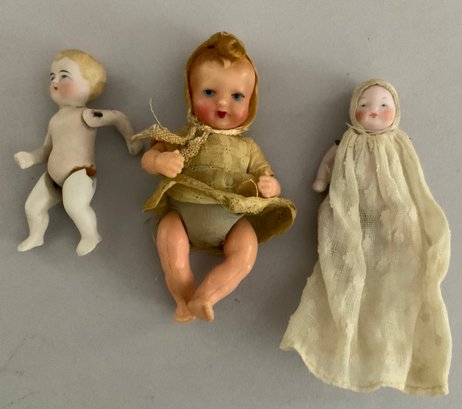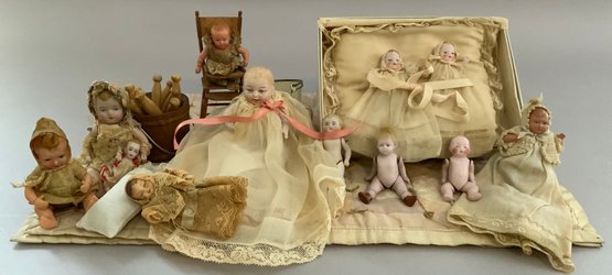 Opportunity lot of small baby dolls 2 ½” – 4 ½” long, bisque, plastic, etc., with accessories (as found)