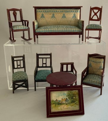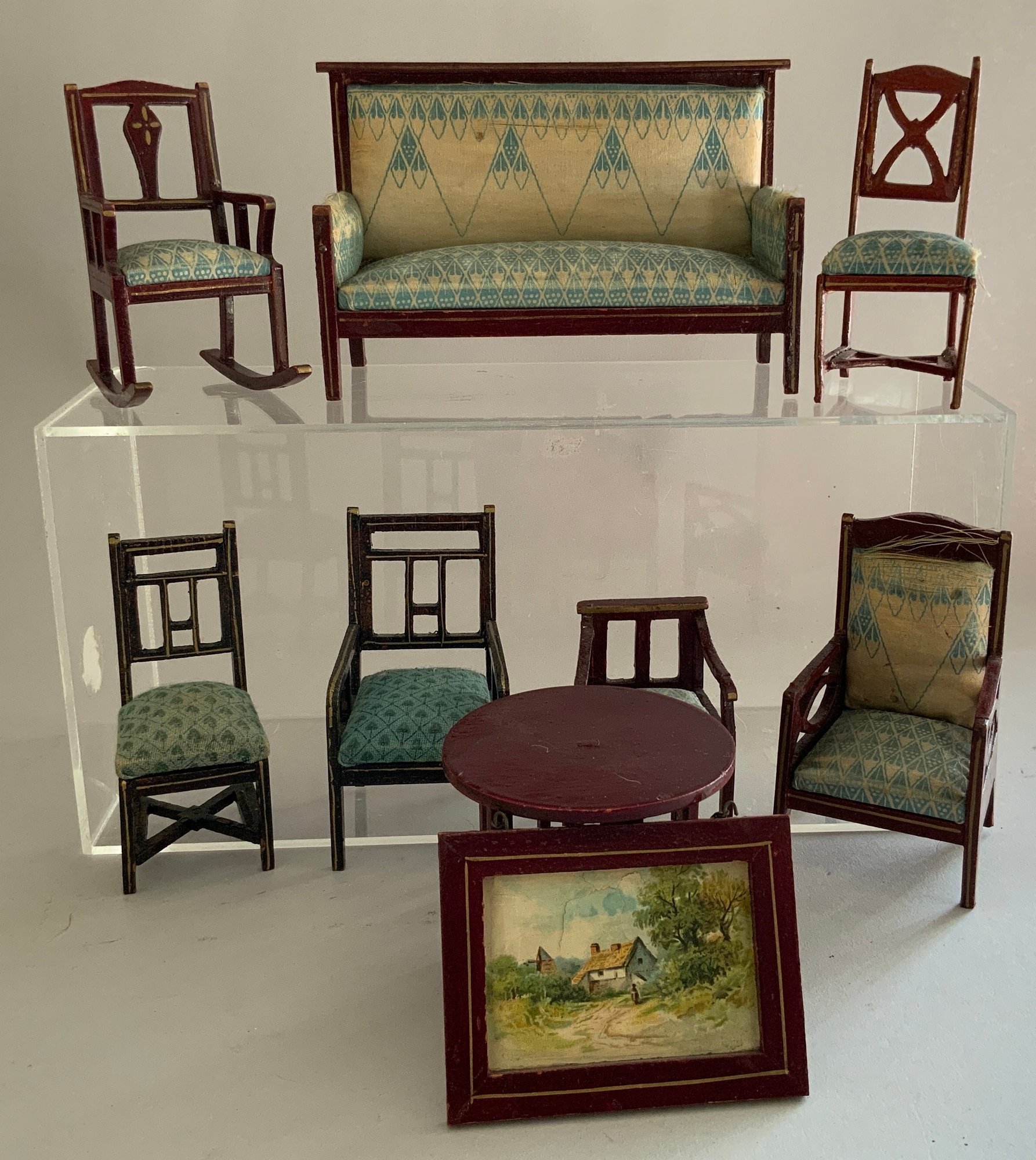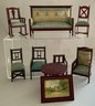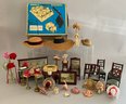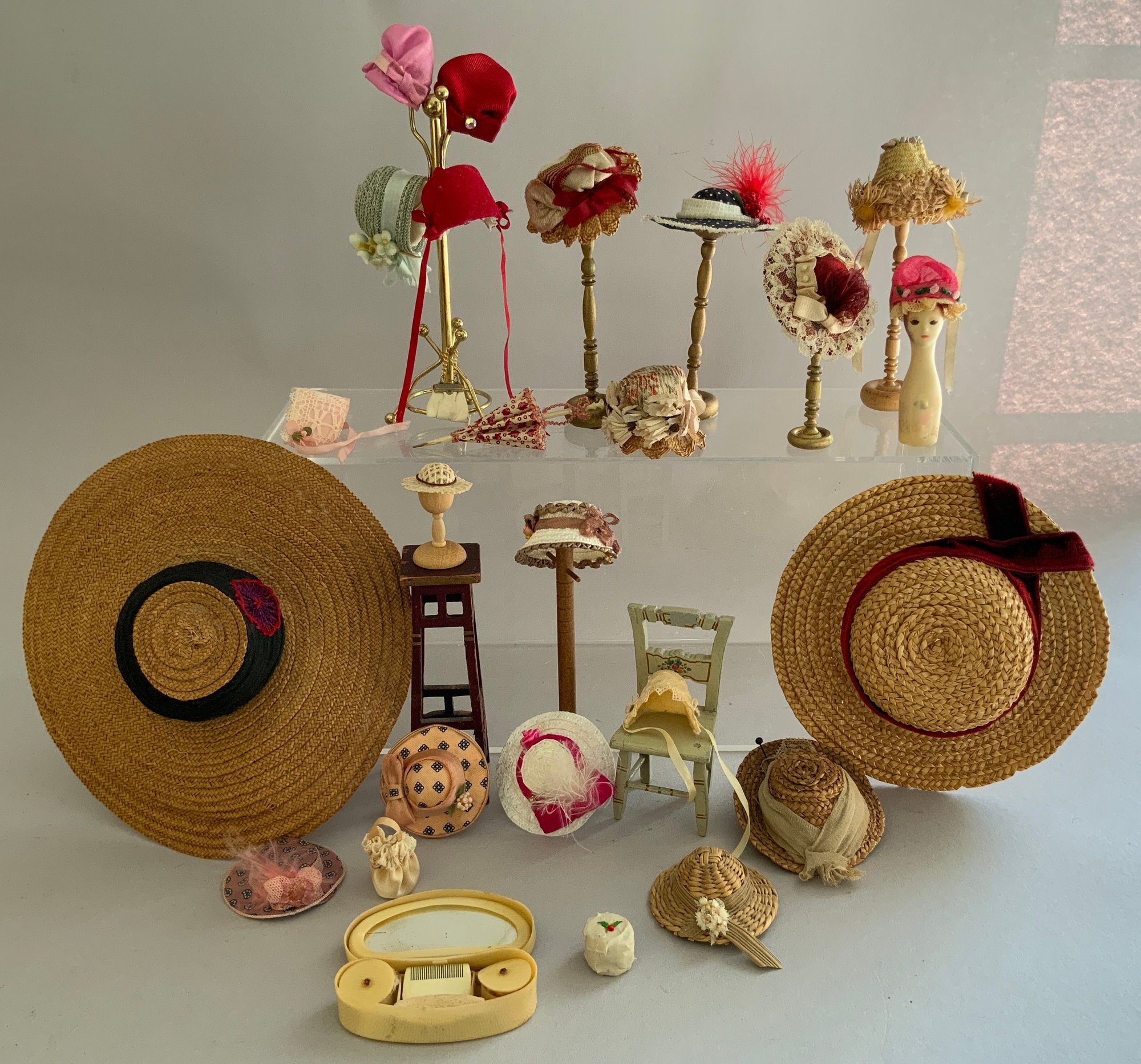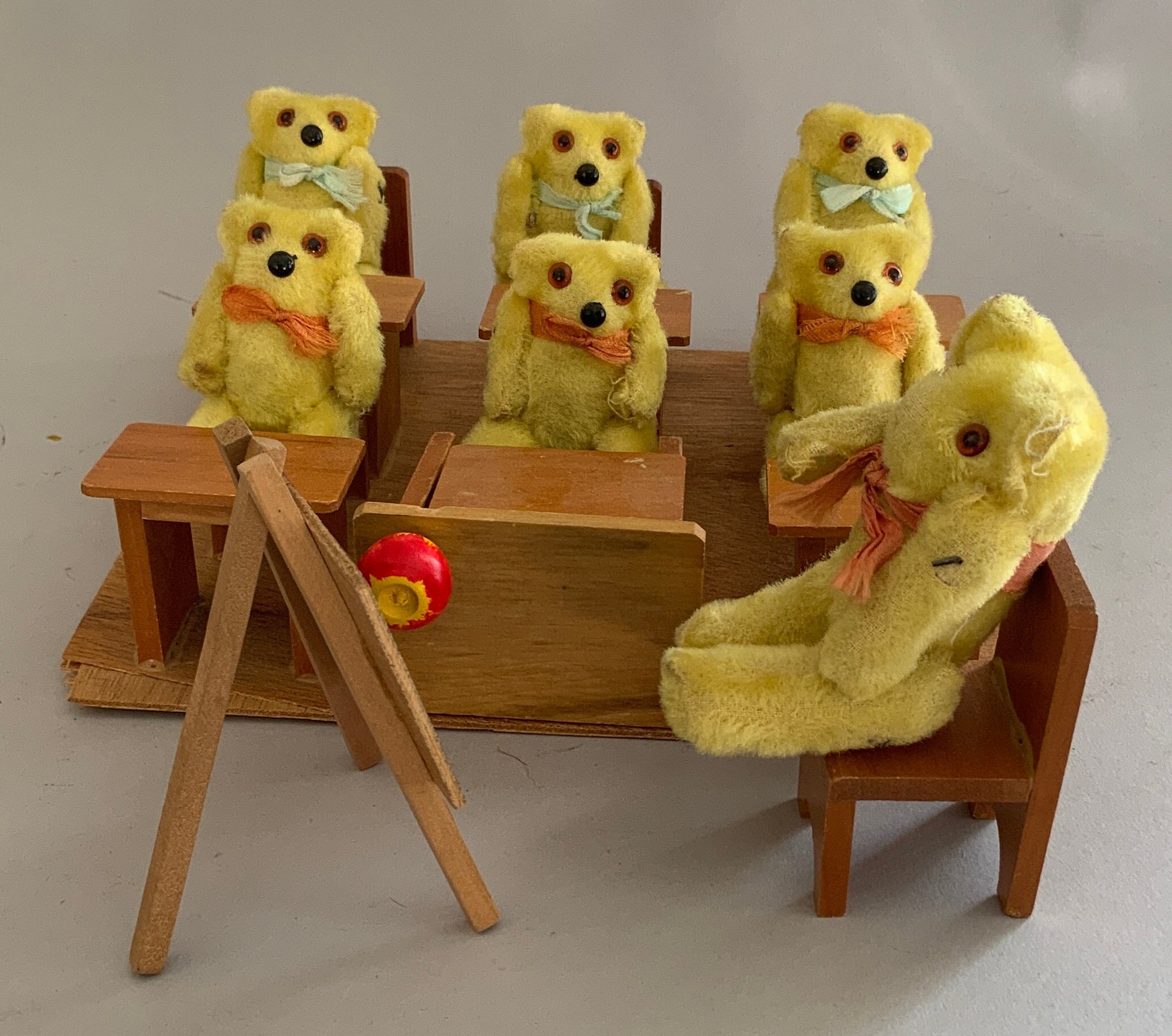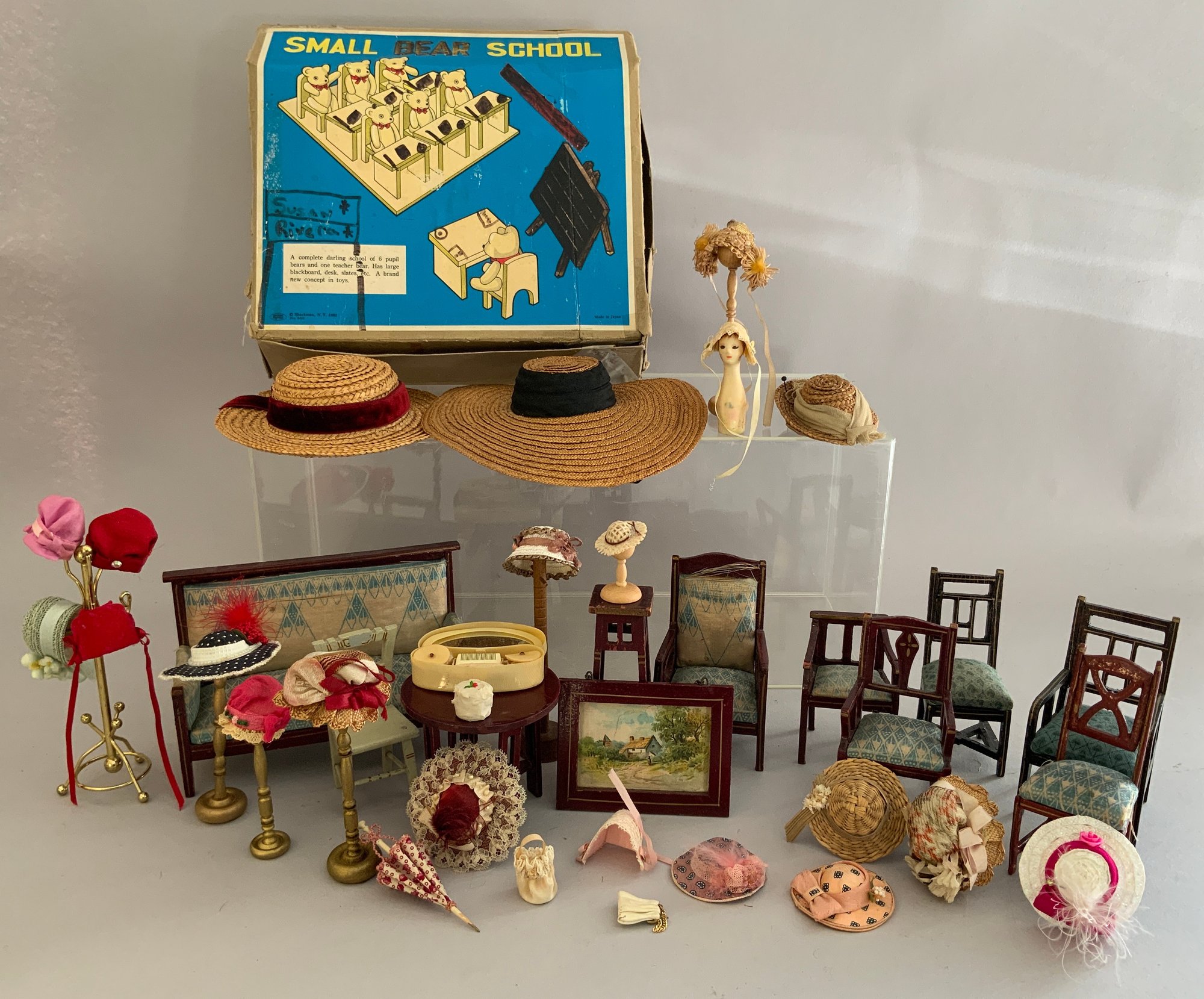 Opportunity lot, Small Bear School by Shackman, 6 bears at desks, lot of doll house furniture, & lot of doll hats
