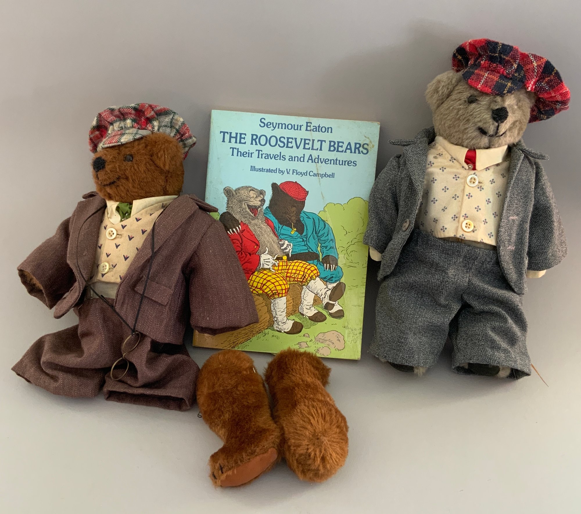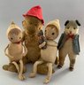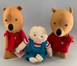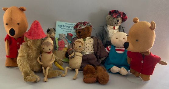 Opportunity tray lot, Schucco type monkey (wear), cloth novelty dolls, dog marked Germany, Winnie the Pooh hand puppets, etc.