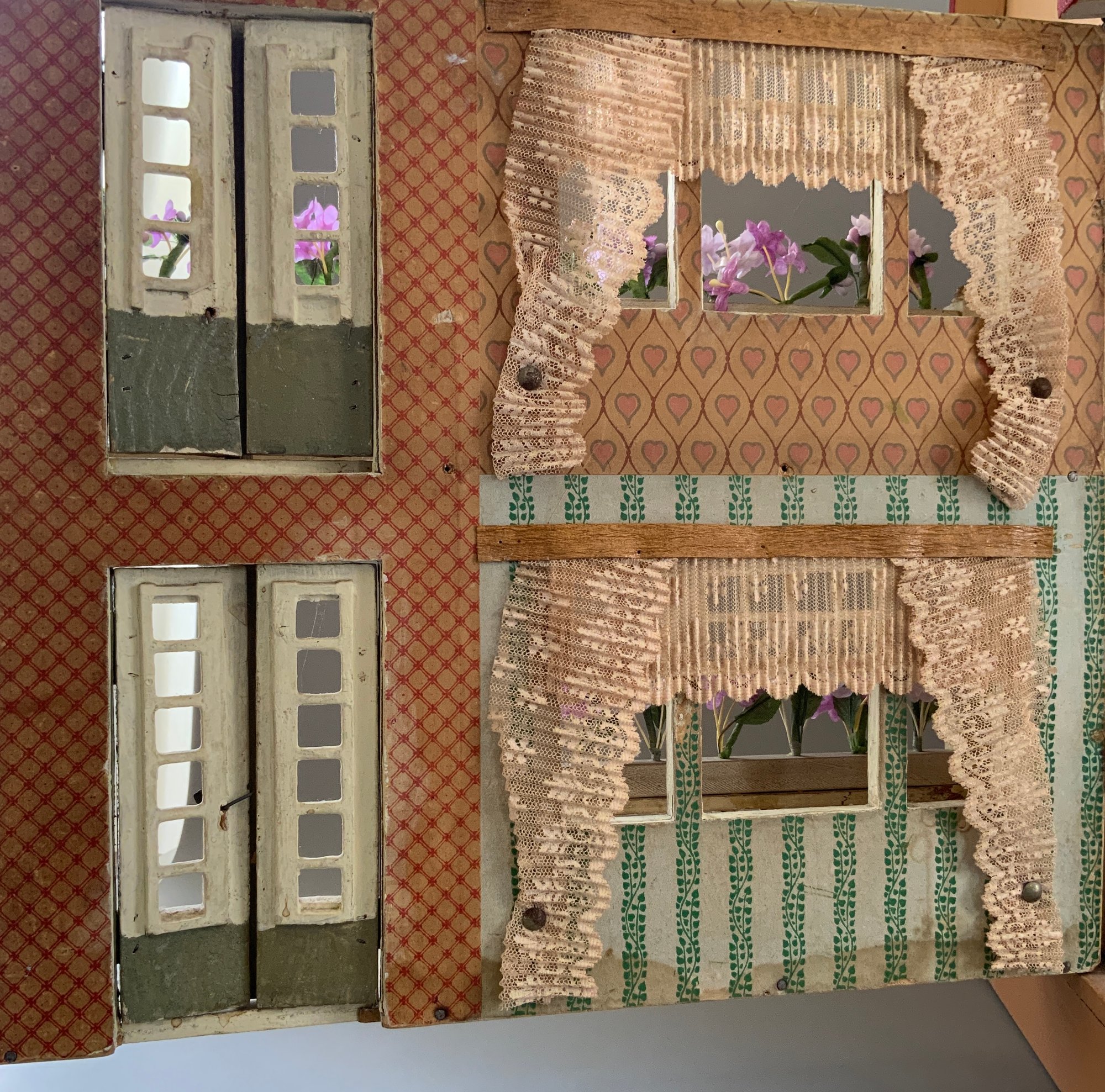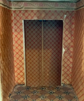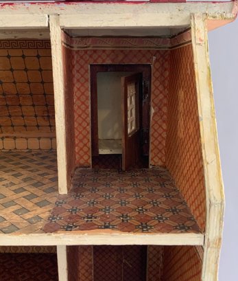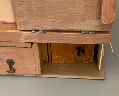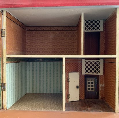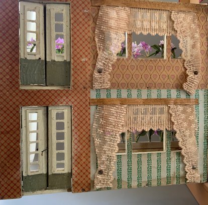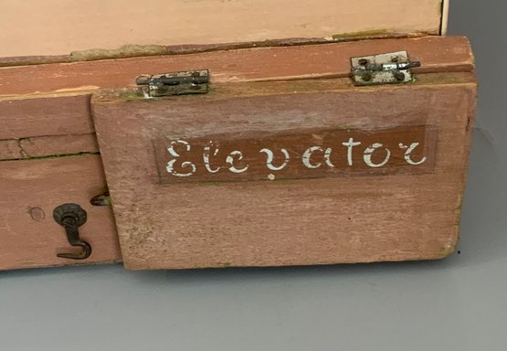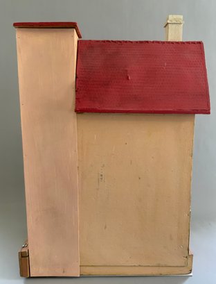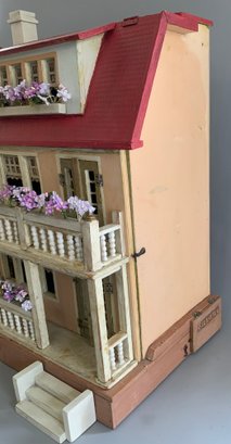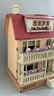 Gottschalk doll house, 16”L x 14”W x 24”T, 3 story, 2 front porches, red roof, with interior hand crank elevator