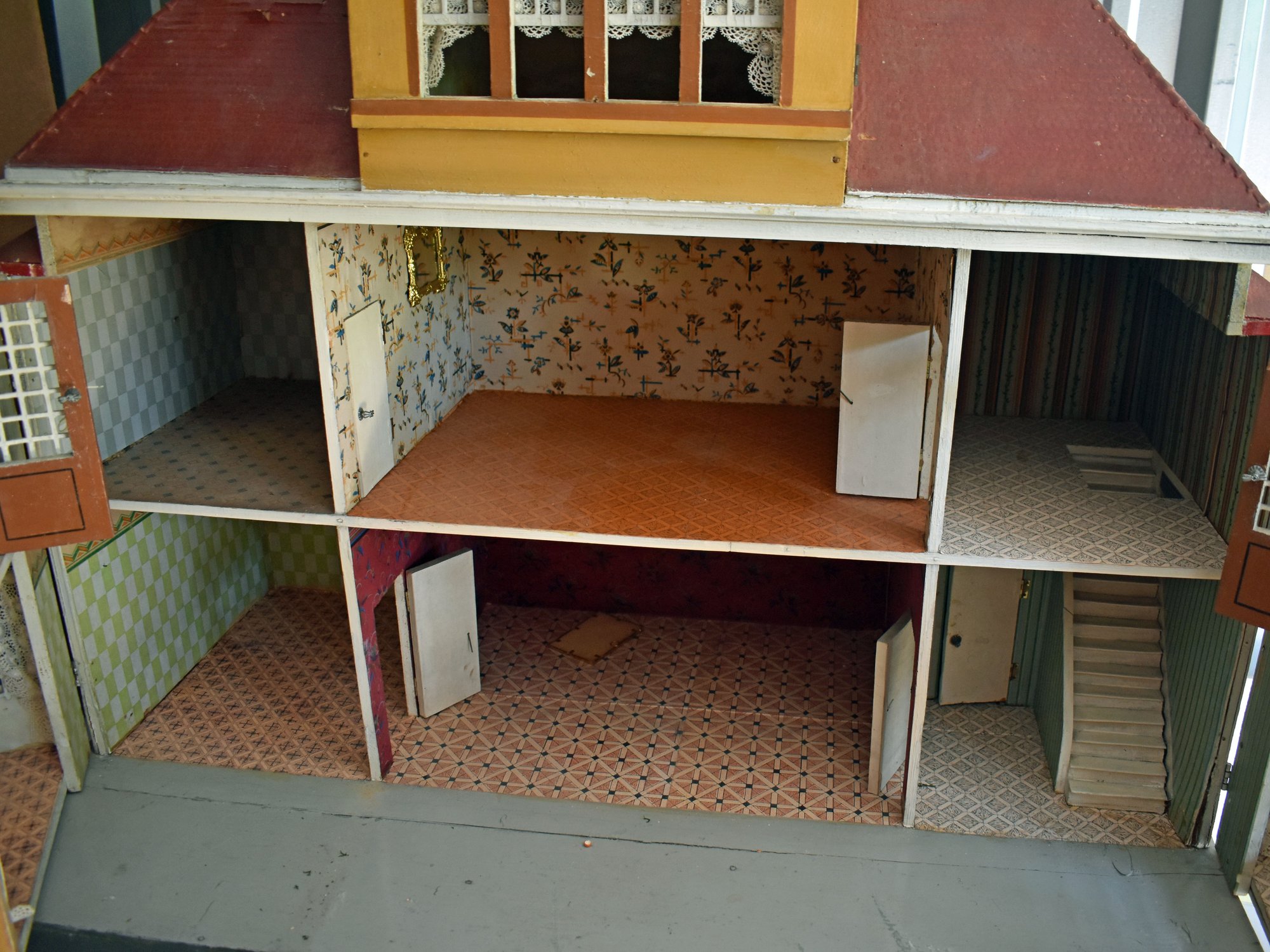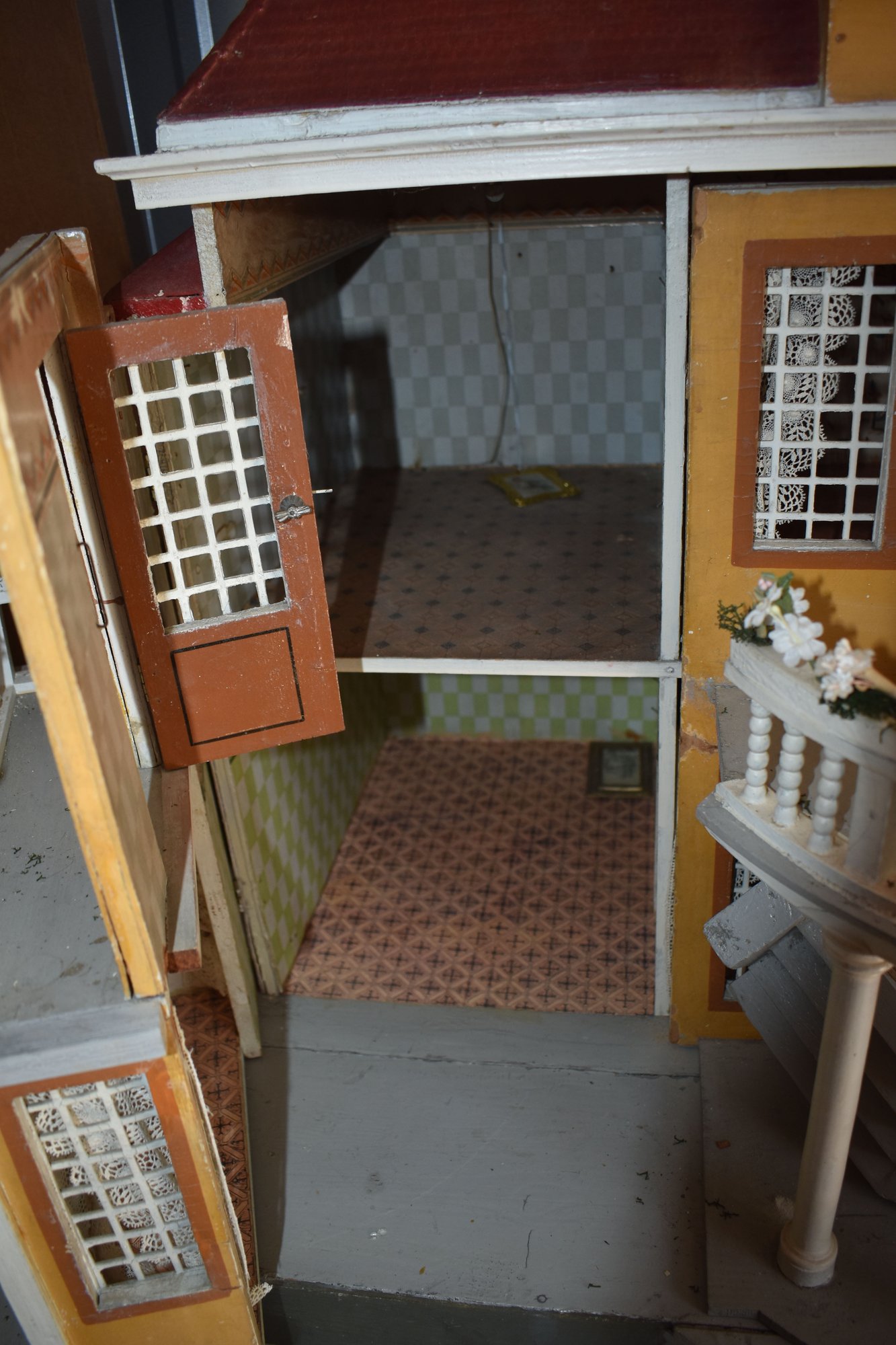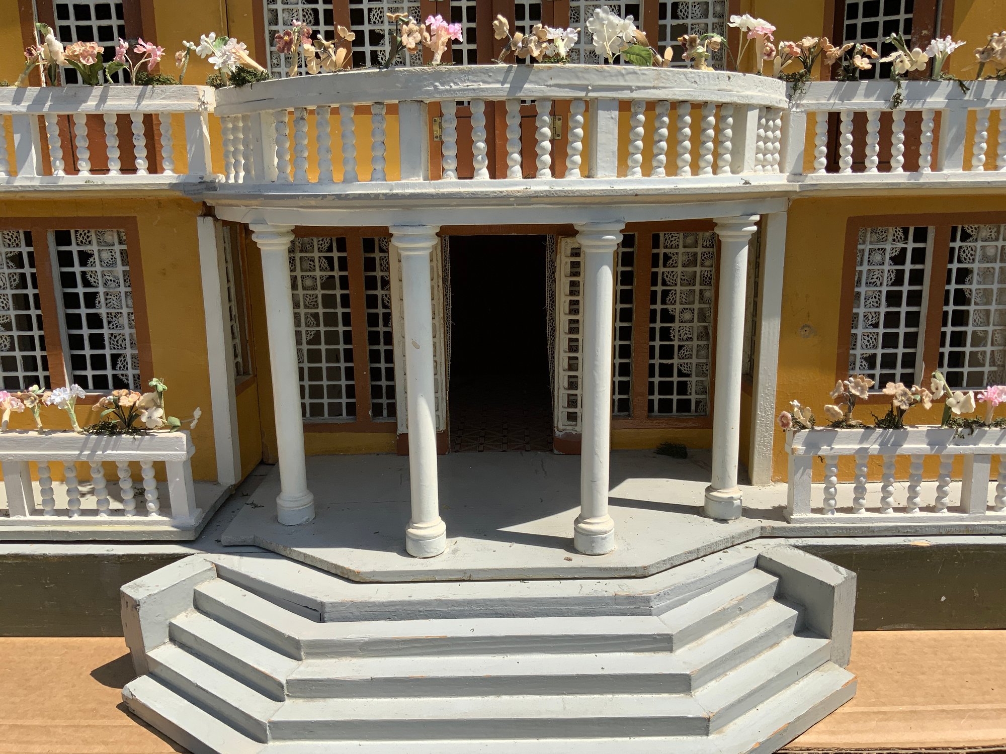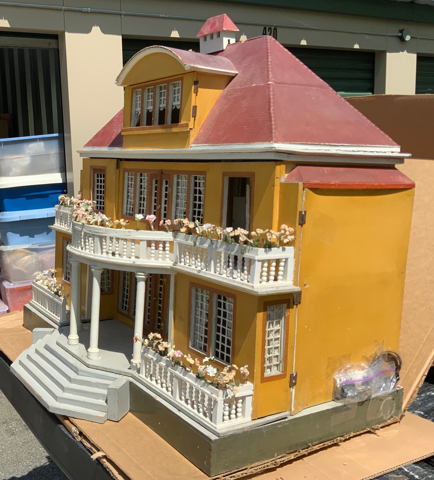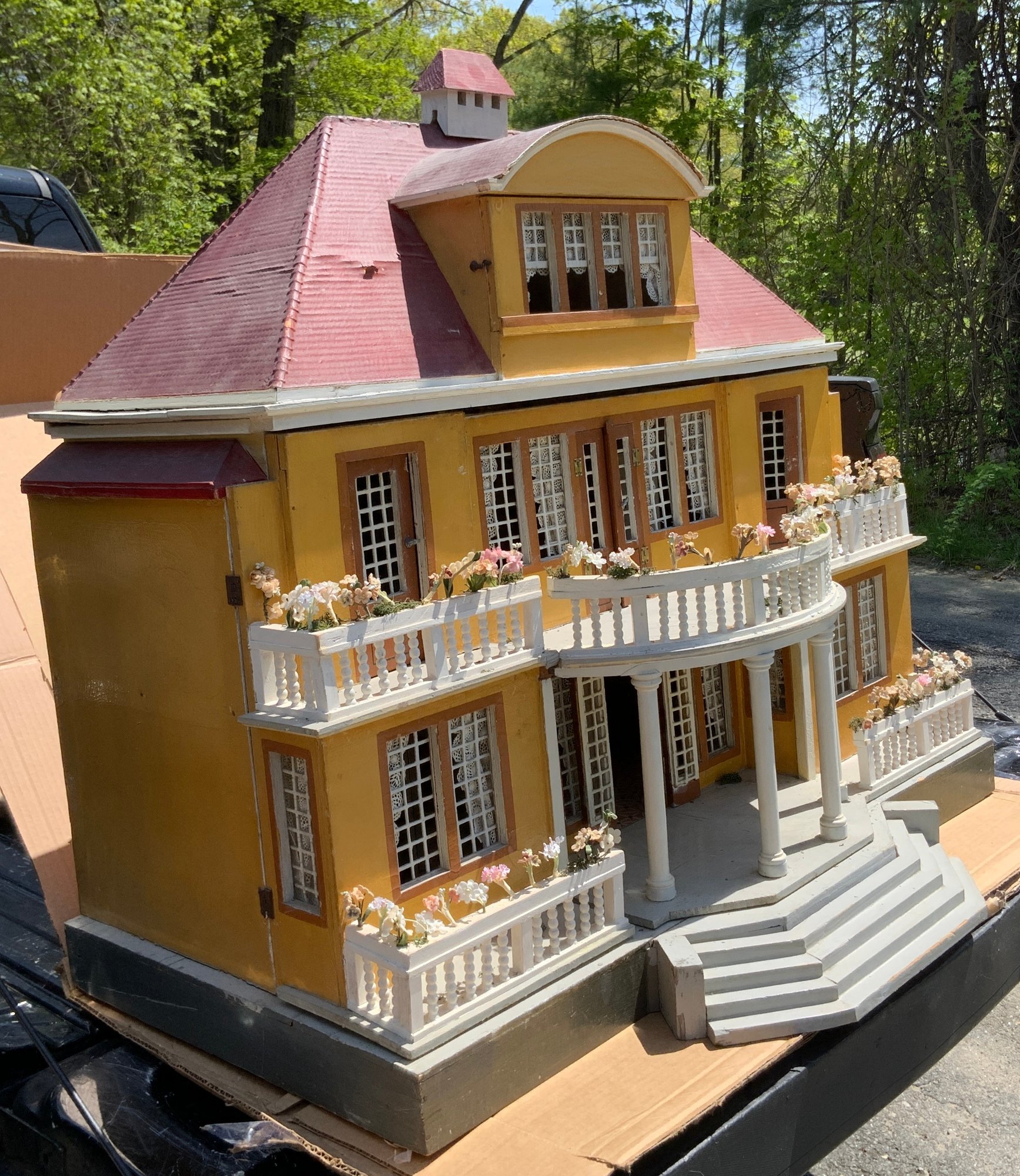 Gottschalk Large Mansion: 2 ½ story, red roof, 39 ½”W x20 ¾”D x 36”T, Second floor front portico w/ Balcony w/ Eye-brow dormer roof, on Hip-roof, Casement windows, lace curtains turned railings, flower boxes, stairs, and a Cupola on top, 3-room upstairs, Electrified. Buyer must pick up or arrange for shipping