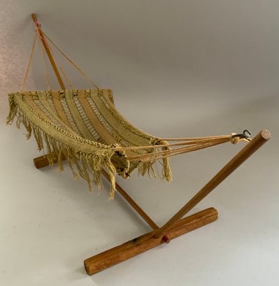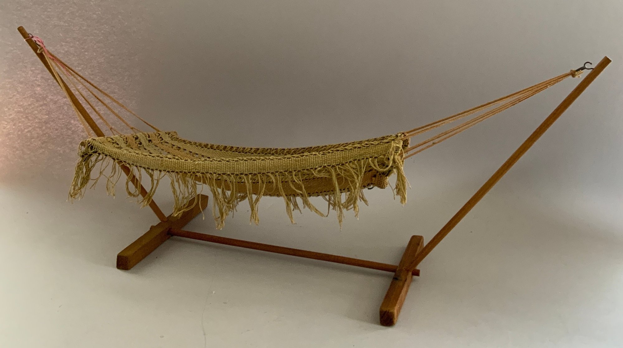 Rare Doll’s or Salesman’s Sample Wood Frame Hammock, Pat. Oct. 1905, 33”L x 10”W x 13”H, cotton woven mesh sling w/ fringe, comes apart for shipping