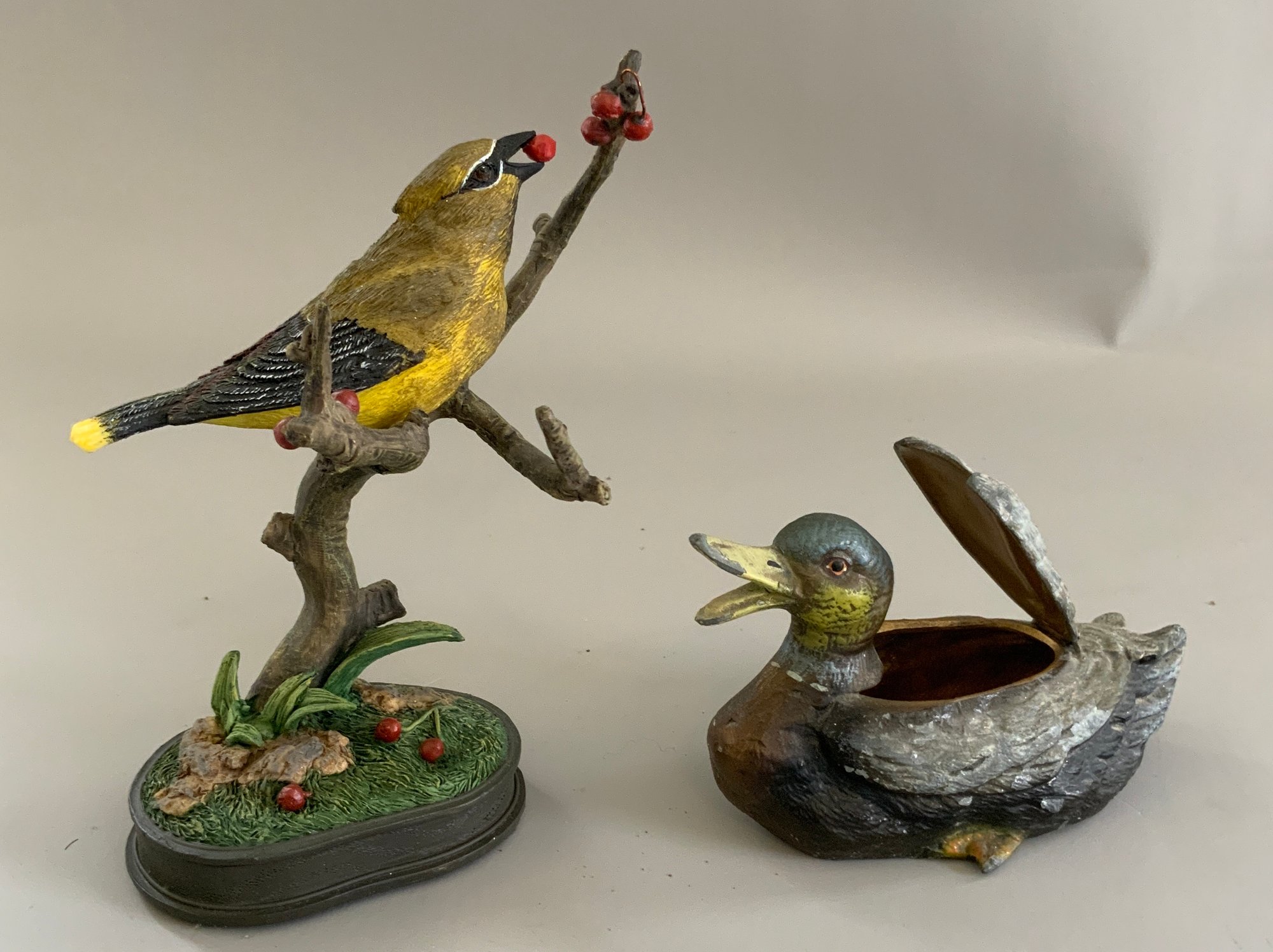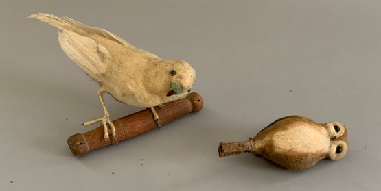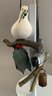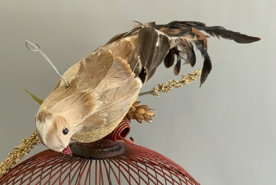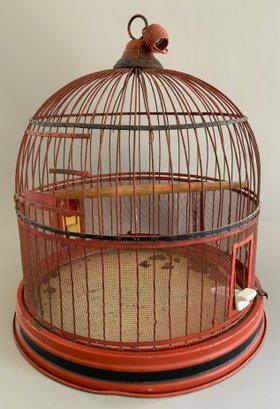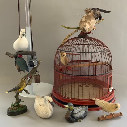 Red paint wire bird cage 11”D x 13 T, with 6 assorted birds