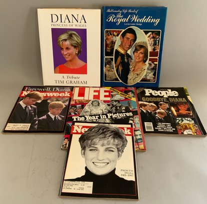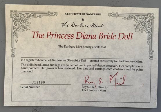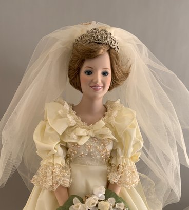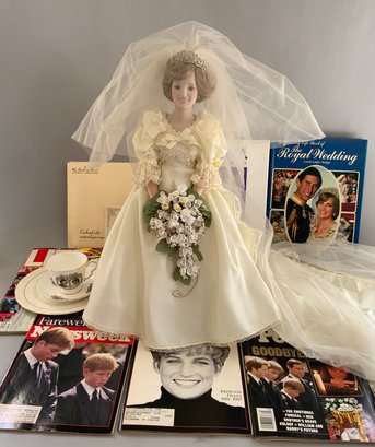 Princess Diana Bride Doll, Danbury Mint, 20”, with paperwork & 2 – Diana books plus 4 – magazines & 3 Pcs Royal Albert china July 29, 1981 marriage Prince Charles & Lady Diana
