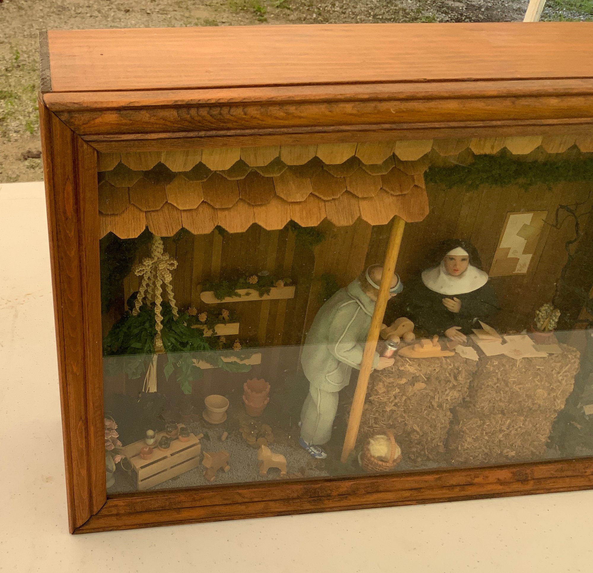 Room box/diorama 17 ½” L x 11 ½” W x 5” D, Garden Shop with seated Nun & man, w/ plants & accessories