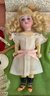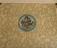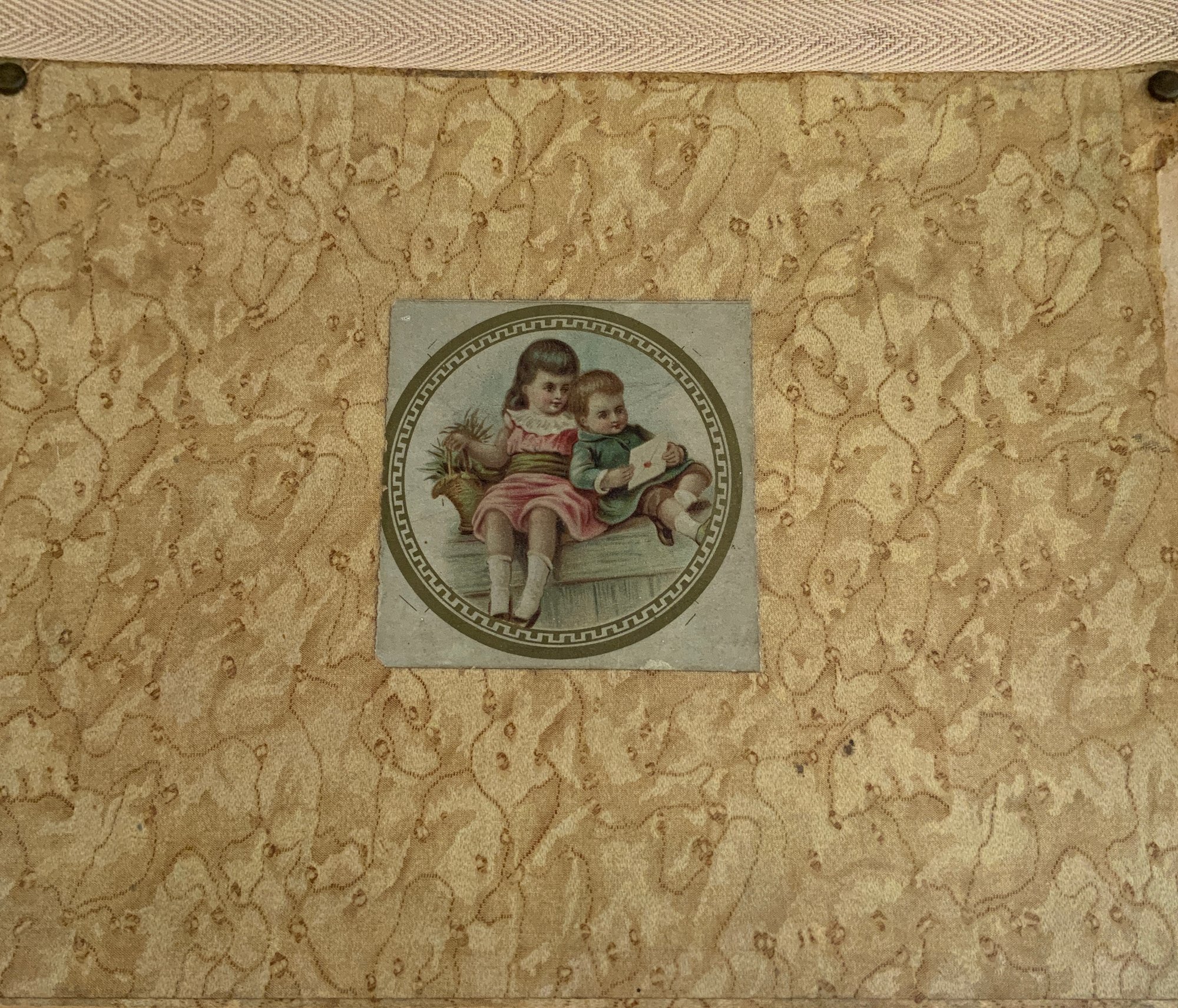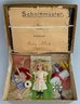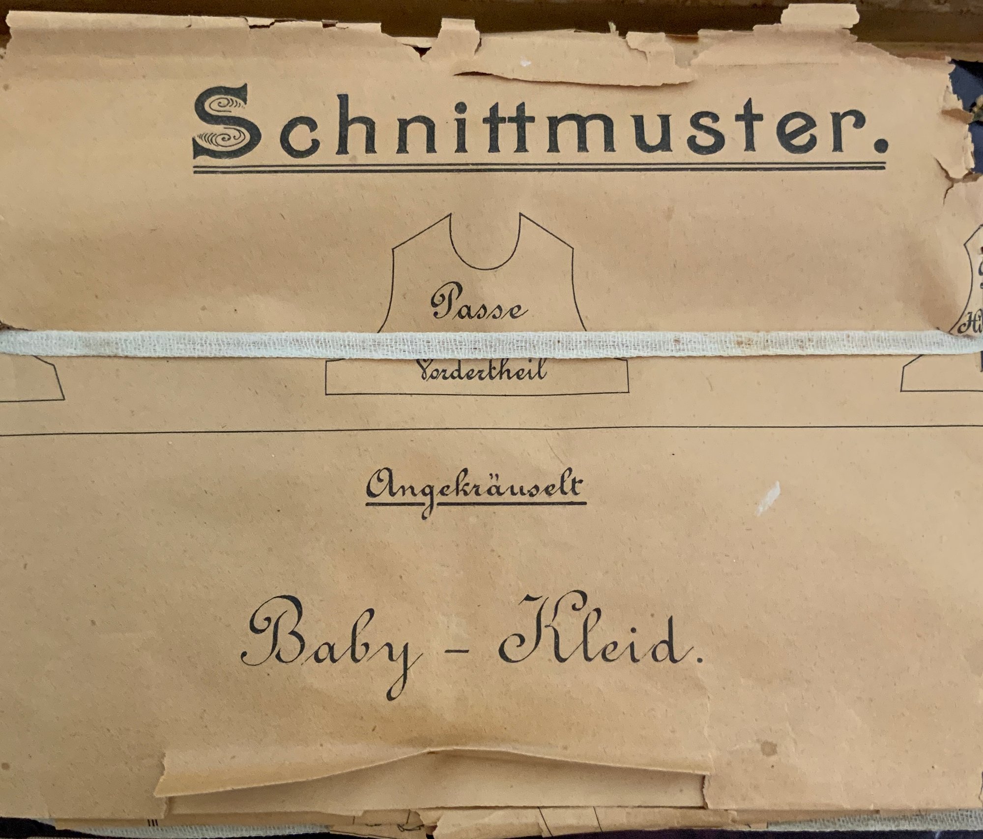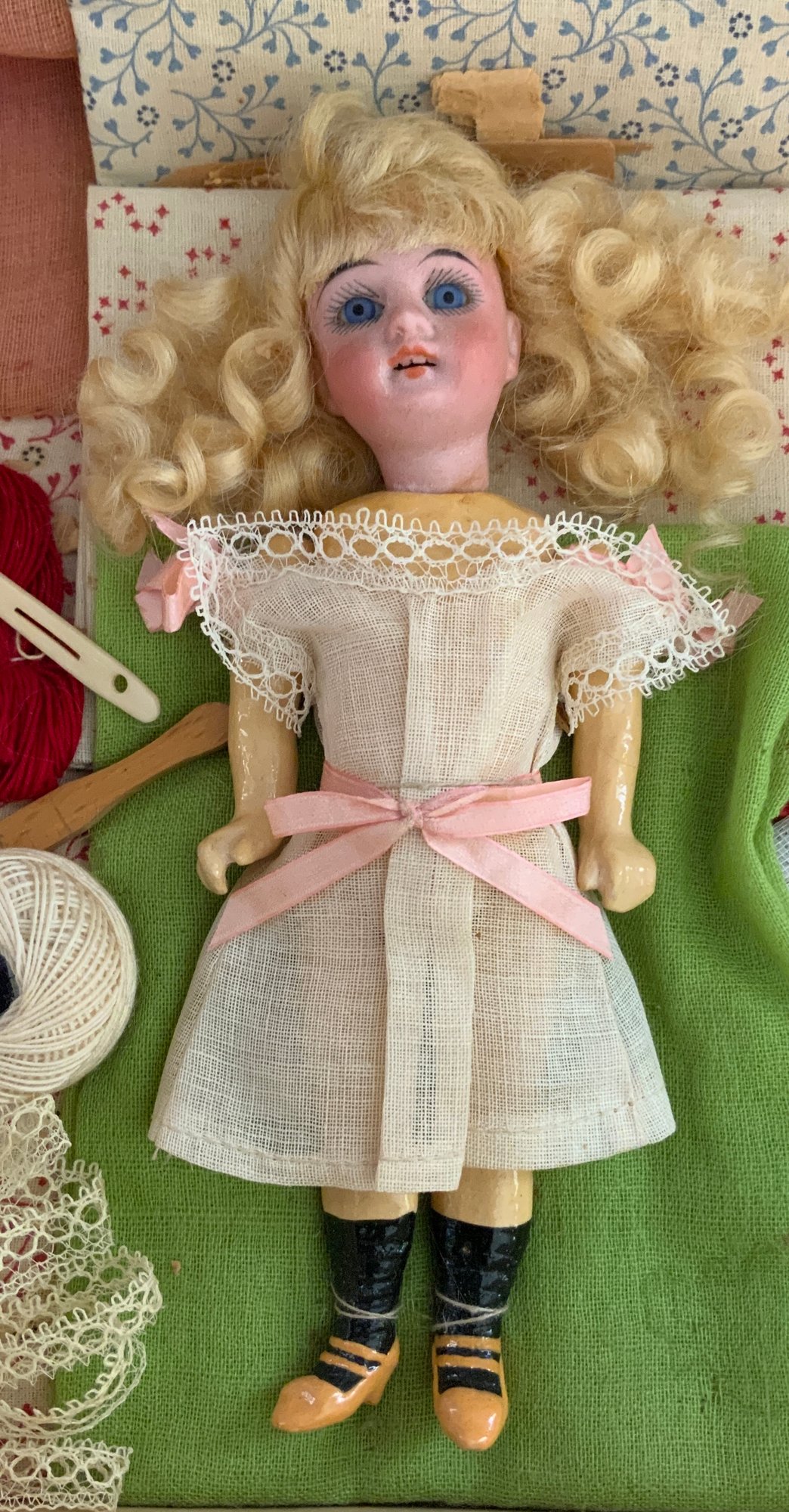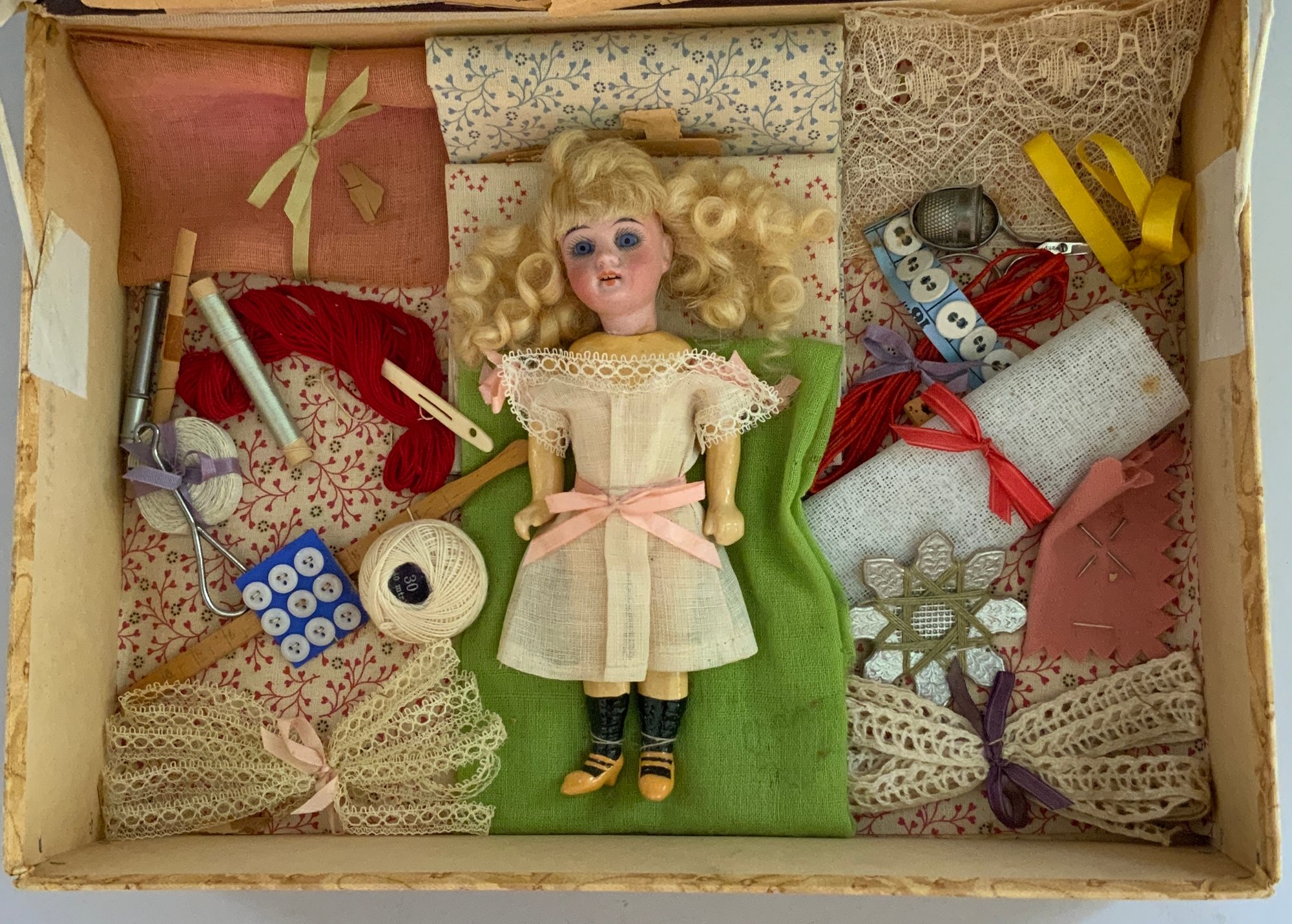Schnittmuster Baby-Kleid presentation box, baby dress pattern, hard sided sewing kit with 6” bisque head doll Gerbruder Kuhnlenz 44-15, blue glass eyes, OM with teeth, blonde mohair wig, compo body, and 30 assorted sewing pieces, box cover has a picture of 2 children applied to it, original box some wear