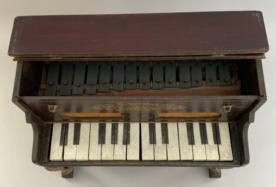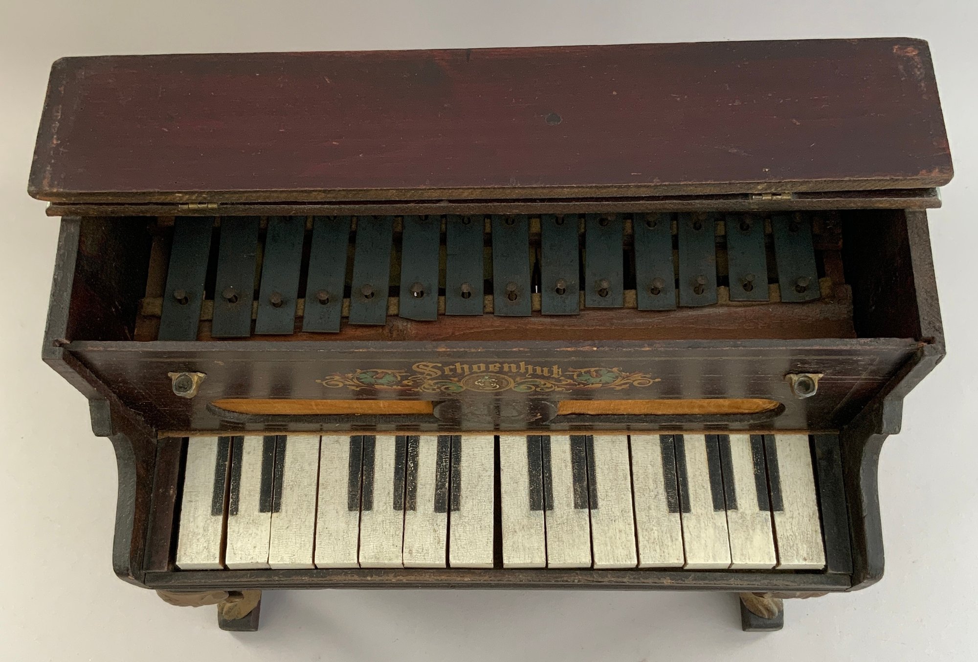 Schoenhut piano, 15”L x 12”H x 8”D, with metal cabriole legs, missing candleholders, 15”L x 12”H x 8”D, with metal cabriole legs, missing candleholders