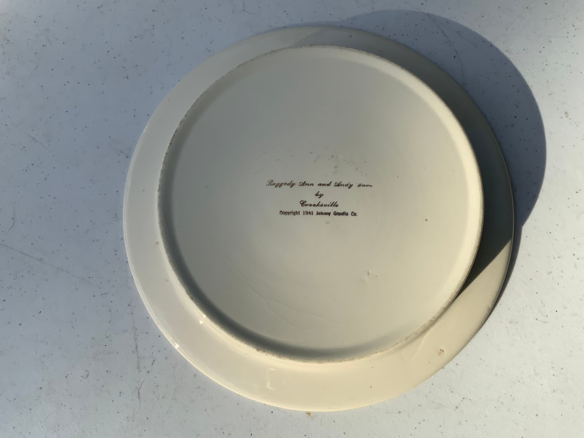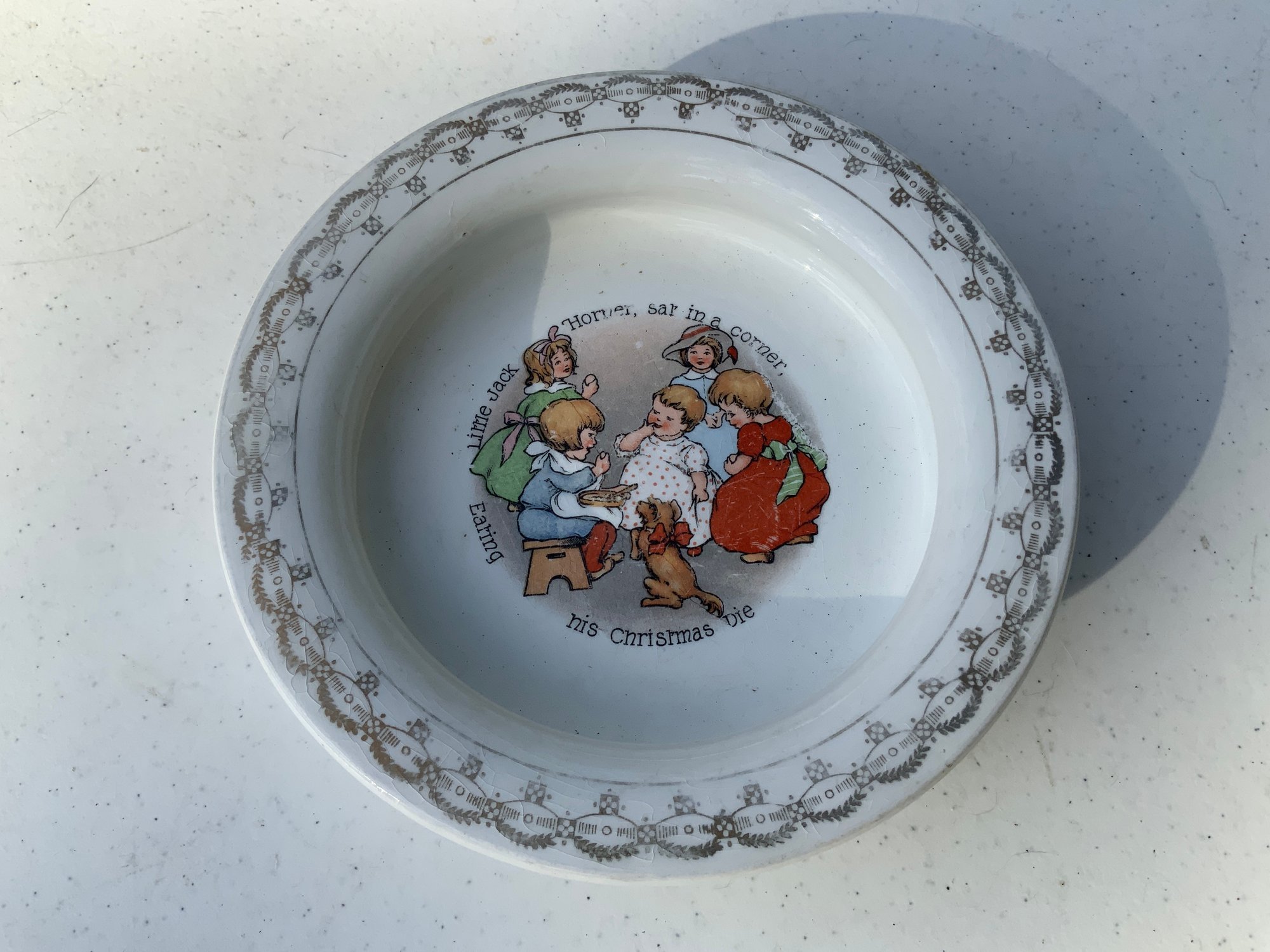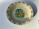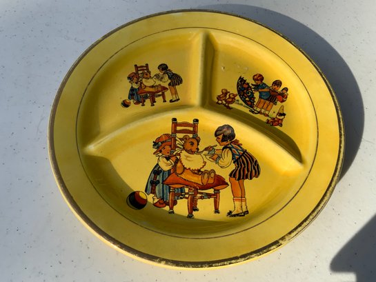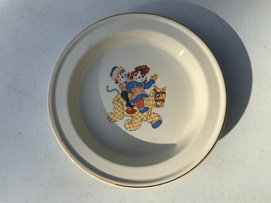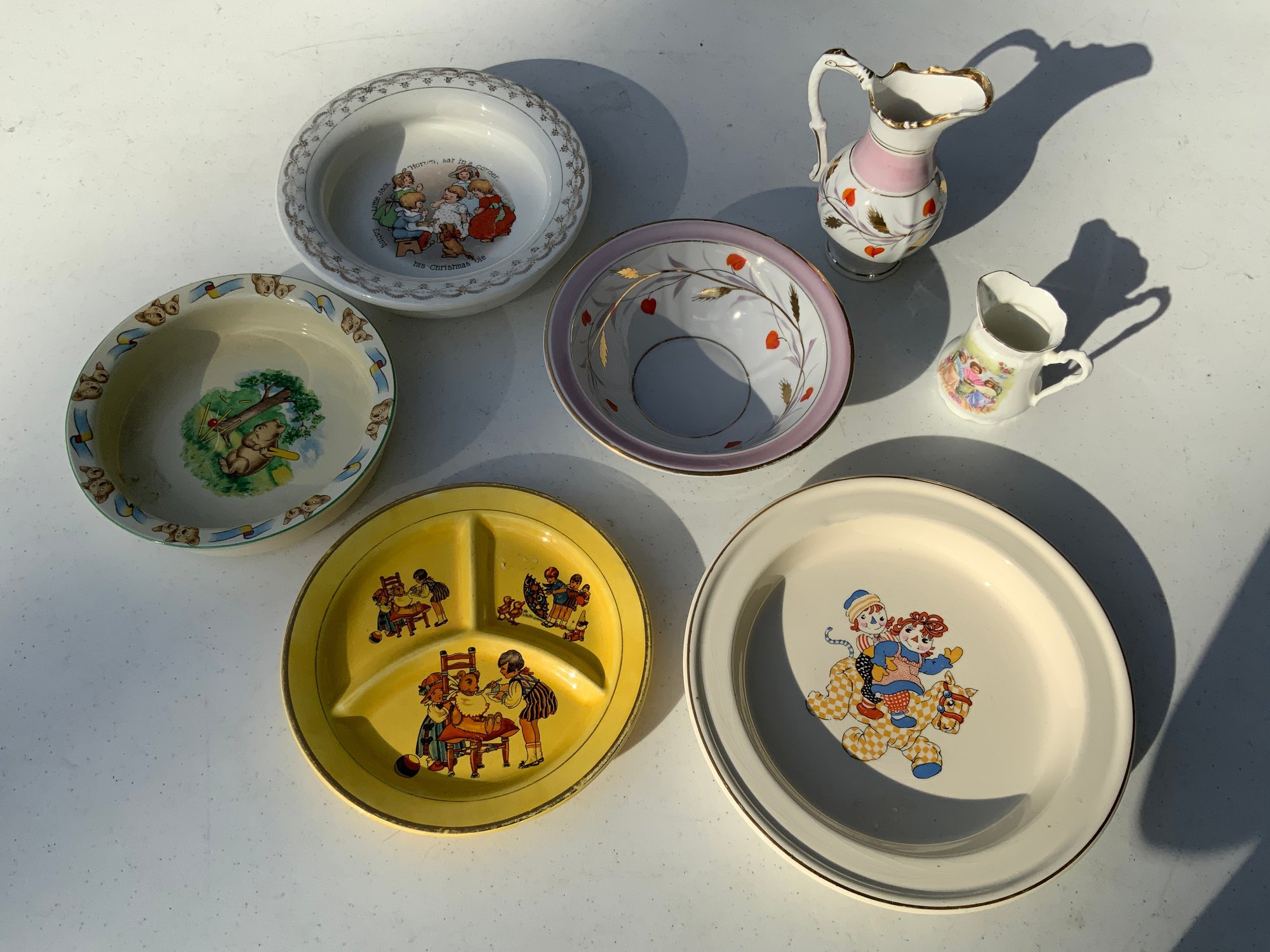 Seven pieces various children’s plates, bowls and jugs. One 7”x1.5” Royal Doulton Bunnykins baby feeding dish. One 9”x1.25” Raggedy Ann plate. One 7.5”x1” yellow Crown Pottery Co. baby feeding dish. One 7.75”x1.75” child's feeding dish featuring the nursery rhyme "Little Jack Horner”. One 7”x2.25” white bowl with a pink rim and gold trim. One 5.25”x4” white jug with a pink rim and gold trim. One 3”x3.25”jug with floral motifs and three children with fans.
