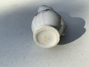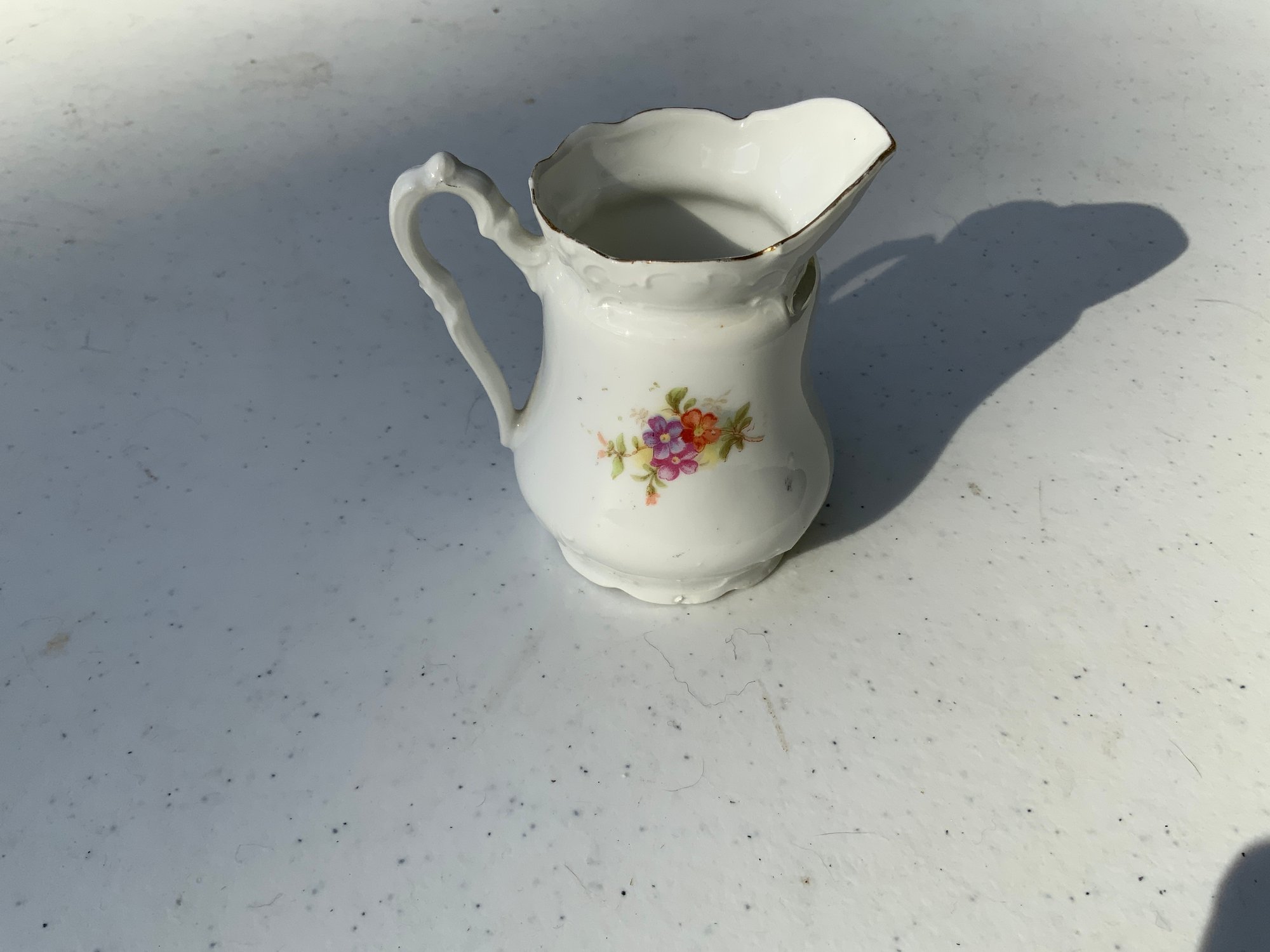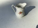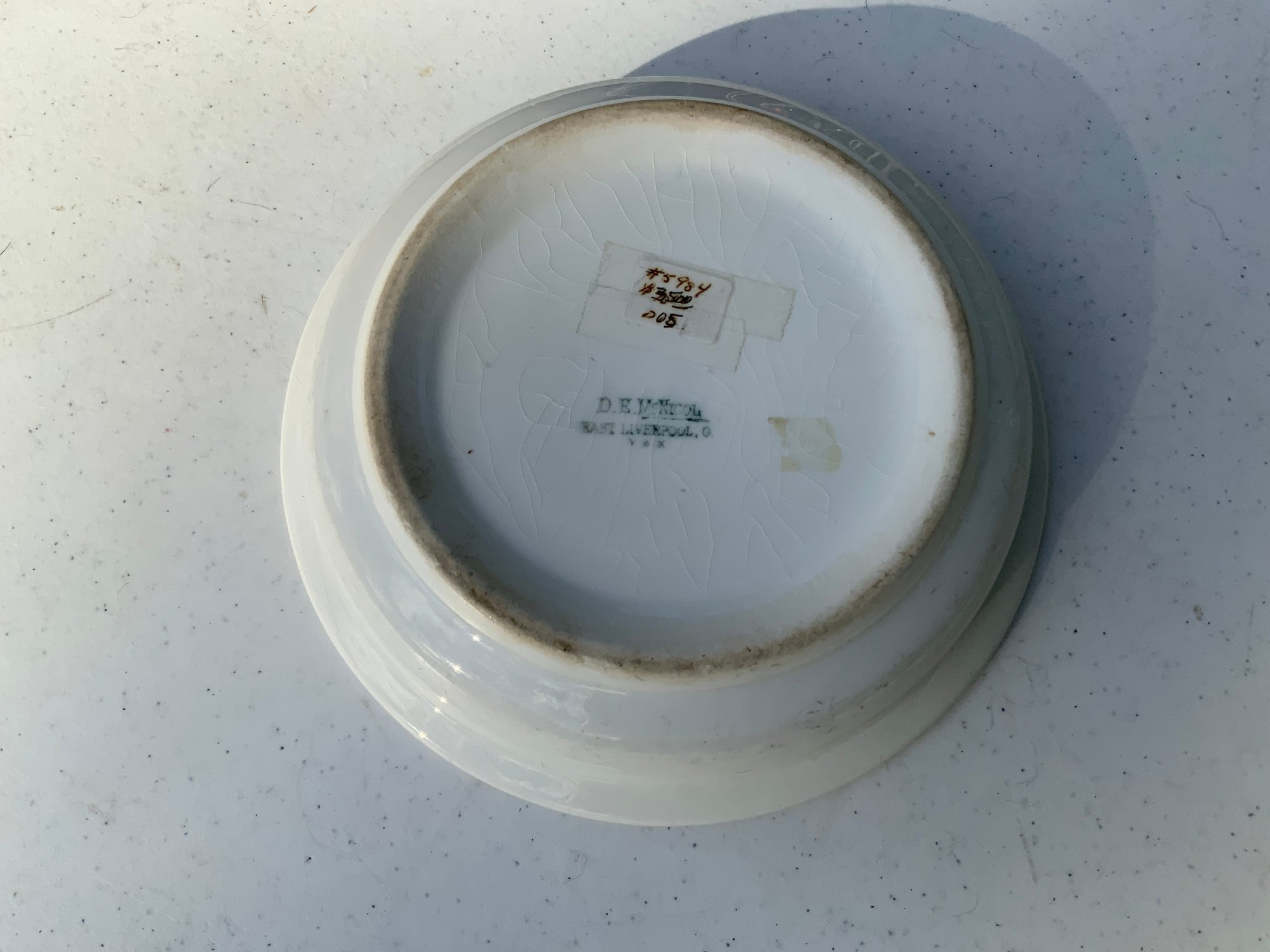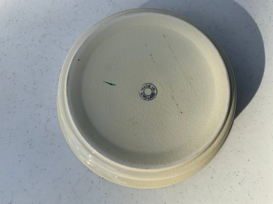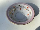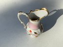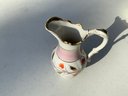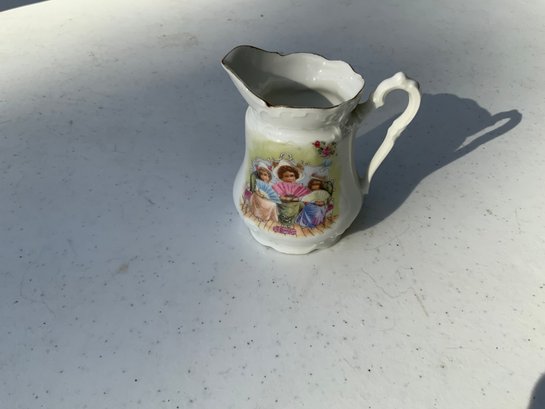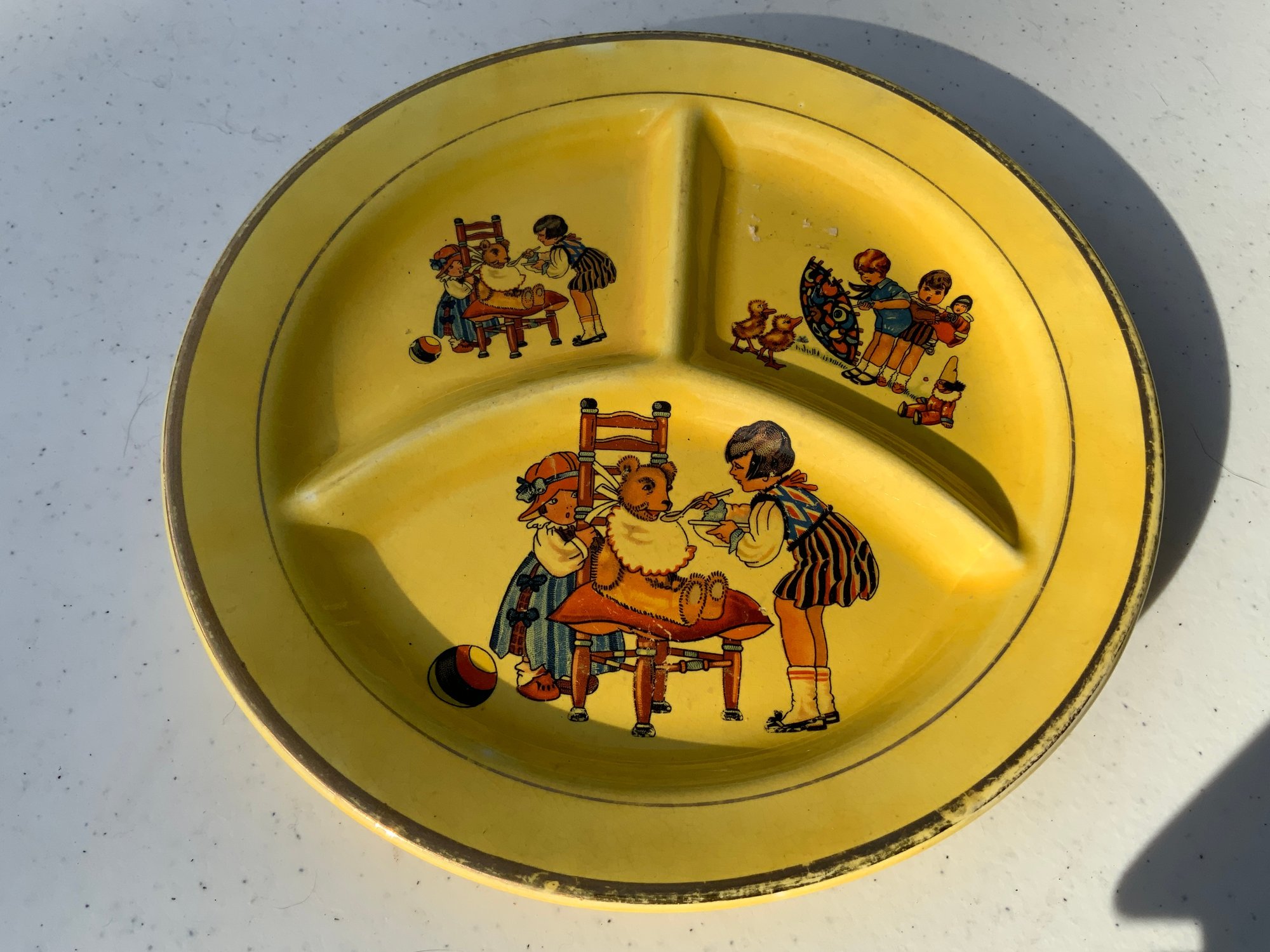 Seven pieces various children’s plates, bowls and jugs. One 7”x1.5” Royal Doulton Bunnykins baby feeding dish. One 9”x1.25” Raggedy Ann plate. One 7.5”x1” yellow Crown Pottery Co. baby feeding dish. One 7.75”x1.75” child's feeding dish featuring the nursery rhyme "Little Jack Horner”. One 7”x2.25” white bowl with a pink rim and gold trim. One 5.25”x4” white jug with a pink rim and gold trim. One 3”x3.25”jug with floral motifs and three children with fans.