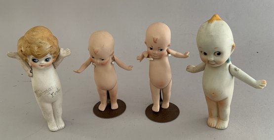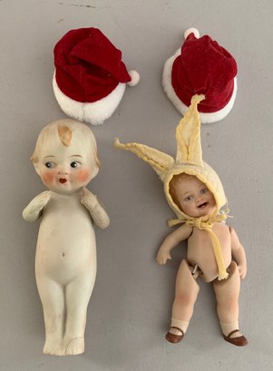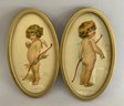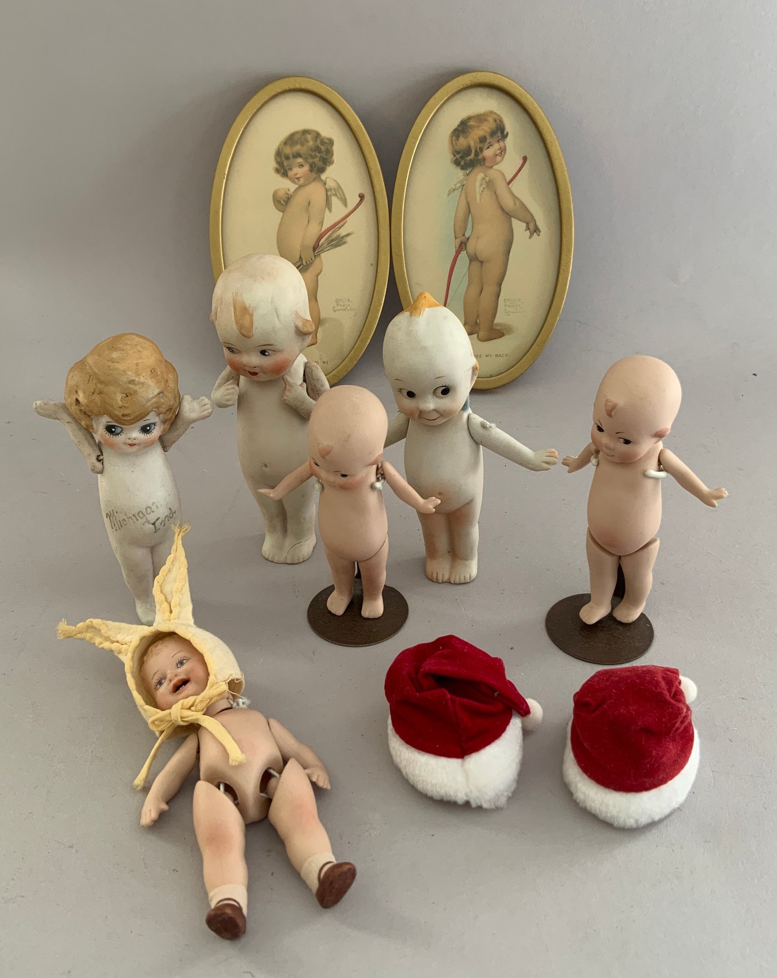 Shoe Box of 6 Cupids / “Kewpies”: (Japan-made & artist dolls) plus a pair of oval framed cupids by Betsy Pease Gutman: “Excuse My Back” & Cupid – That’s Me”