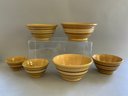 Six piece yellowware batter bowls with brown and white bands. One 9”x4.25” bowl good condition. One 8”x8.5” bowl good condition. One 7.8”x3.75” bowl small hairlines along rim. One 6.75”x3.25” bowl good condition. One 5.25”x2.75” bowl good condition. One 4.75”x2.5” bowl good condition.