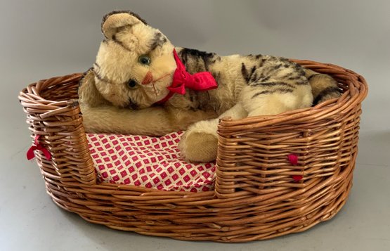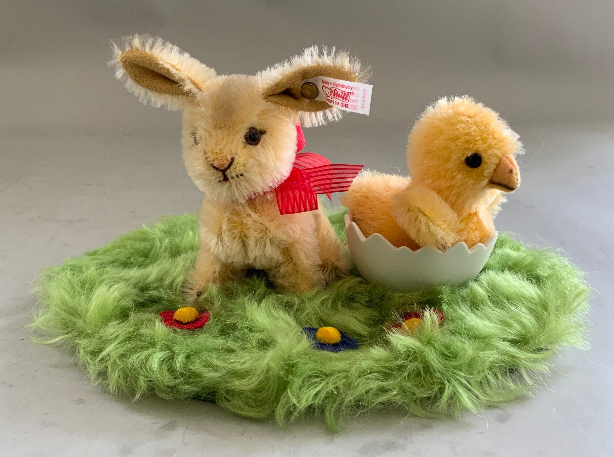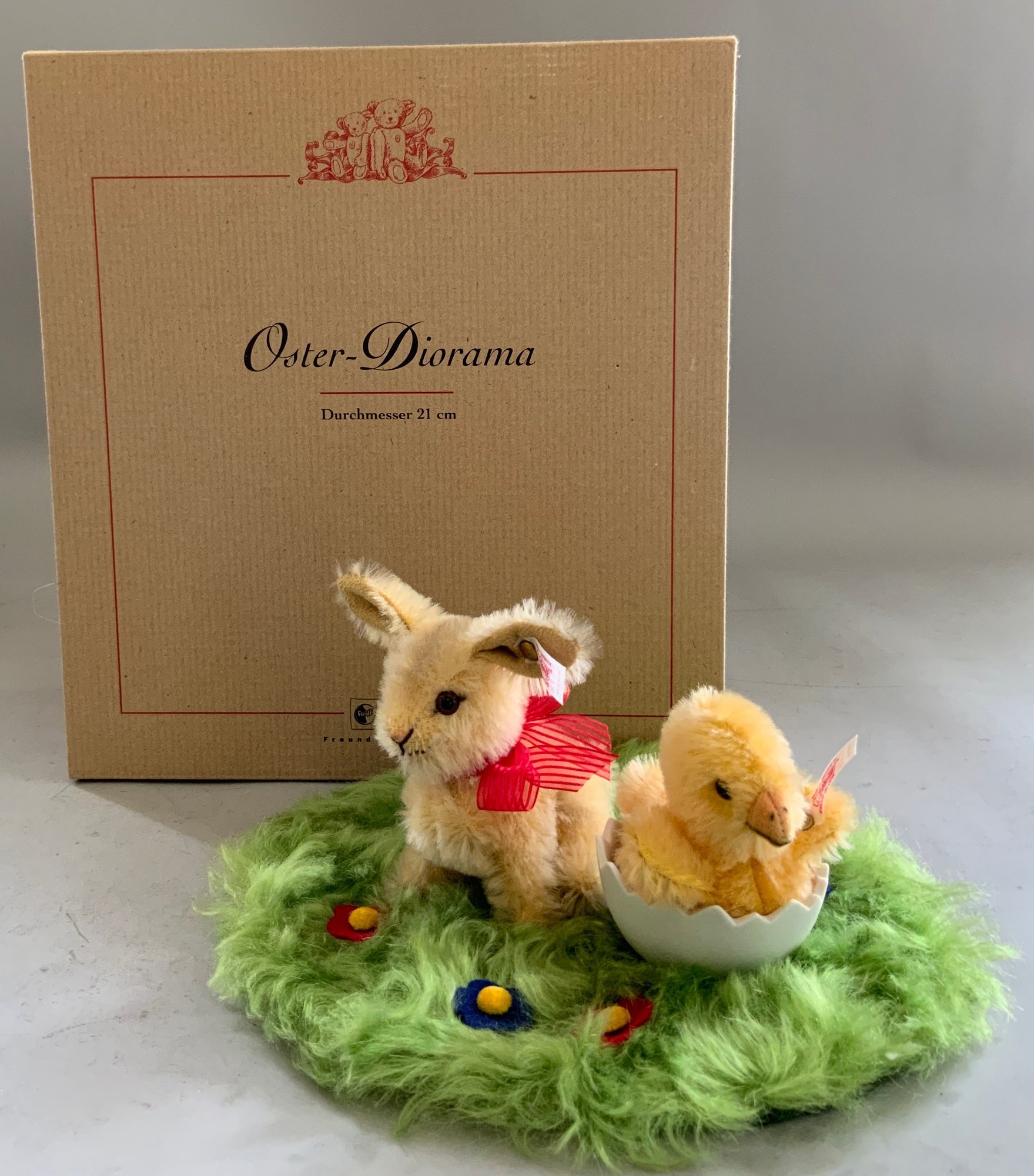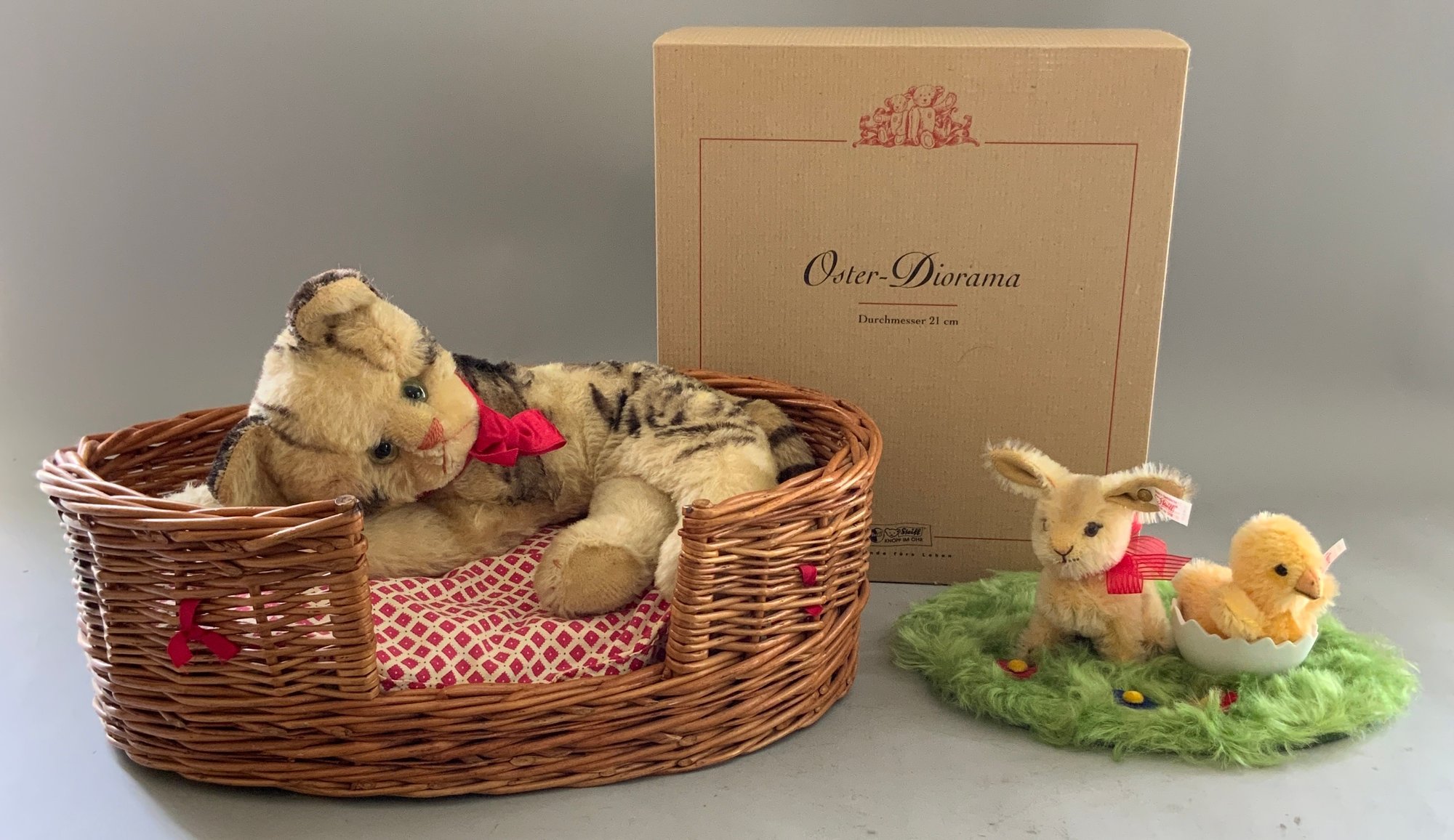 Steiff Easter Diorama chick & bunny in original box 315/2004 & Steiff “Fiffy” cat laying in a basket no button