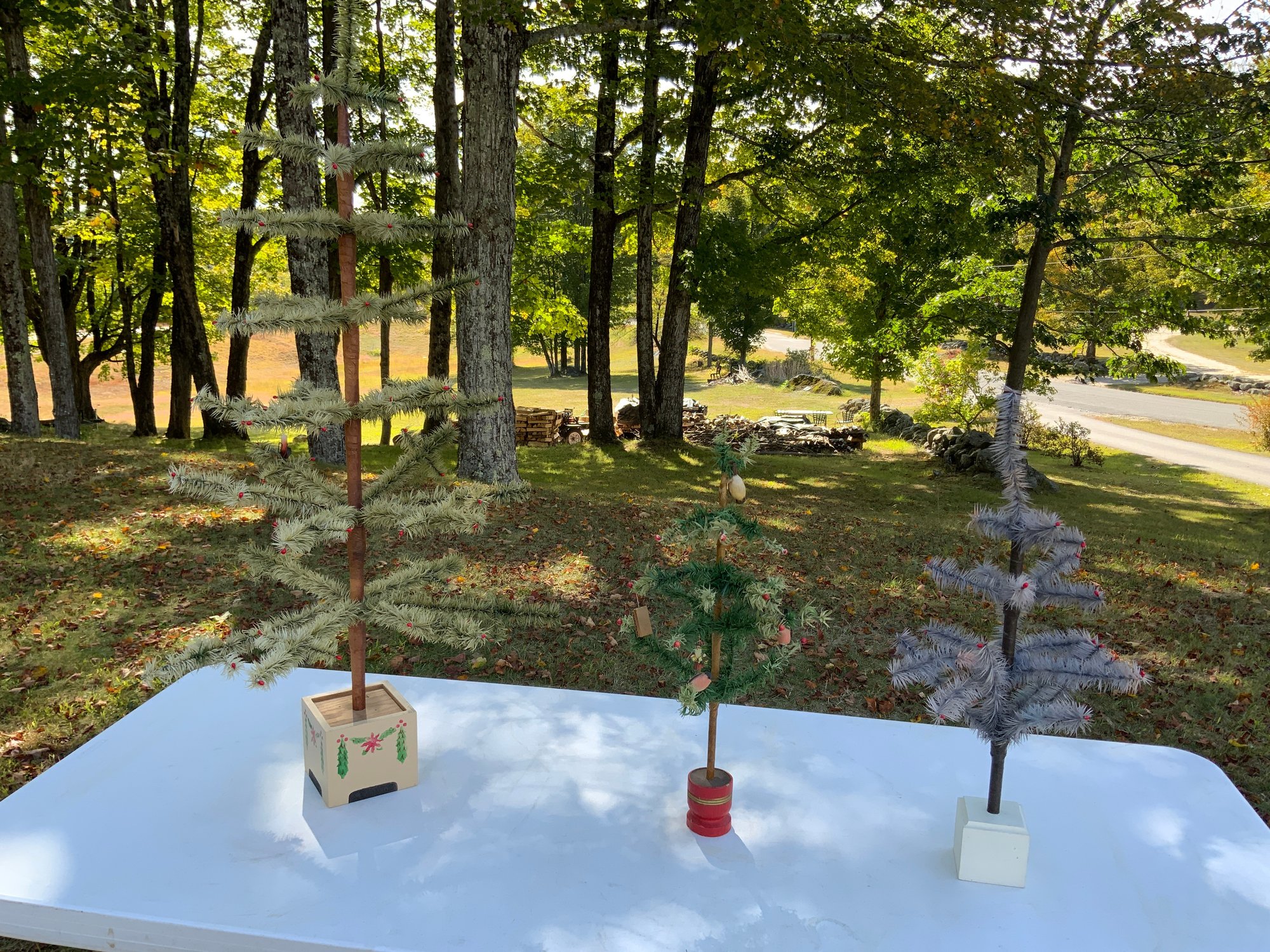 Three feather Christmas tree’s. One 23.5”x45” green feather tree with beige decorative painted square base. One 25.5”x12” grey feather tree with white square base. One 23”x10” green feather tree with circular red base with gold bands, bird ornaments and Santa ornament, not antique