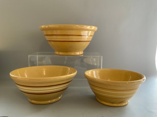 Three pieces antique yellowware mixing bowls, featuring a classic yellow glaze adorned with distinctive red and white bands. One 12.5”x6” bowl in good condition. One 10”x4.5” bowl in good condition. One 9”x4” bowl with faint red lines, some paint imperfections, in good condition as well