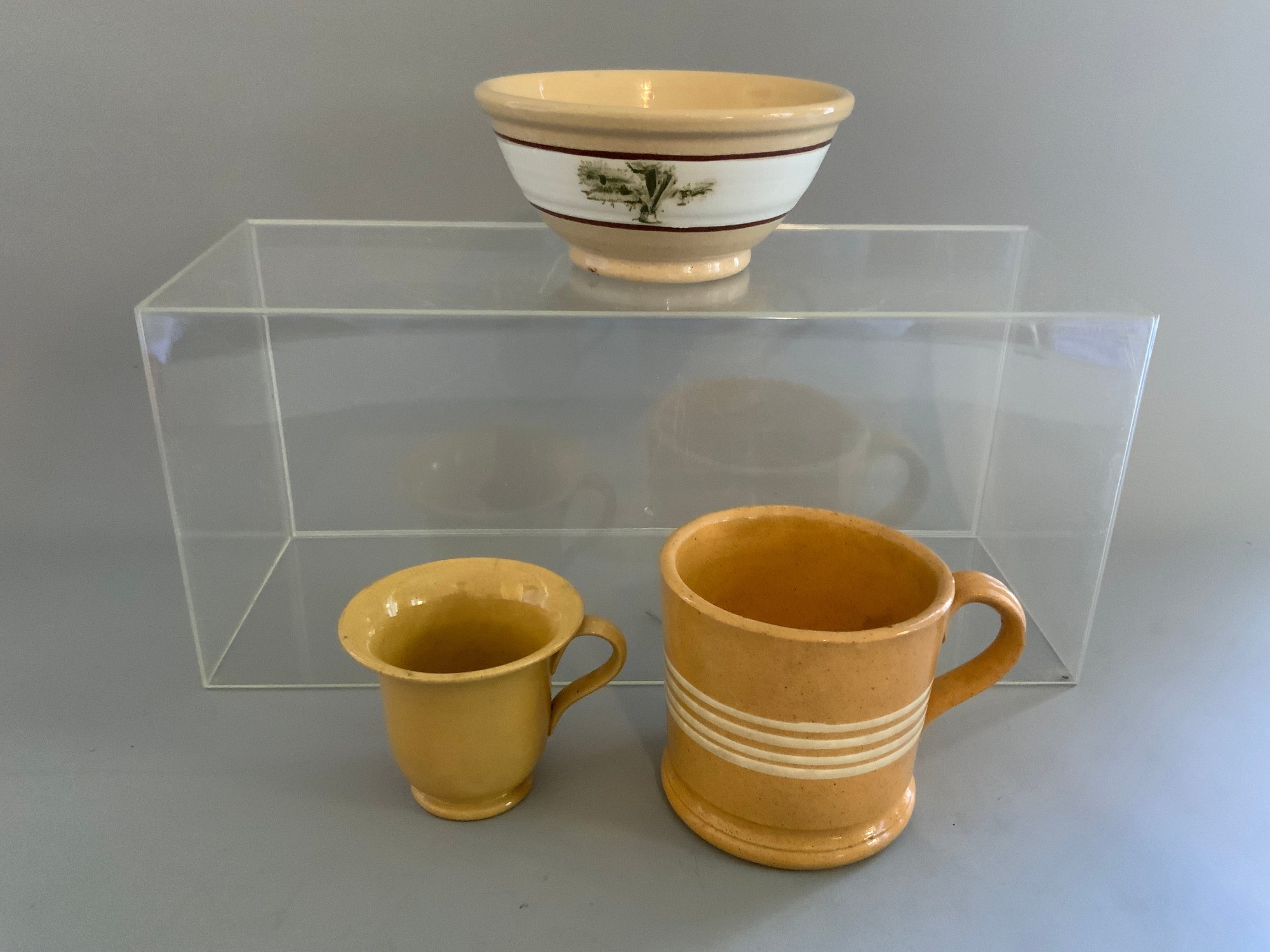 Three pieces assorted yellowware. One 4”x3.75” yellowware mug with four white bands, has a ribbed handle, overall good condition. One 6”x2.75” yellowware mixing bowl with a distinctive green seaweed or mocha decoration backed with a large white band and bordered by thin red bands, good condition. One 2.5”x3” yellowware fluted cup with decorative handles in a leaf pattern, good condition.