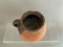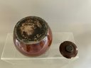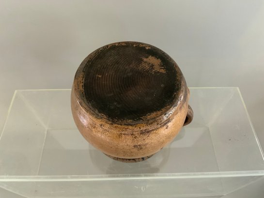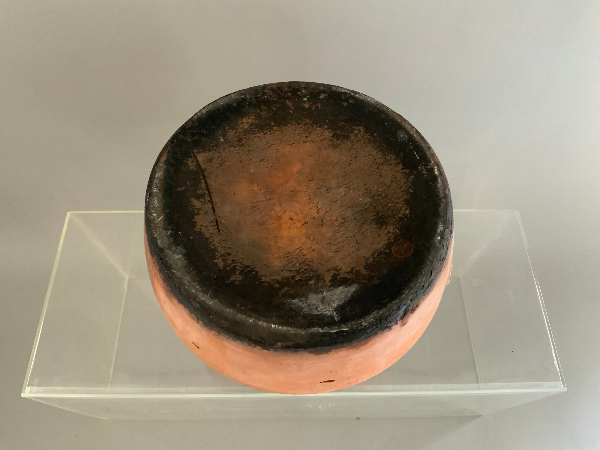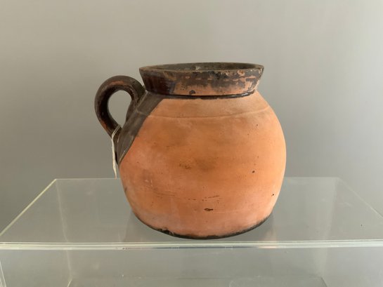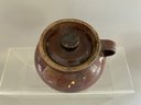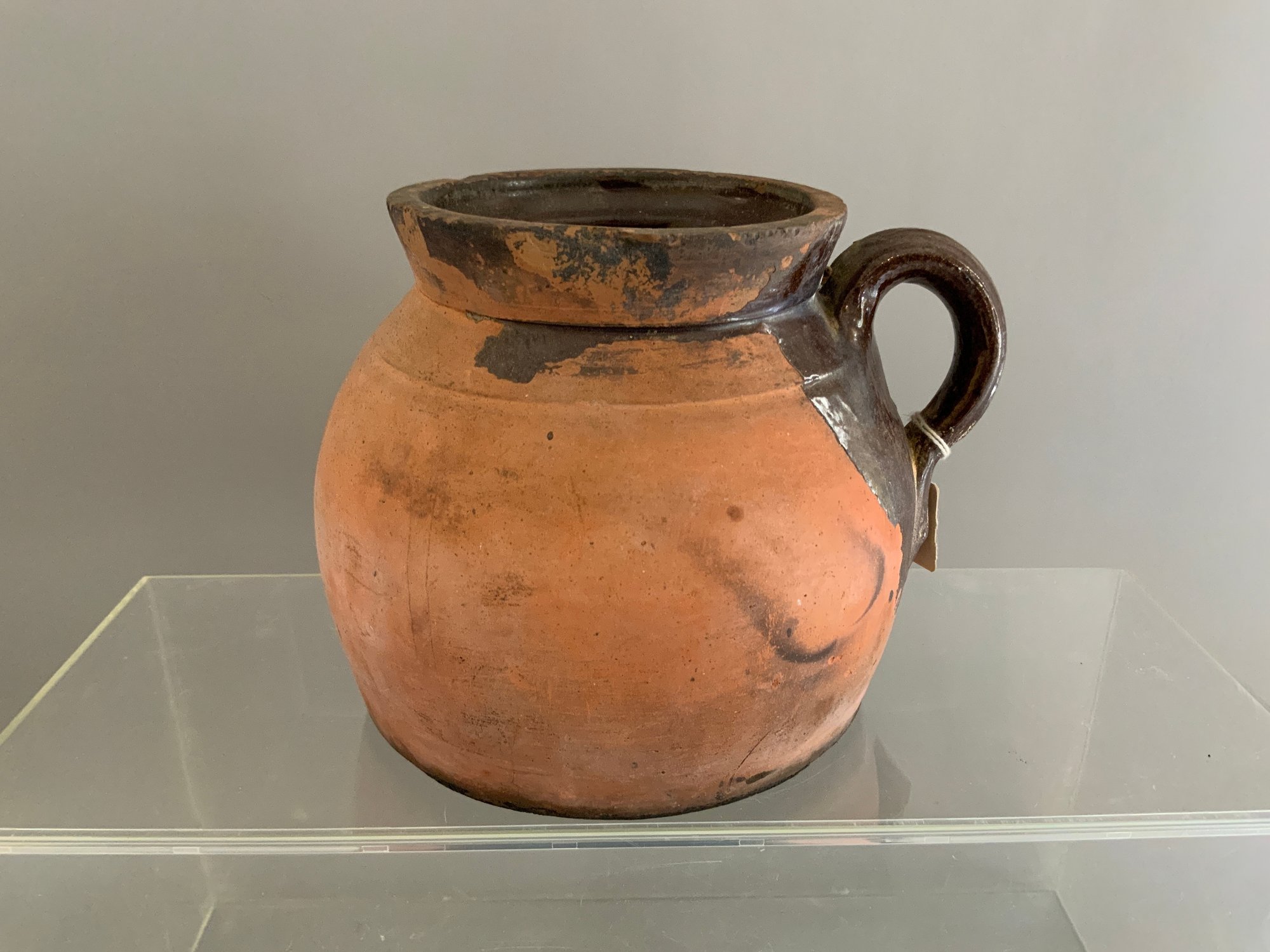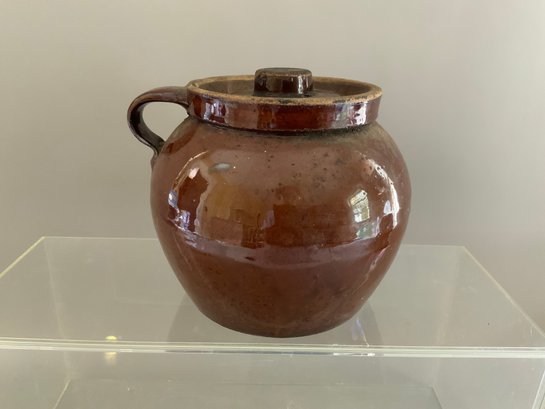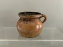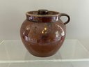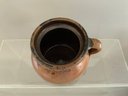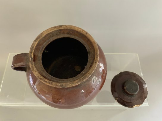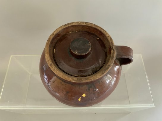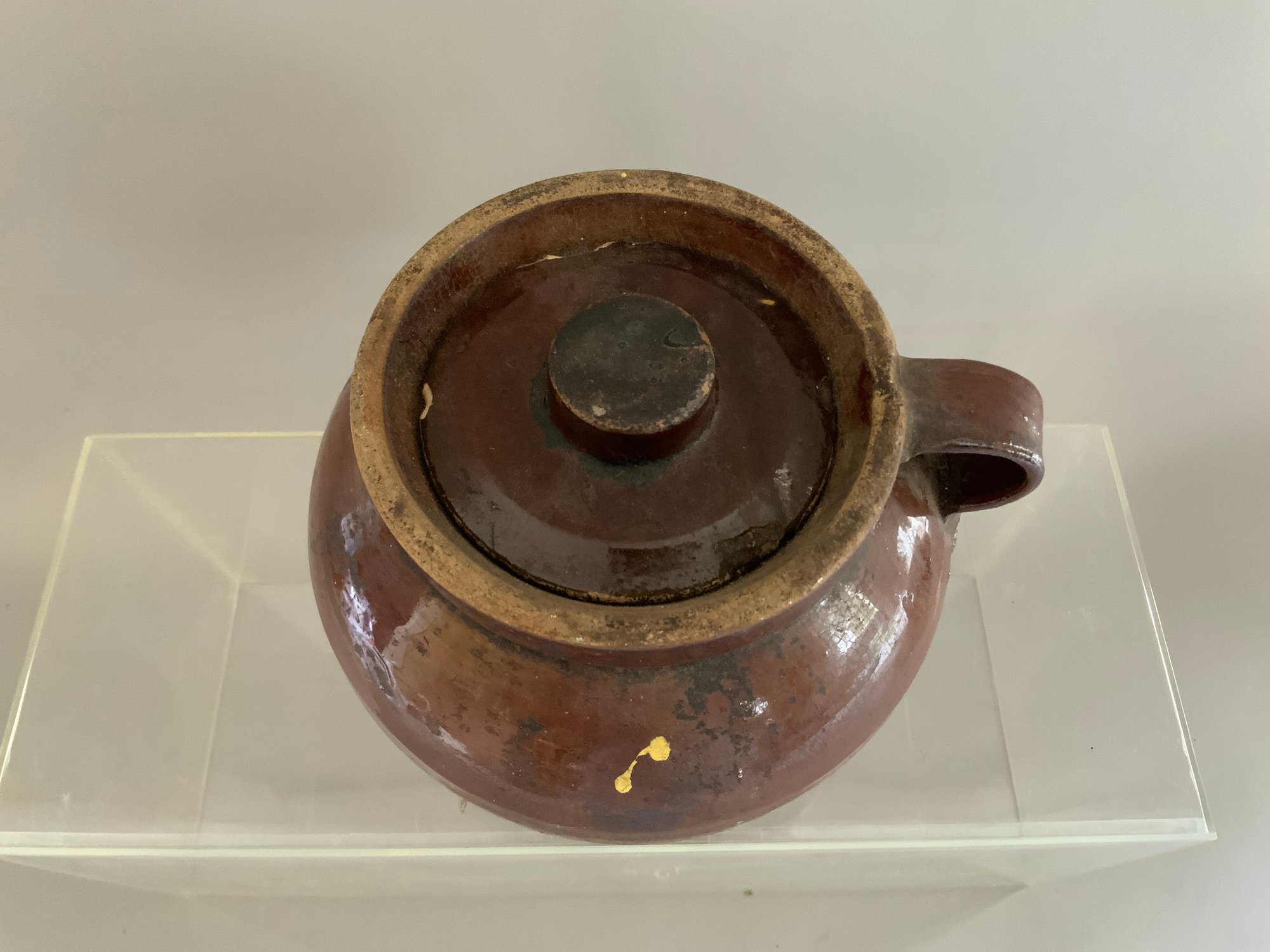 Three pieces redware. One 6”x8” pot with glaze flaws and chips. One 6”x7” glazed pot with lid, lid is chipped, pot is in overall good condition. One 5”x6” pot in overall good condition.