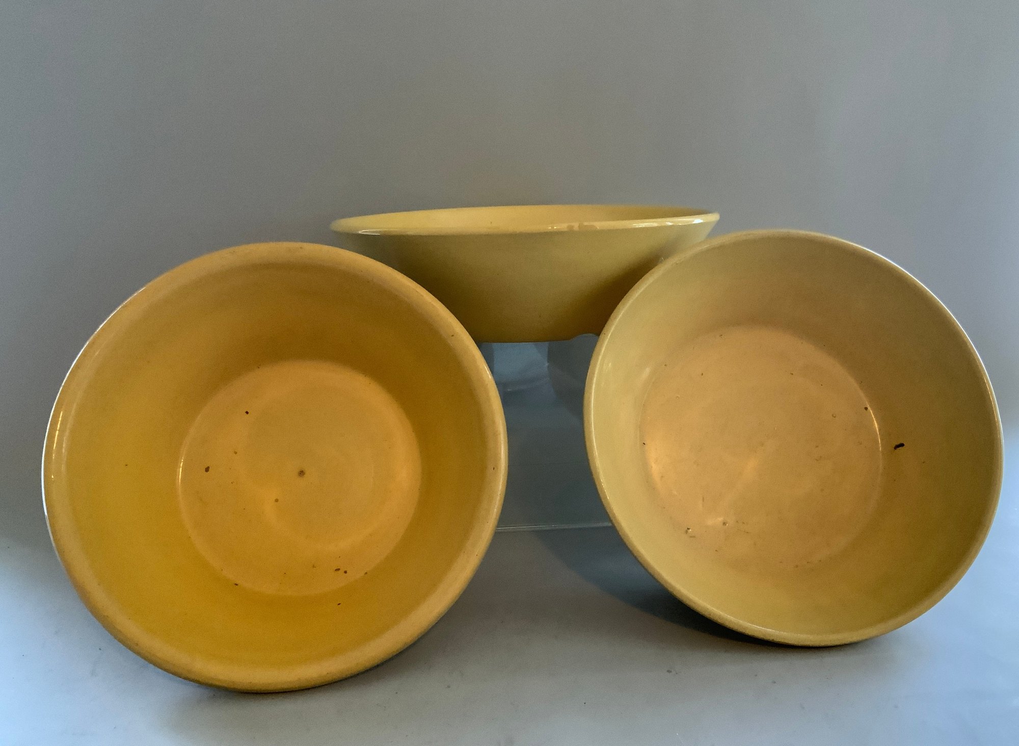 Three pieces yellowware mixing bowls. One 12”x4.5” bowl with firing flaws. One 12”x3.5” bowl with firing flaws. One 13”x3.5” bowl with firing flaws, five notches at bottom of bowl.