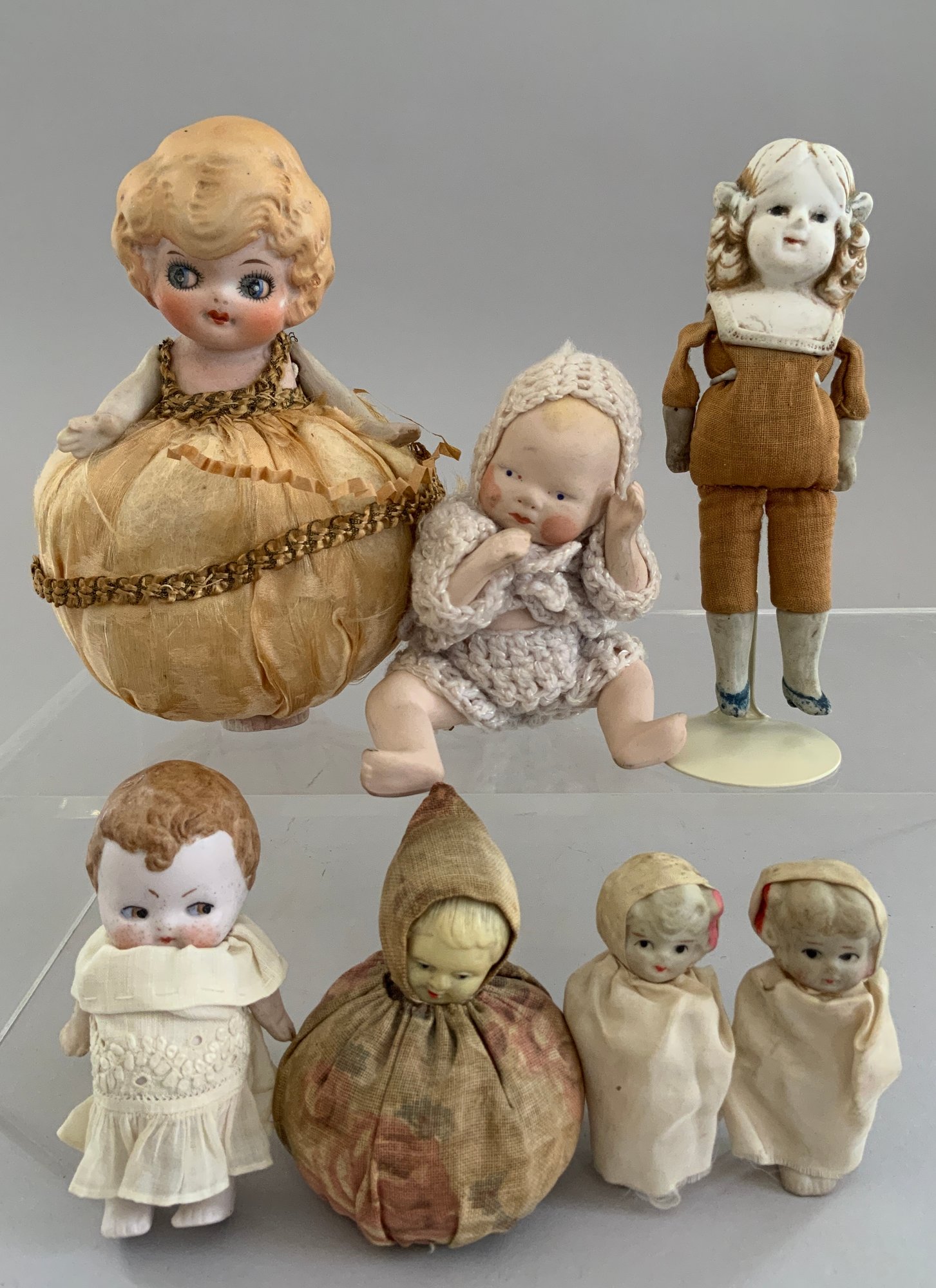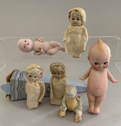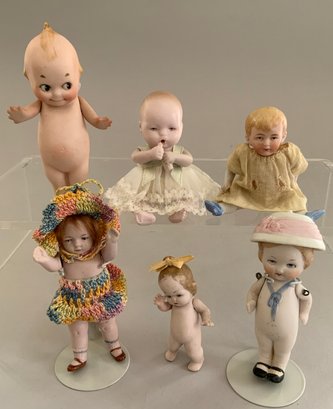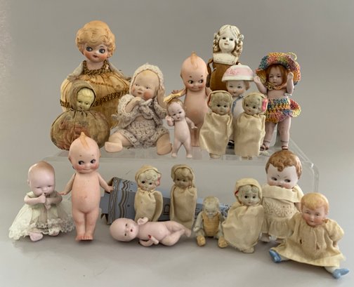 Tray lot of 19 small all bisque dolls 2 ½” – 5” tall, various forms including 2 Kewpies & 2 – pin cushions
