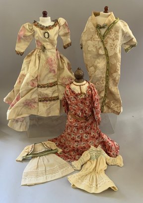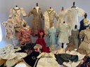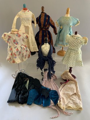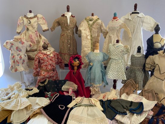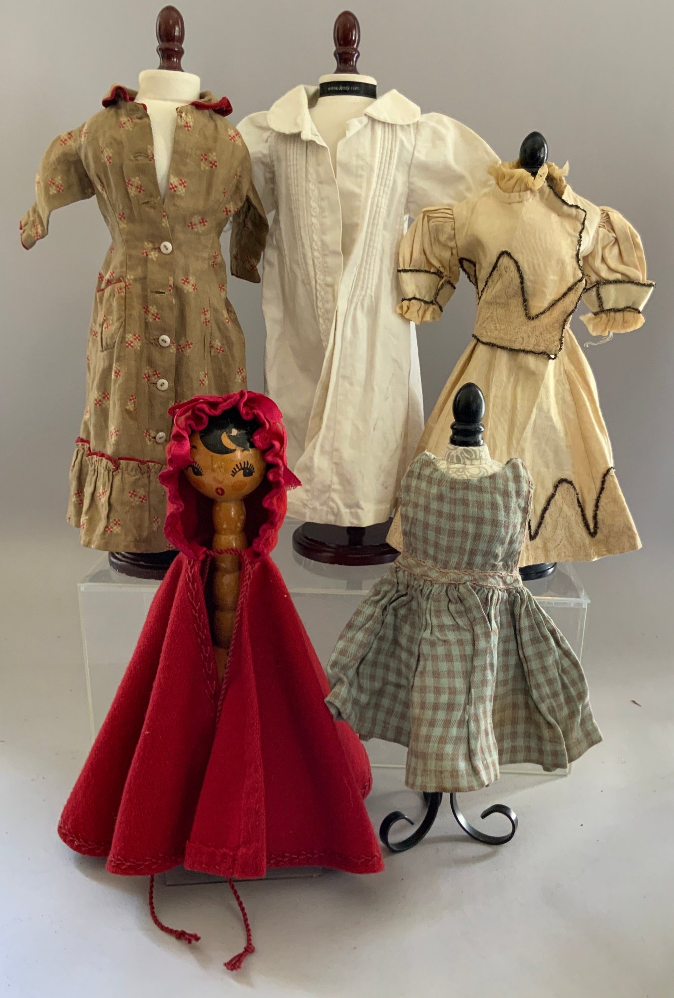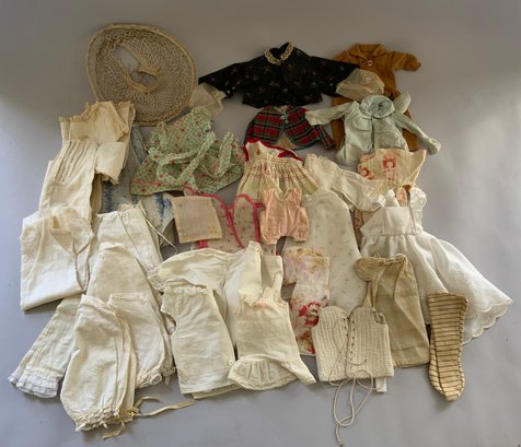 Tray lot of antique doll clothes, assorted sizes & forms, etc.