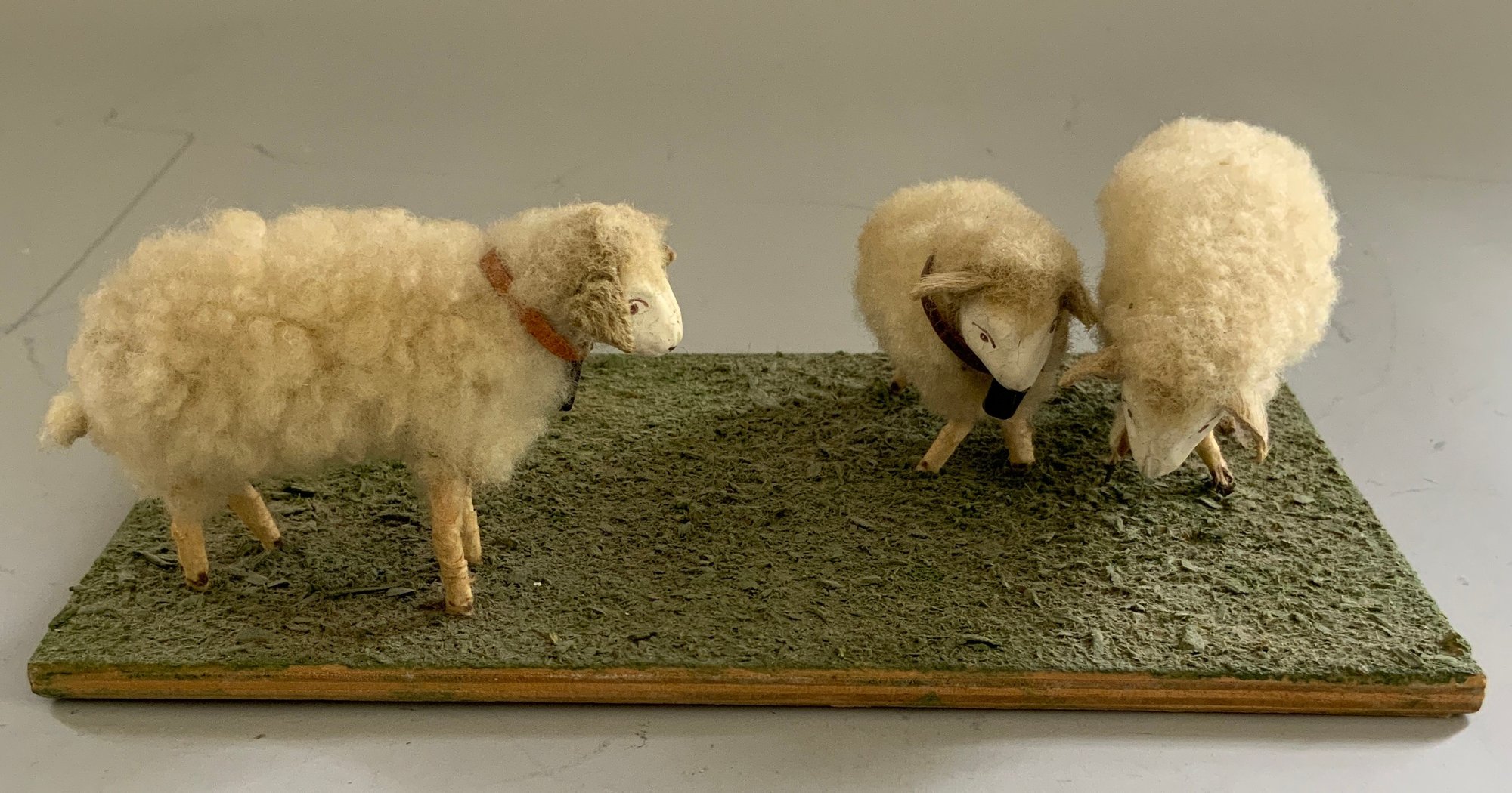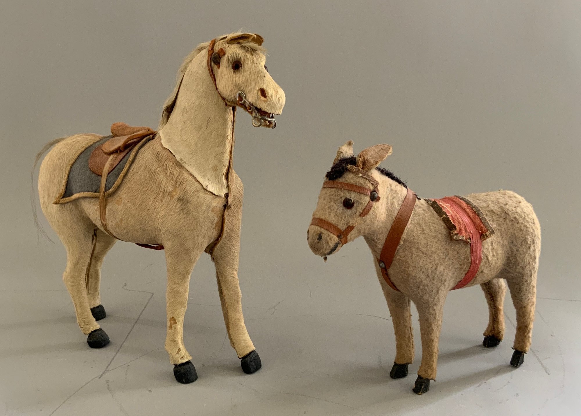 Tudor style stable with 3 bays, red roofs, exterior stairs, 22 ½” long x 9” wide x 21”tall, with3 sheep, horse pull toy, donkey, & skin horse, played with condition