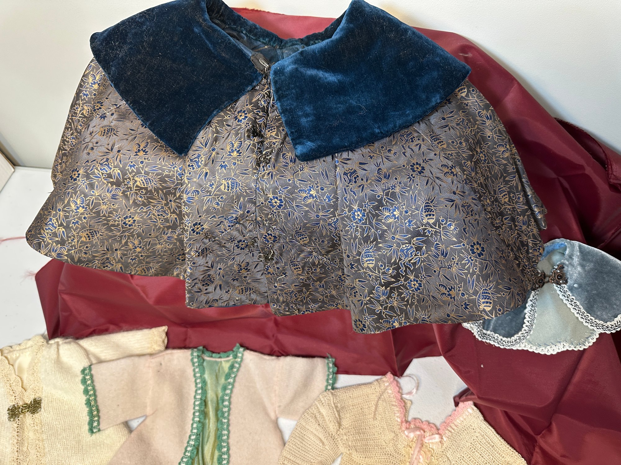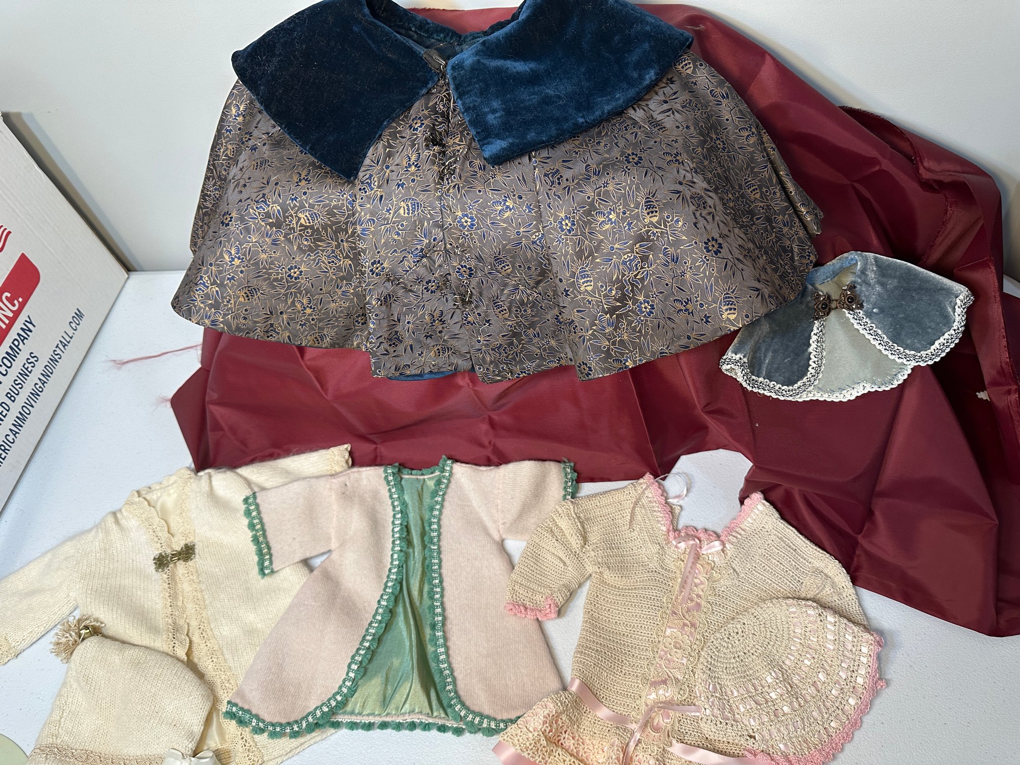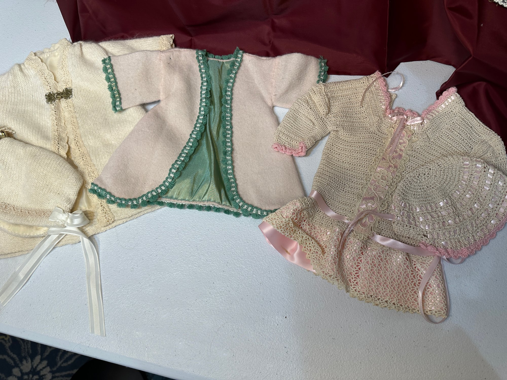 Two doll capes, off white coat and hat, pink crochet dress and hat, green and pink jacket