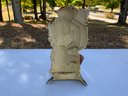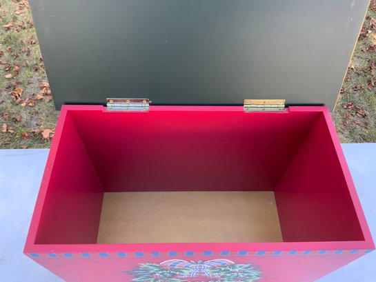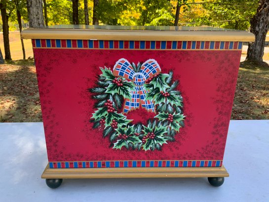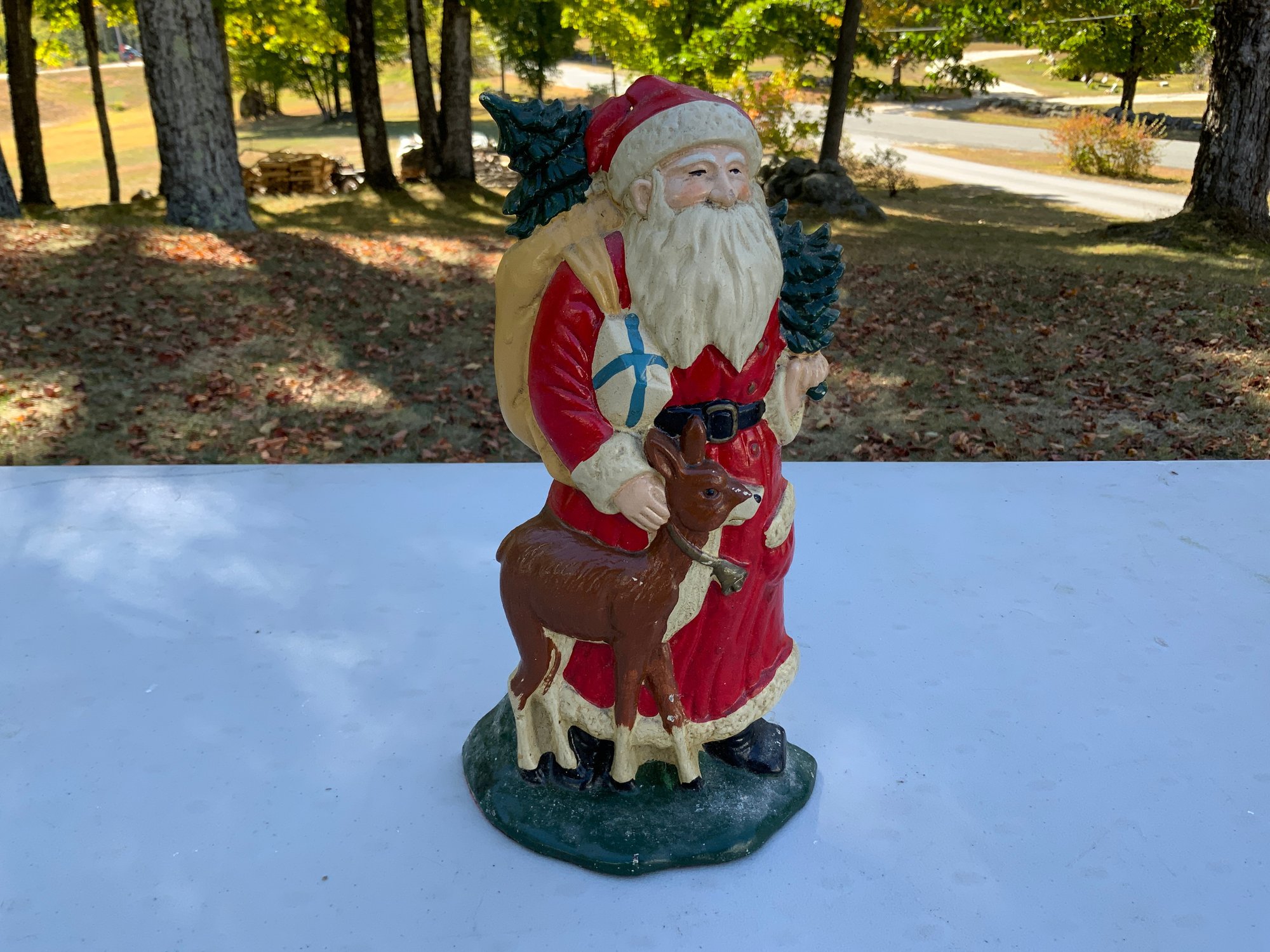 Two pieces Christmas items. One 10.5”x4.5 cast iron Santa Claus door stop. One 16”x13”x9.25”decorated Christmas Tree Shops Christmas box.