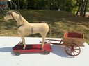 Two pieces horse and wagon. One 21”x20.5” white painted horse on wheels, body shows signs of wear and missing pieces of tack, hair mane and tail, “Converse” stamp on platform, paint shows signs of wear. One 26”x10” wagon with brown and red paint, signs of wear throughout. Unclear if wagon and horse go together.
