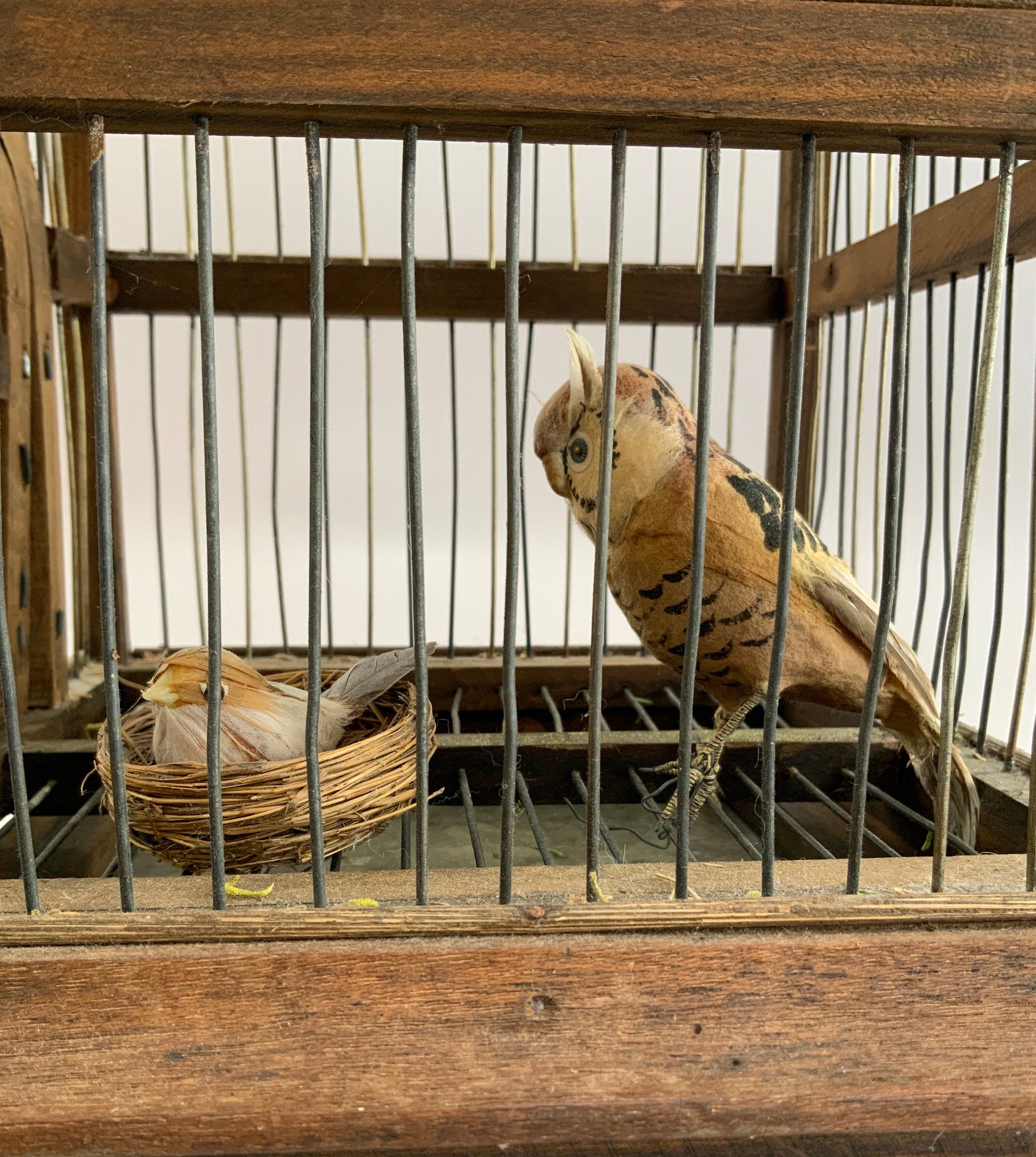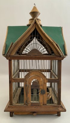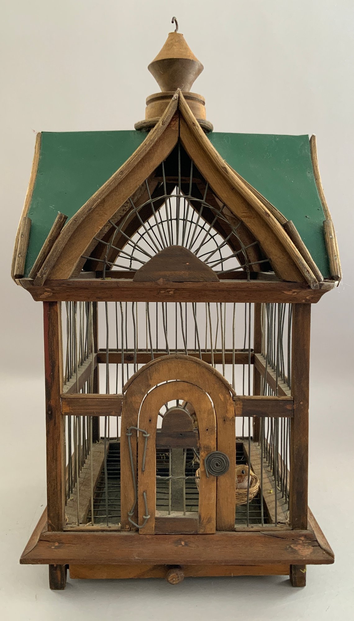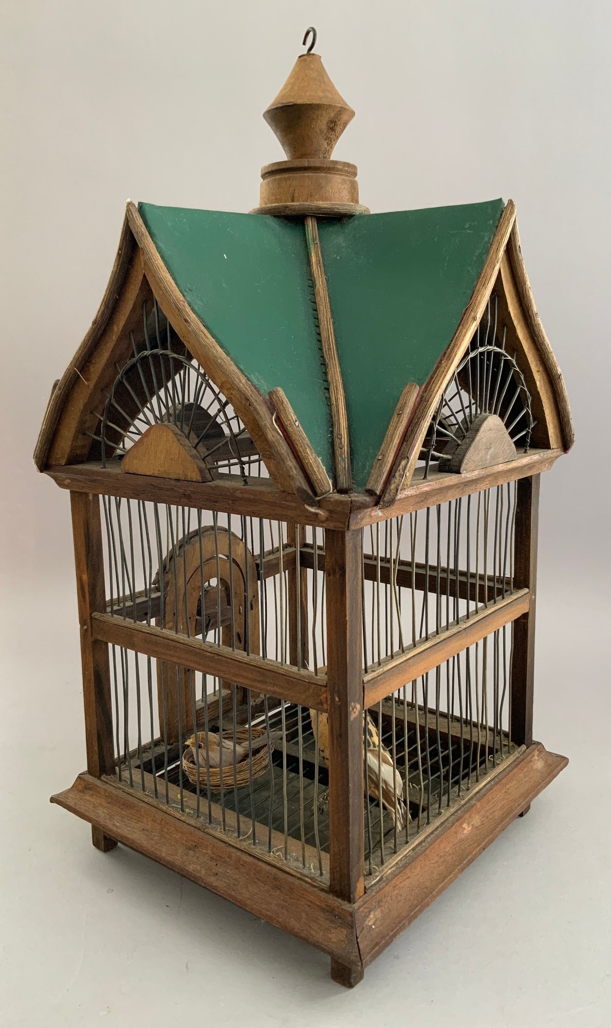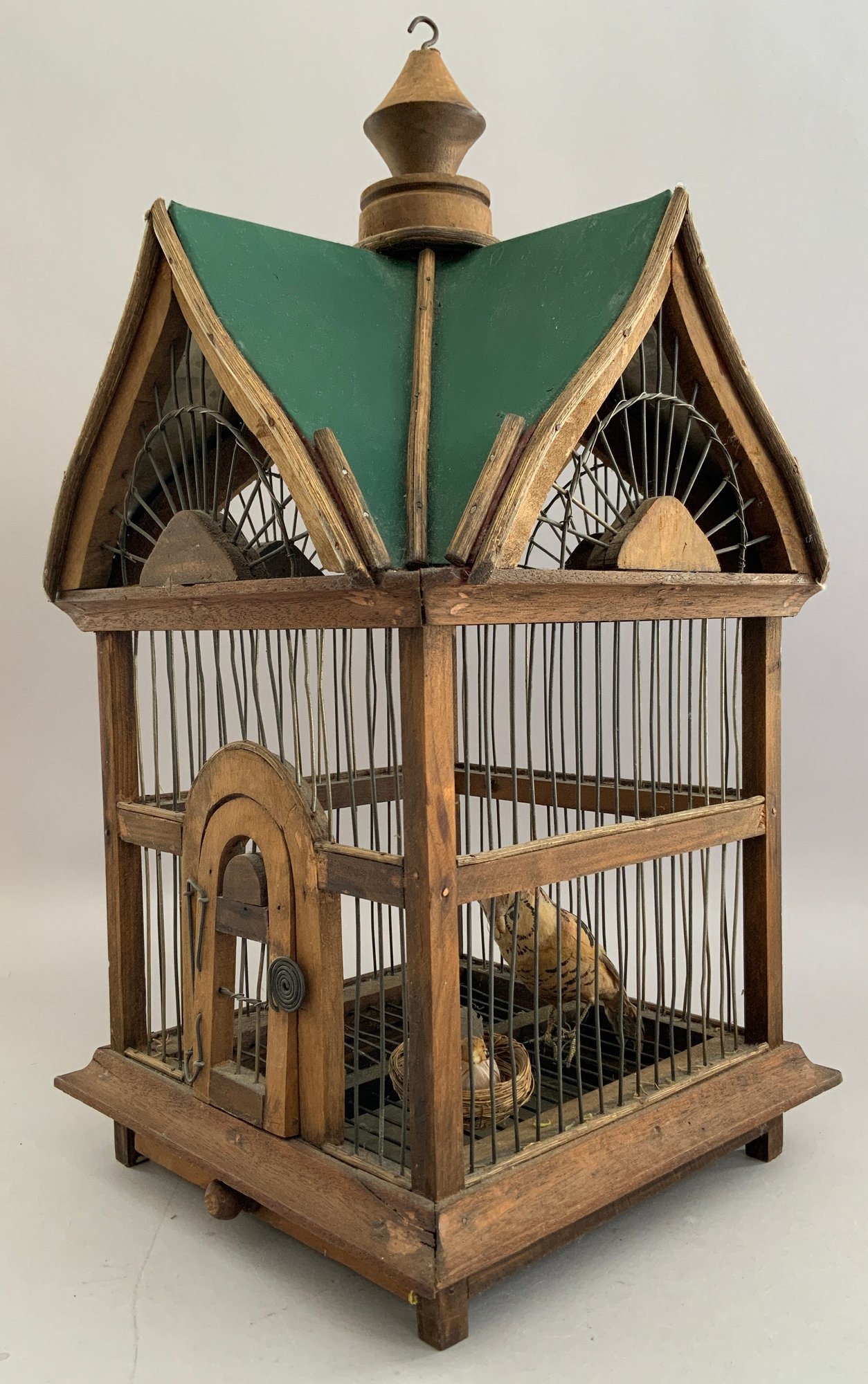 Vintage wood & wire 4 gable roof bird cage, 10 ½” square x 23” tall, single door wit nest eggs, & 2 birds, 4 green tin gable roofs