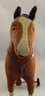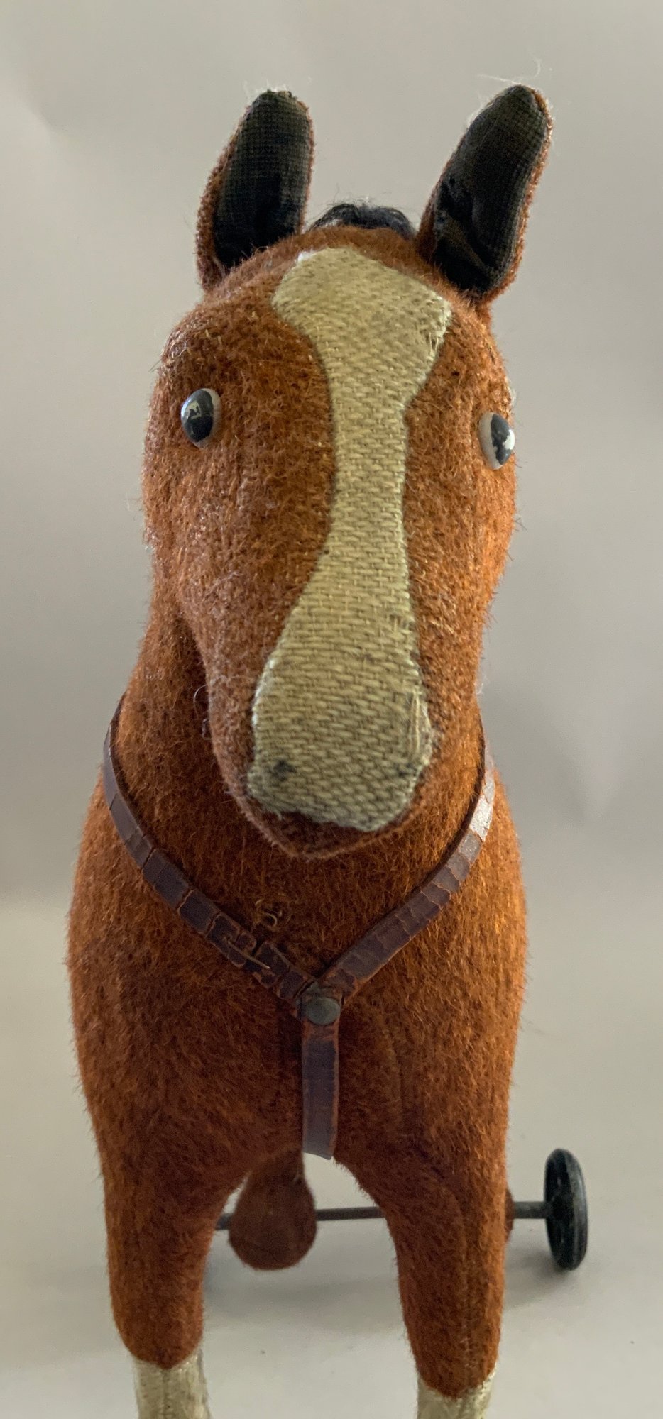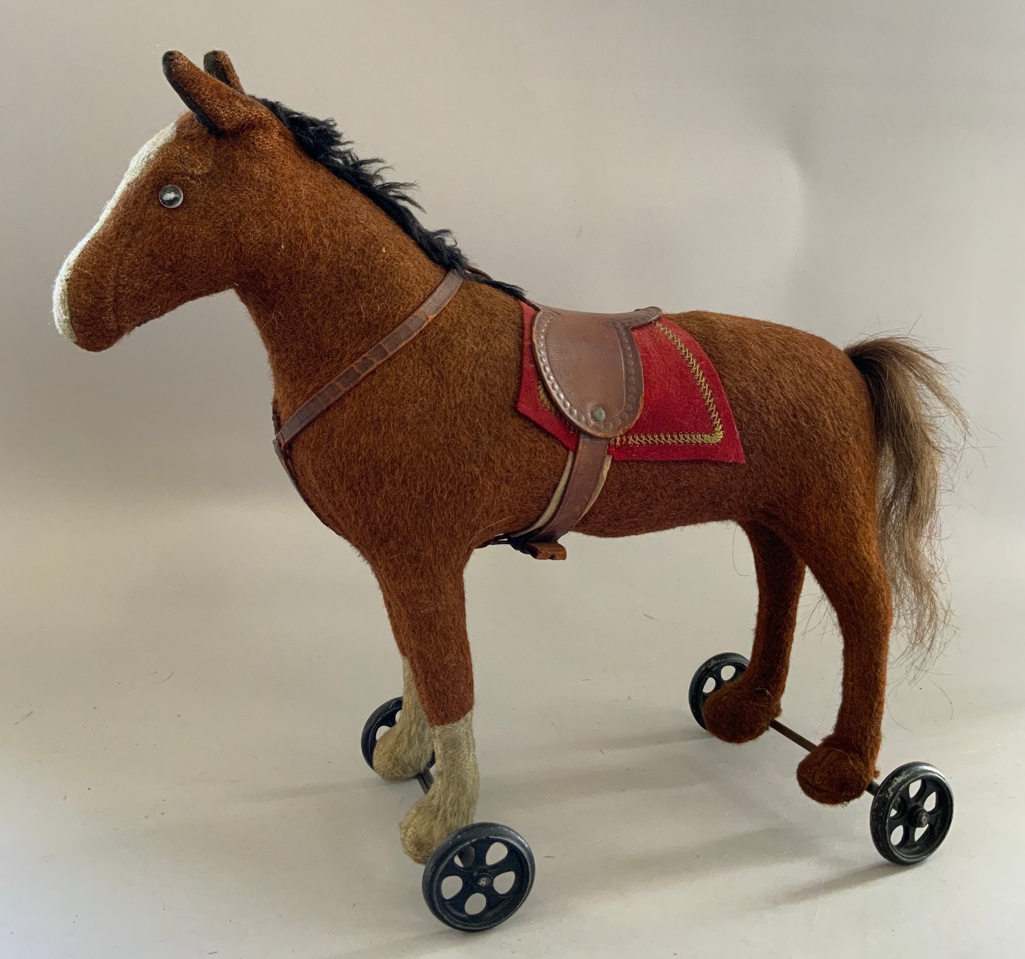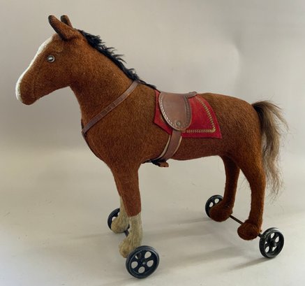 Vintage wool-covered Horse-on-wheels, Hair tail & yarn mane, 16” L x 16” T, Leather saddle & tack, Cast Iron wheels, painted button eyes, (worn, shelf dust, as-is)