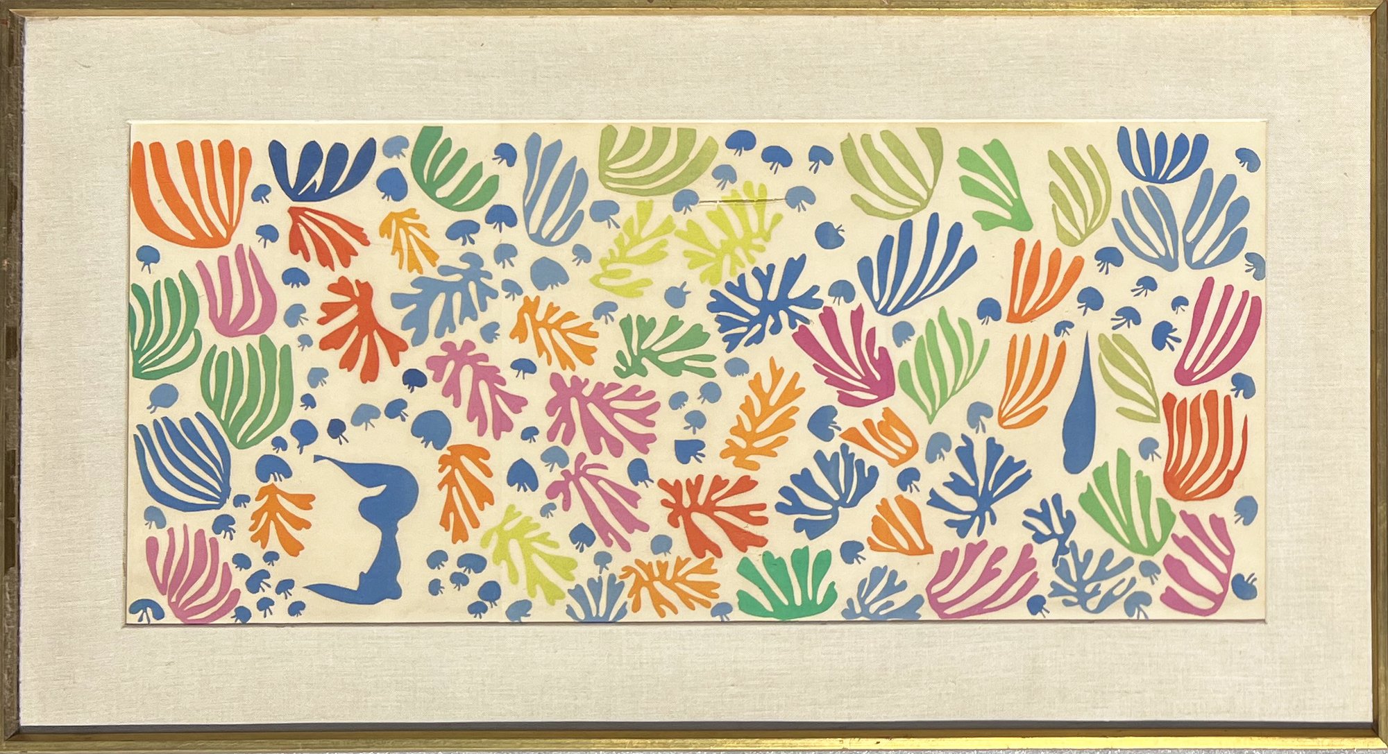 Galerie Moderne at Brentano's label verso indicating "Acanthus Leaf Cut Out reproduced by Mourlot Lithograph". Frame size: 20 1/8" high, 37 1/8" wide. Waviness, frame losses. Not examined out of frame.