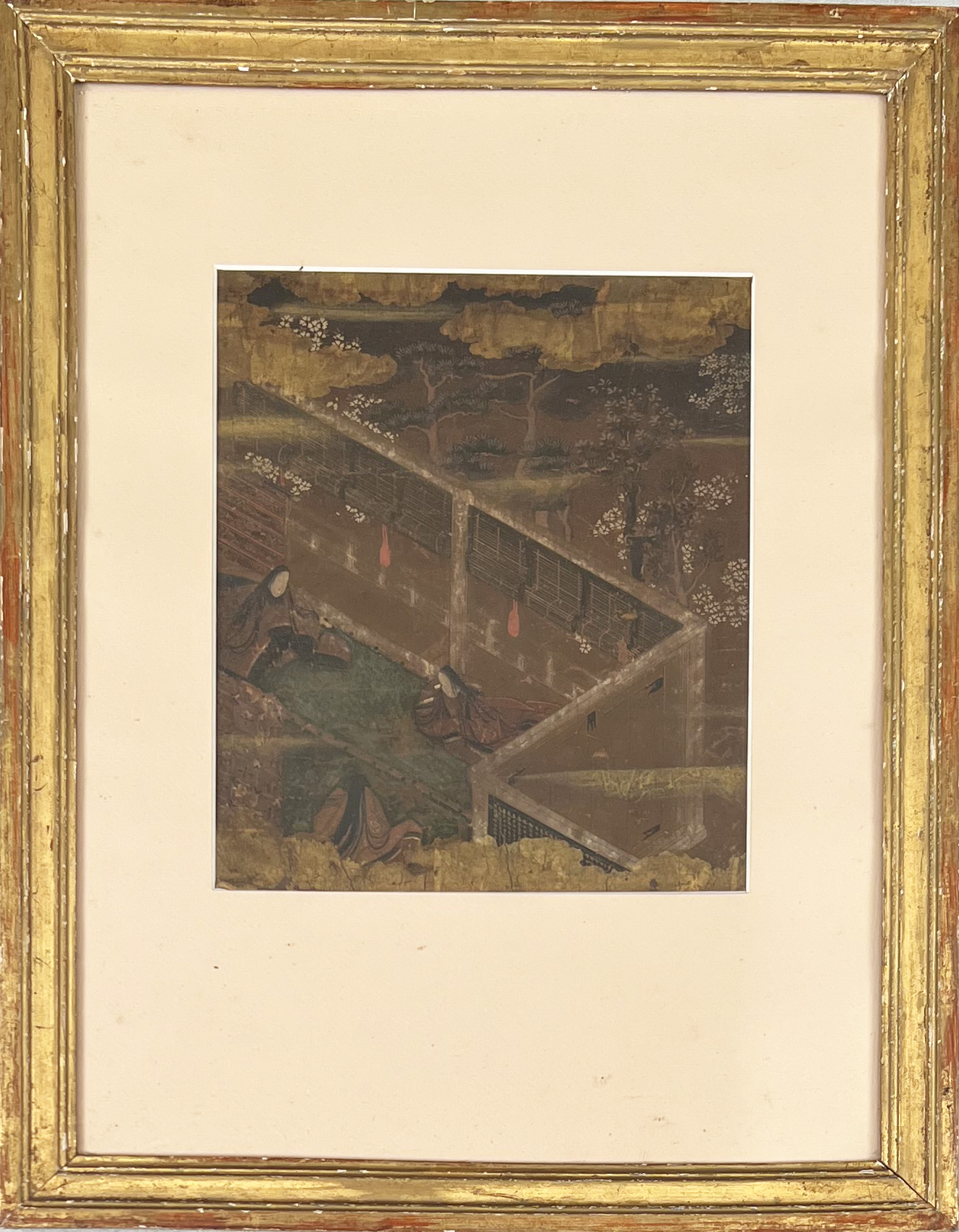three women in courtyard scene with gold painted details. Frame size: 19 1/4" high, 5 1/8" wide. Small losses. Not examined out of frame.