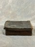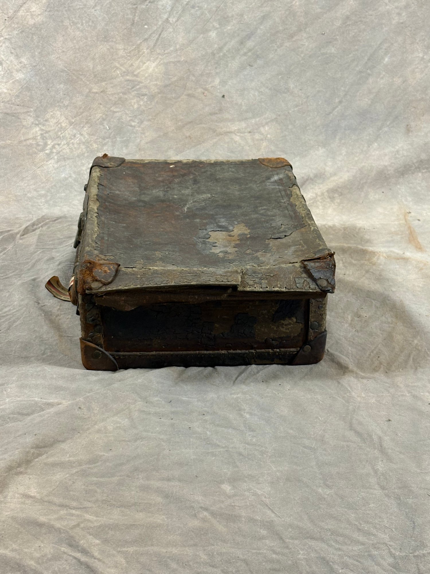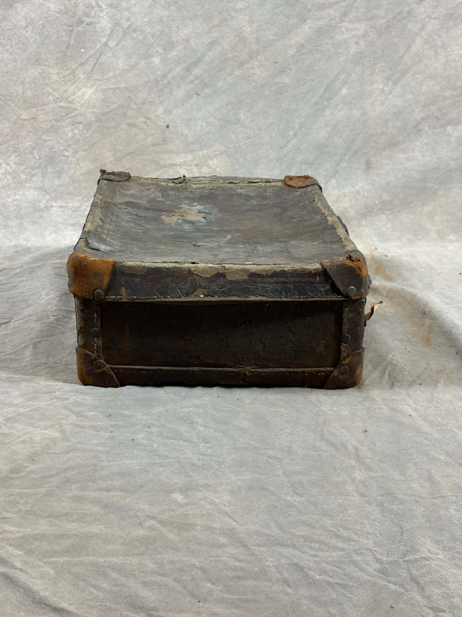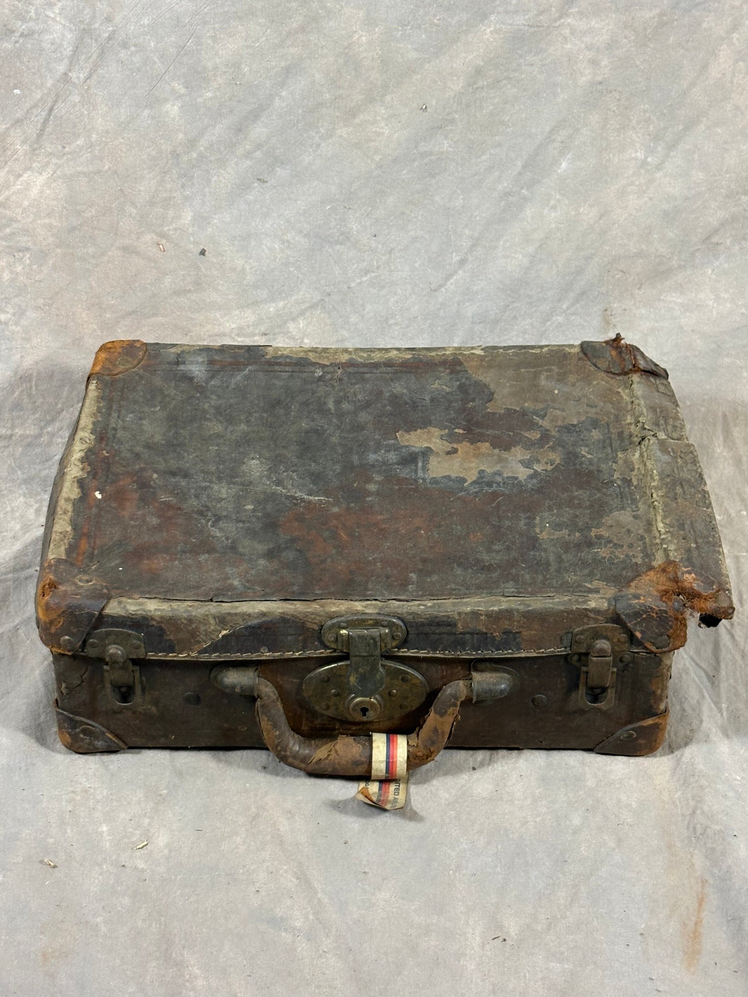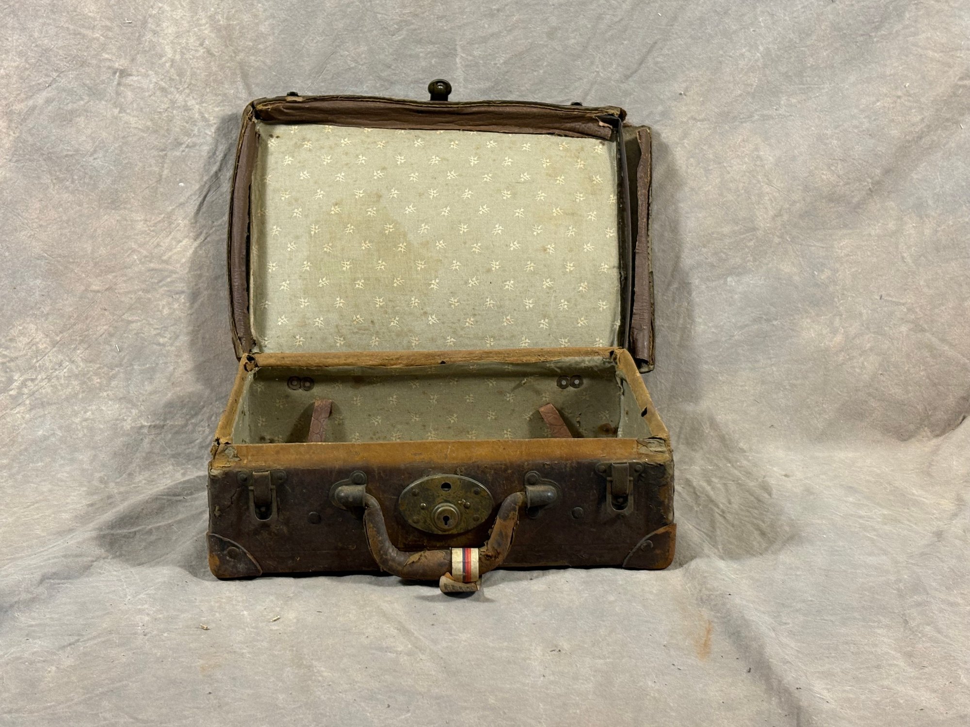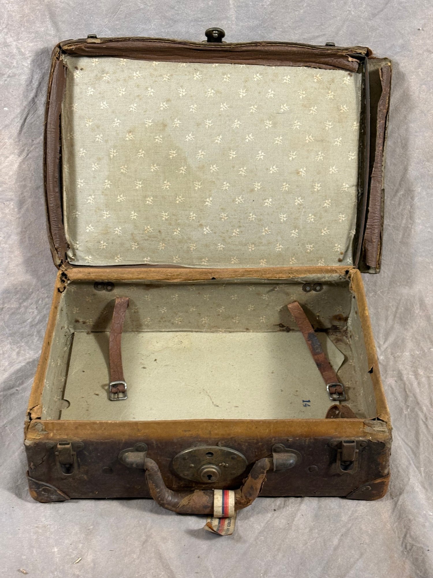 Antique leather suitcase with straps and design inside one side of top is flipped up as seen in pictures