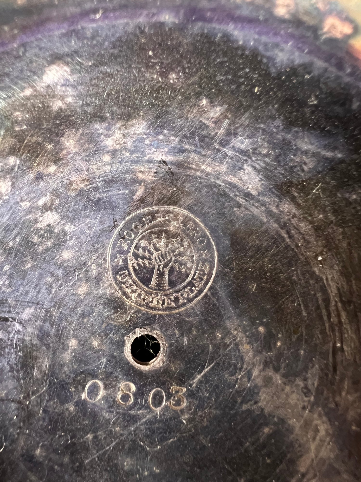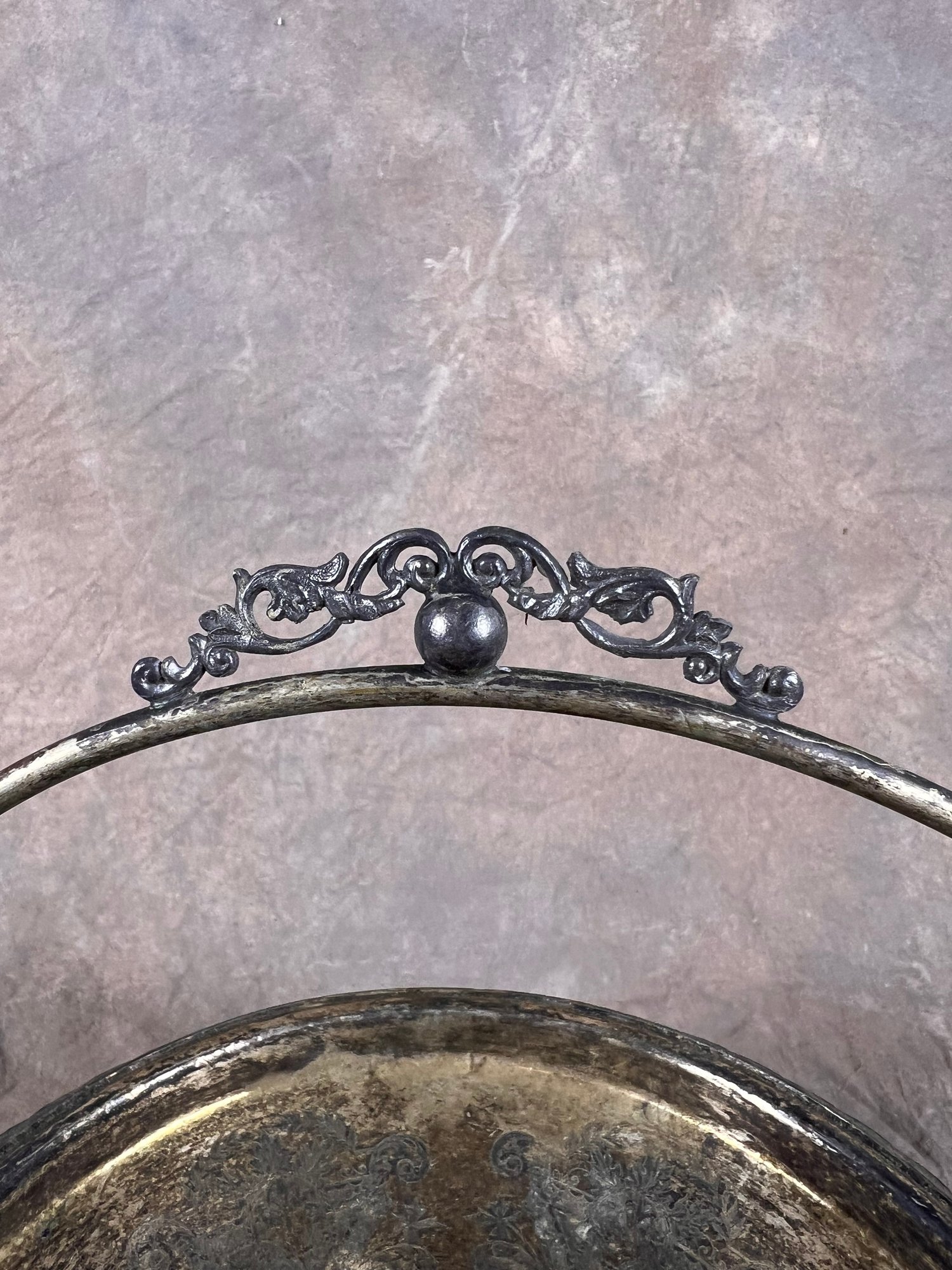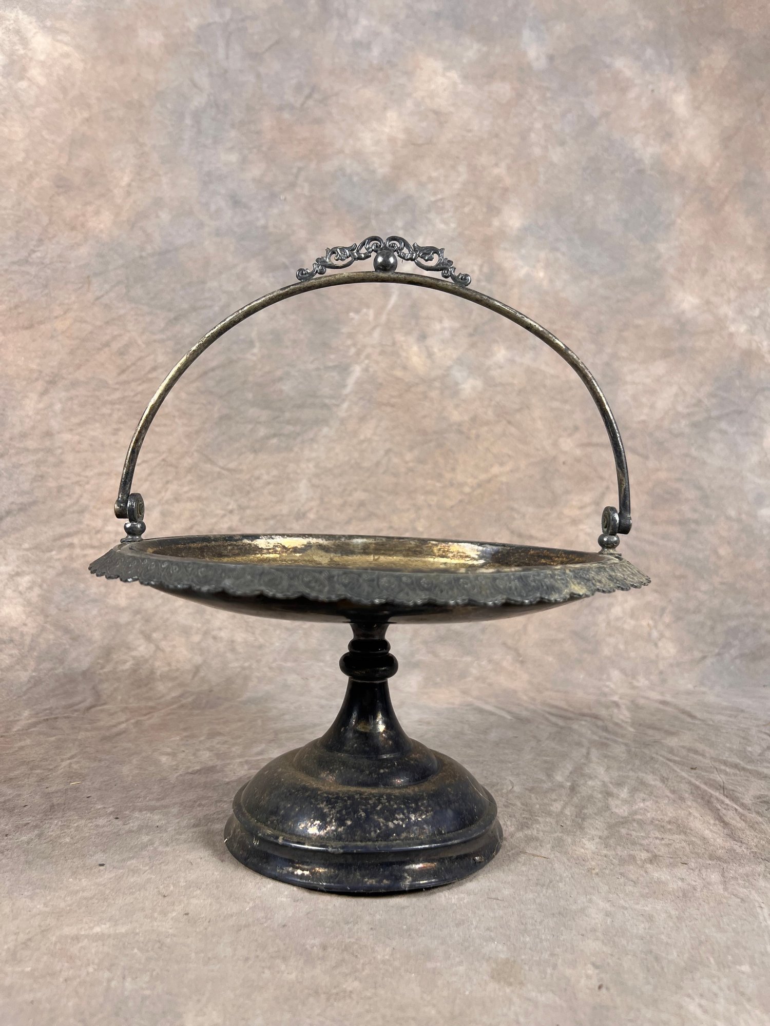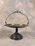 antique serving platter with handle and detailed ruffle edges, in good condition.