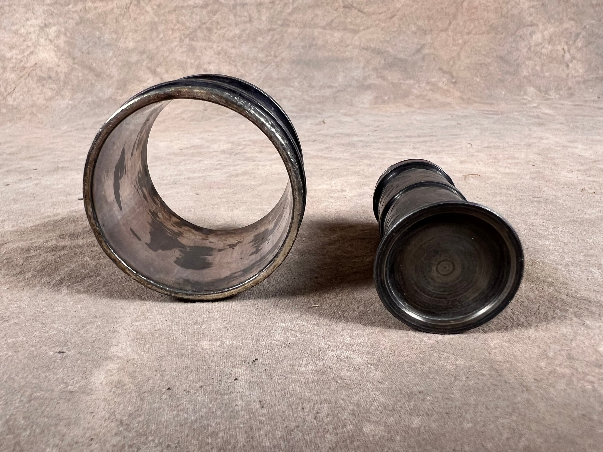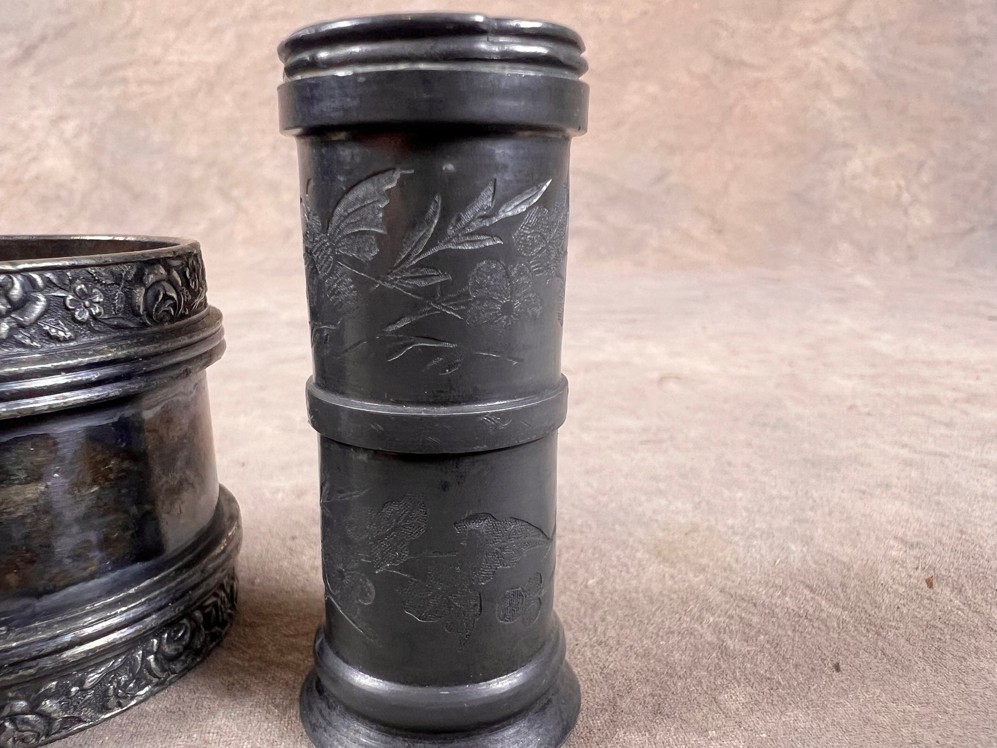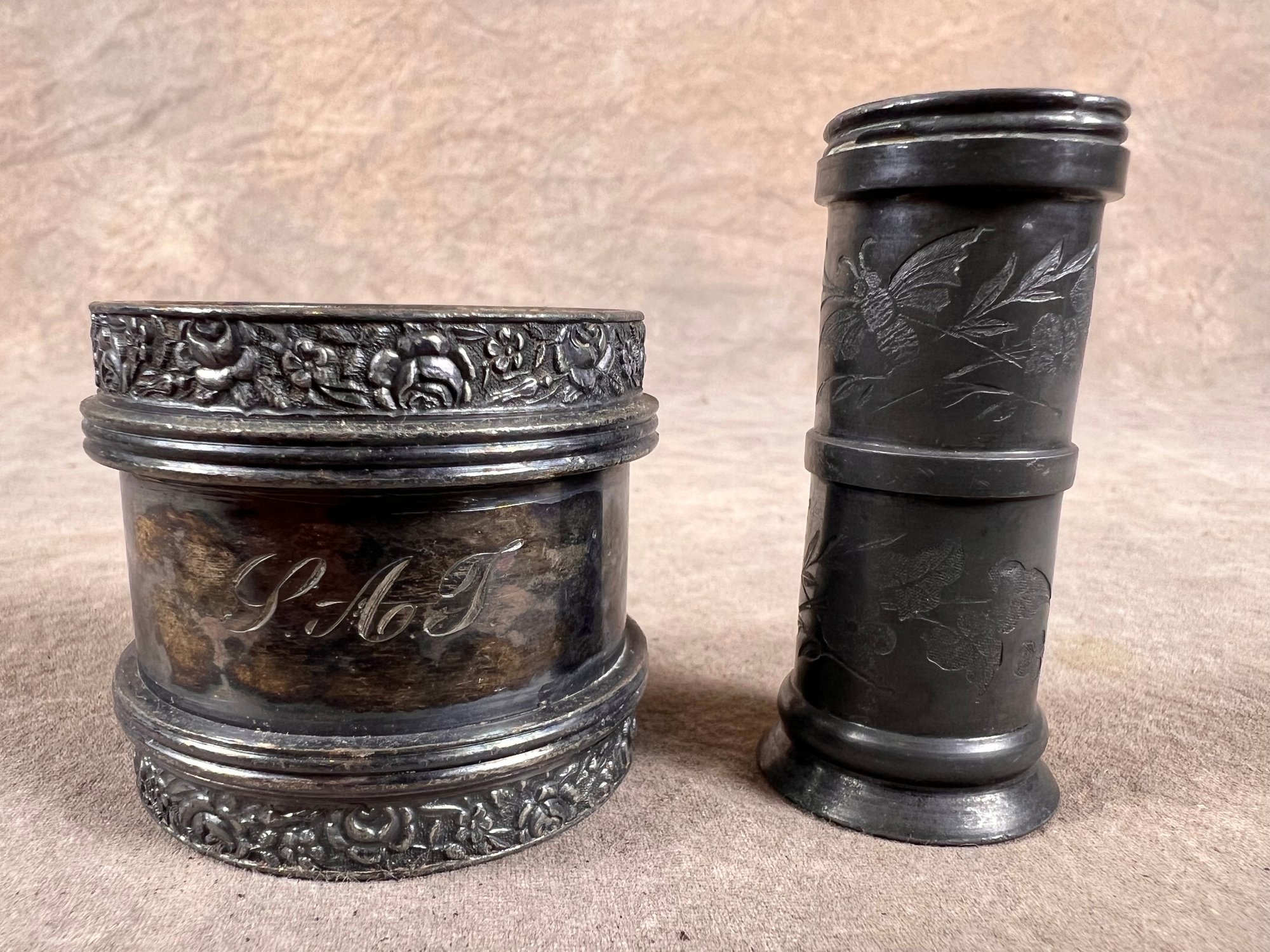 antique silver plated napkin rings with floral design, in good condition, one etched "P.A.J"