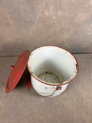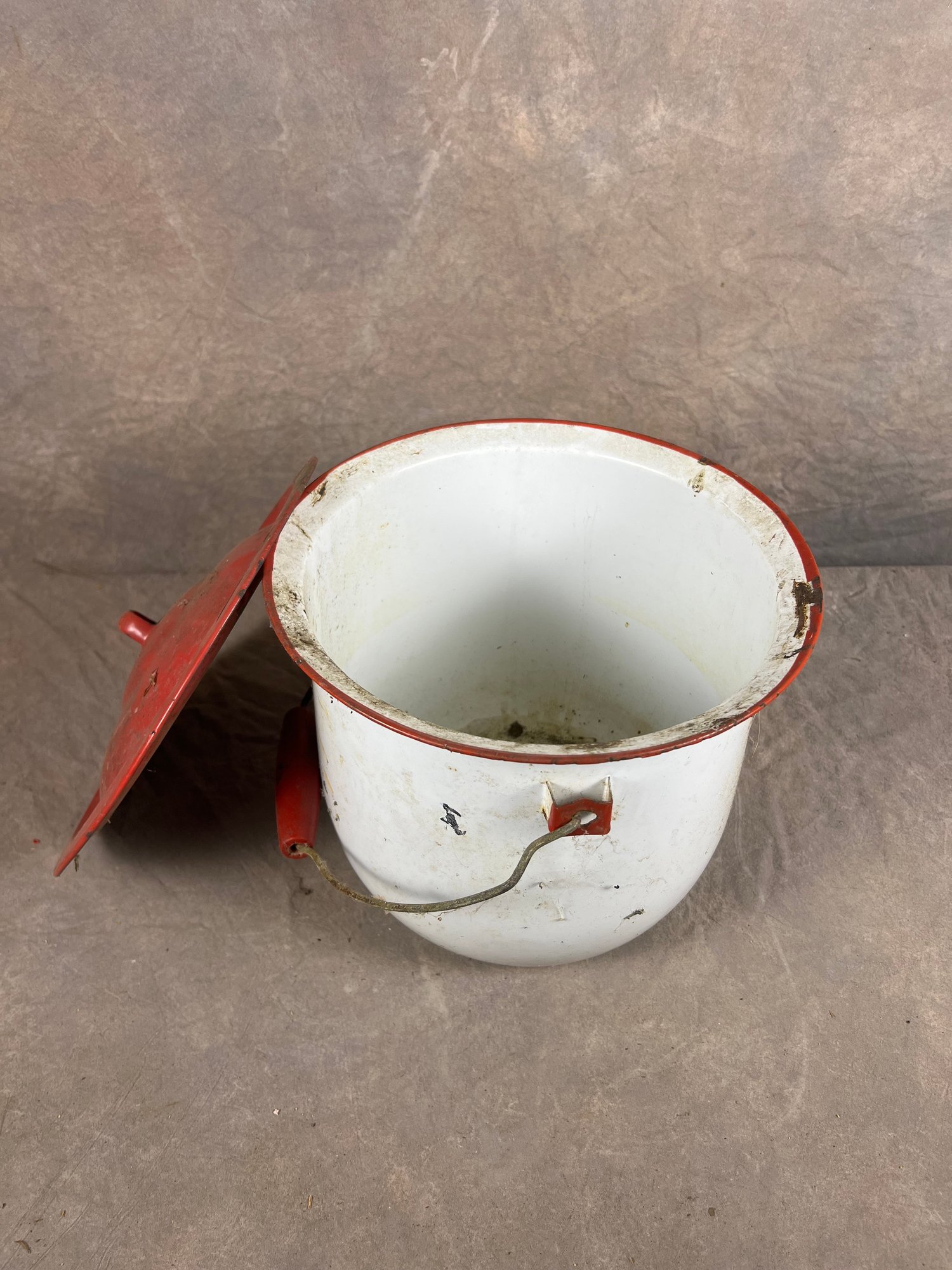 Classic Mid 20th Century Enamelware Cooking Pot With Lid And Handle, requires individual cleaning, in good condition.