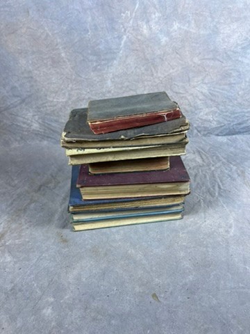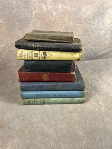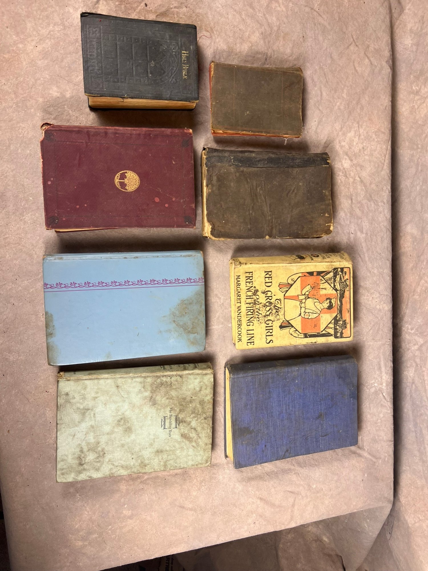 collection of eight old books, varying in topics and condition, pulled directly from attic