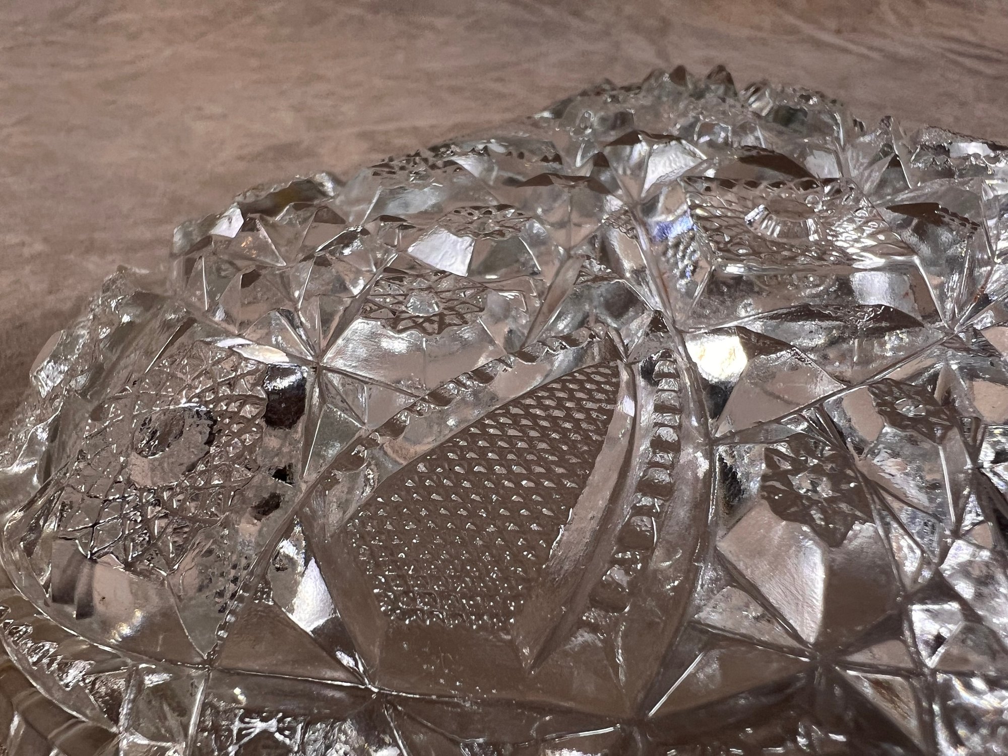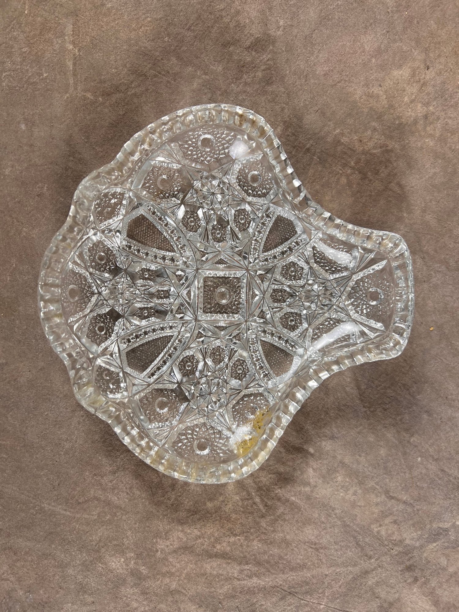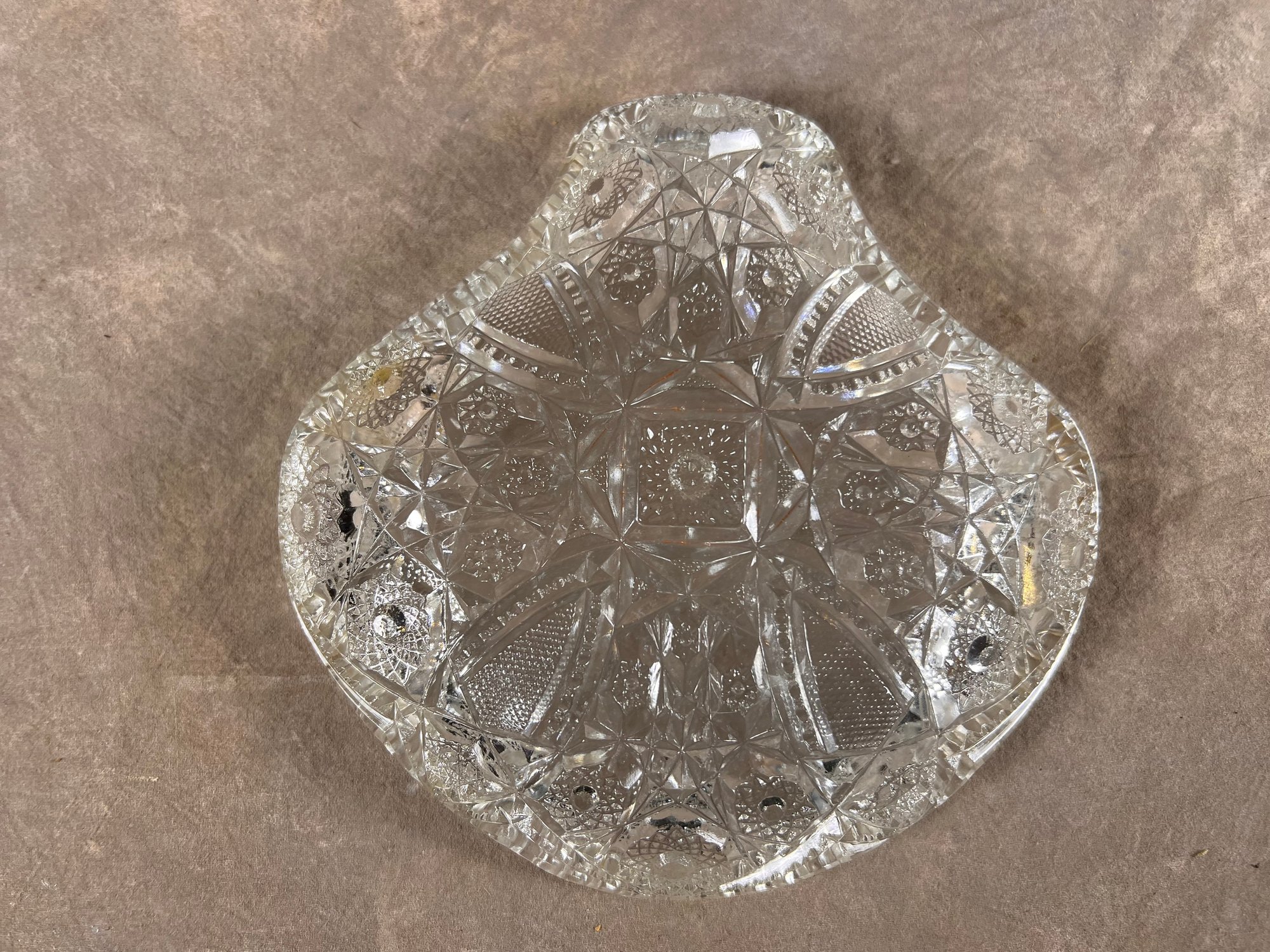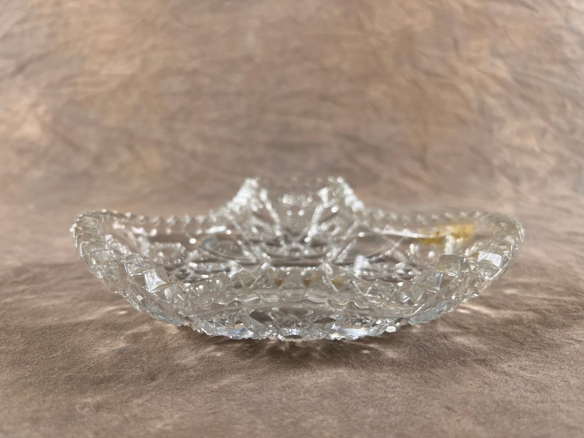 As seen in photos, measure 7 1/2 inches from left to right, wonderful small pressed glass dish