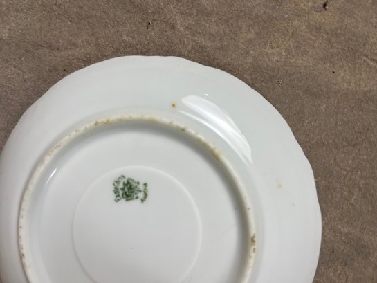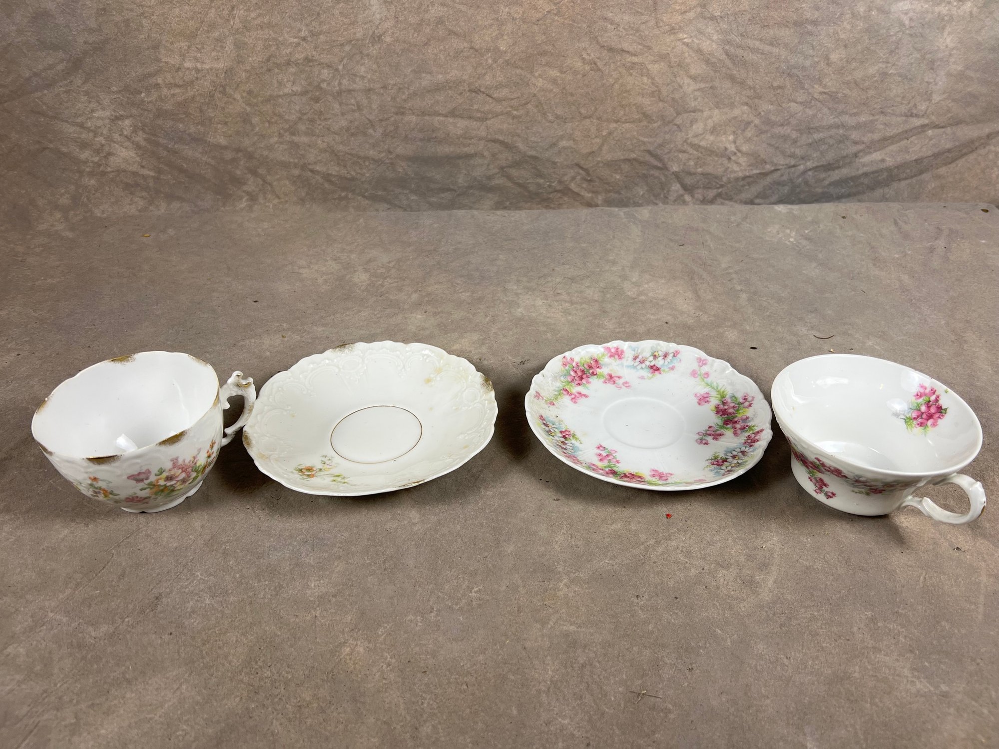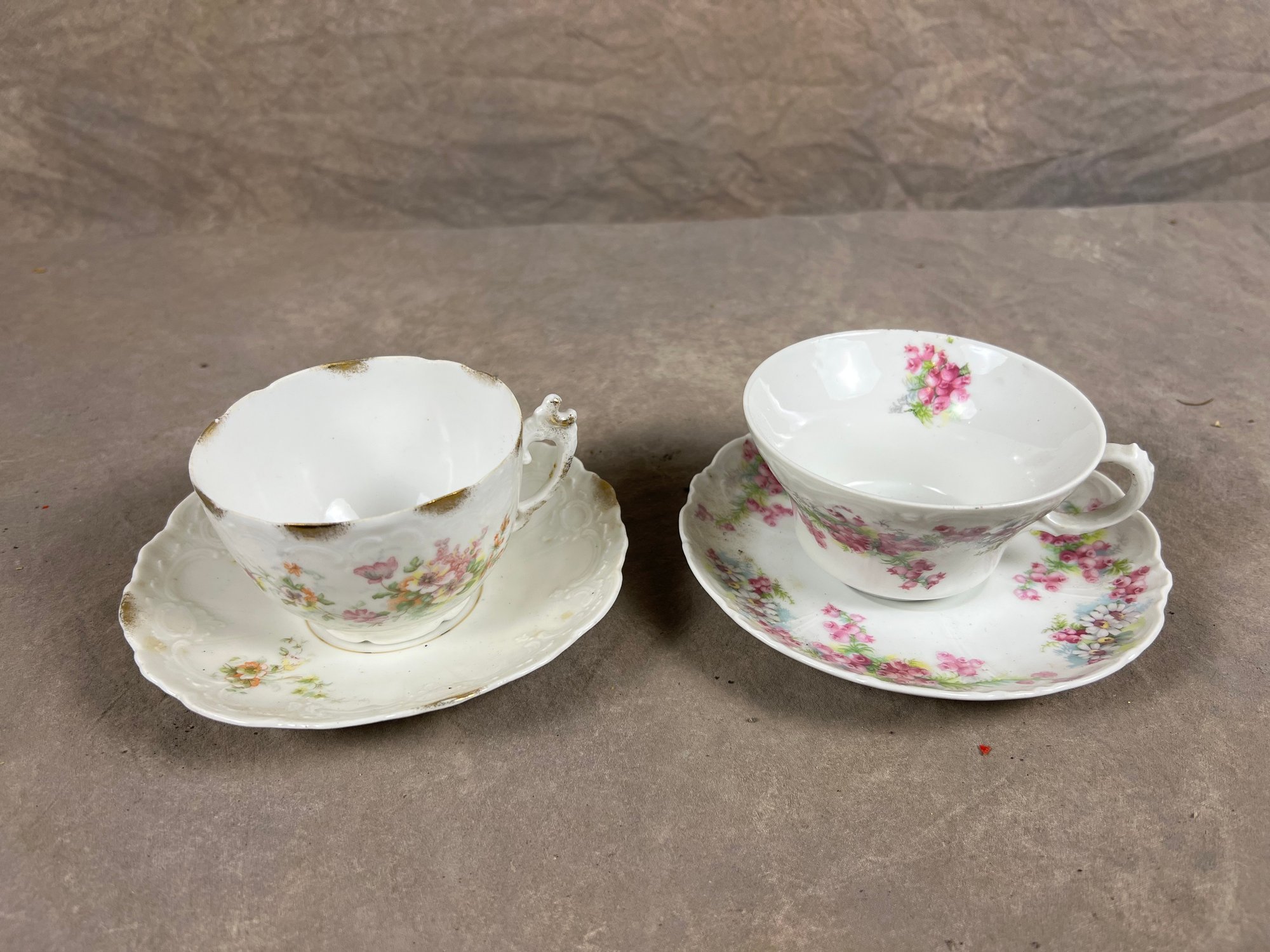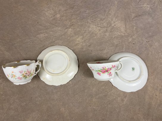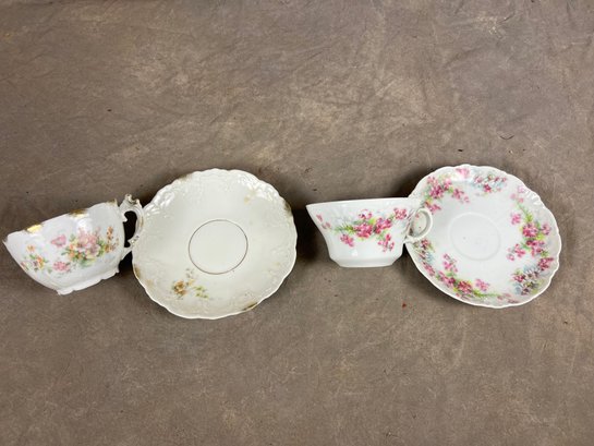 Duo Of Matching Teacups And Saucers With Floral Designs, darker pink set says "EagleChina"