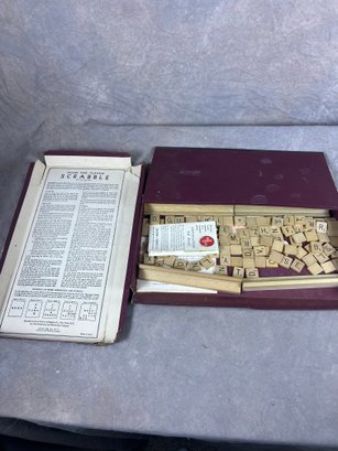 Old Scrabble Game With Pieces And Board, pieces in good condition, box is torn on edges